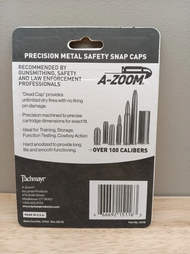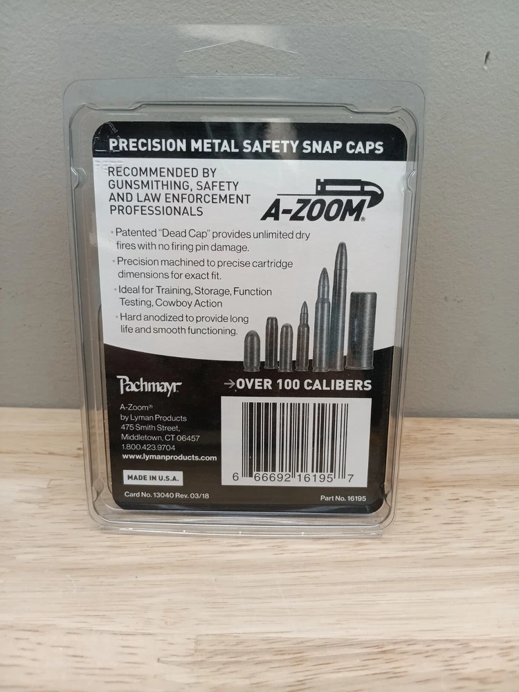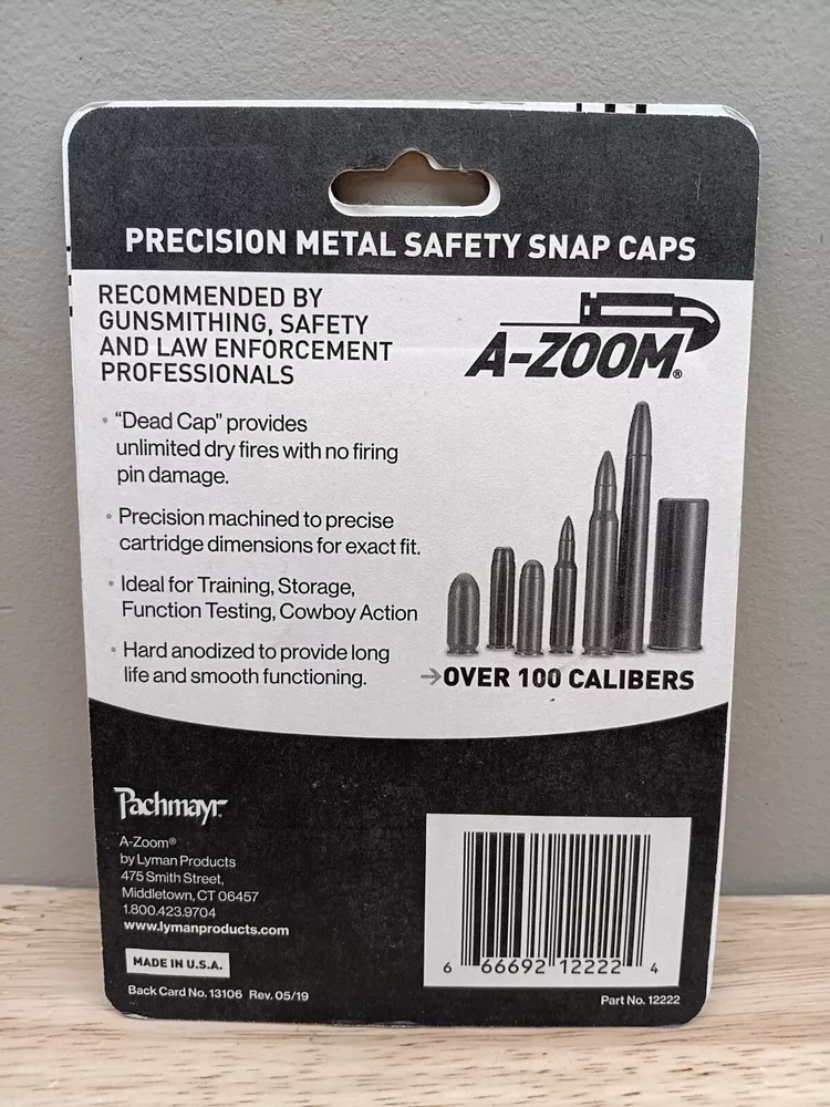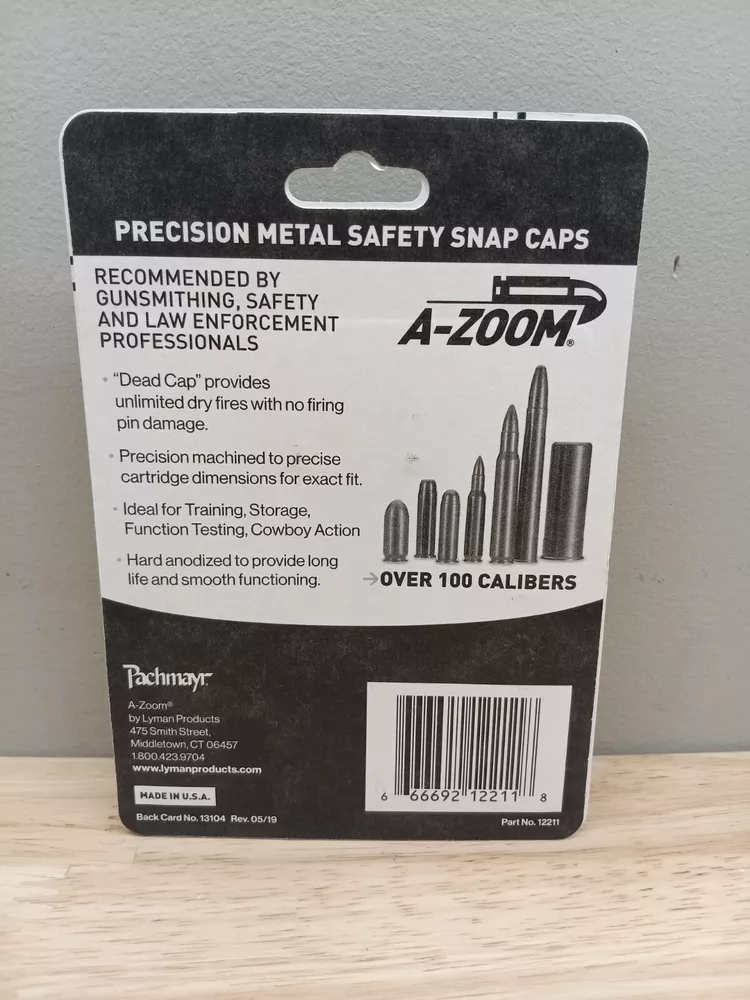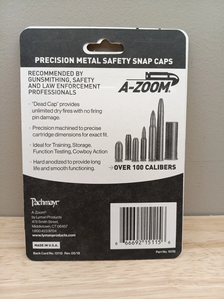 We are a pawnshop located in Crossville, TN. This is a variation listing. Choose the snap cap in the caliber you want. It will show you pictures of the specific one you chose. All snap caps are brand new in their original packaging. A-ZOOM ® For safety training, function testing or safely decocking without damaging the firing pin, A-Zoom training rounds are much more than conventional snap-caps. They are precision CNC machined from solid aluminum to precise cartridge dimensions, then hard anodized for ultra-smooth functioning and long life. Each round has A-Zoom's remarkably durable Dead Cap proven to withstand over three thousand dry fires while protecting the firing pin. A-Zoom Snap Caps last over 30 times longer than conventional plastic examples and are available in over 120 sizes from .22 Hornet to the .50BMG. From 9MM snap caps for your Luger pistol to A-Zoom Rifle Snap Caps - shop Lyman for our safe firing practice rounds.