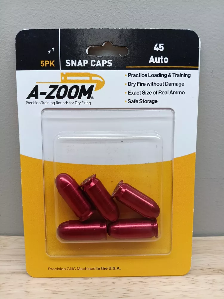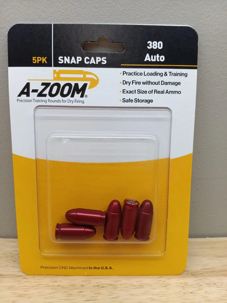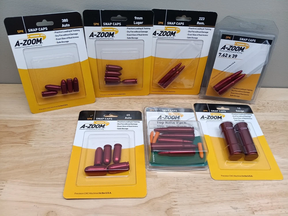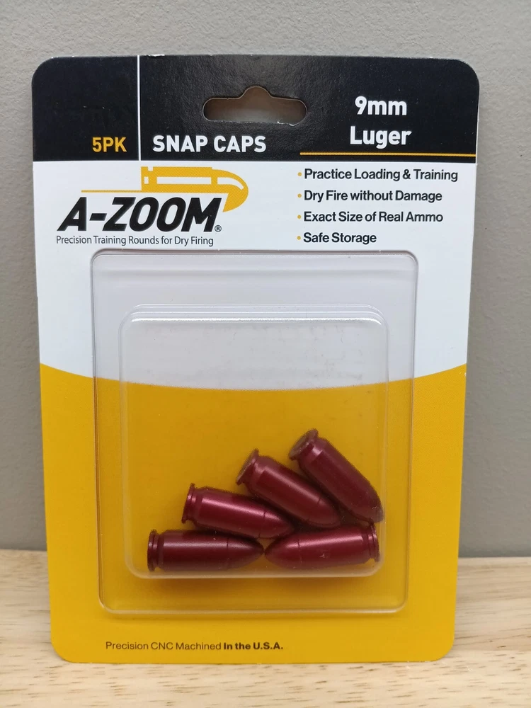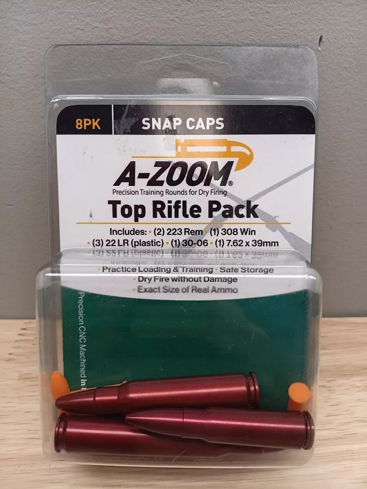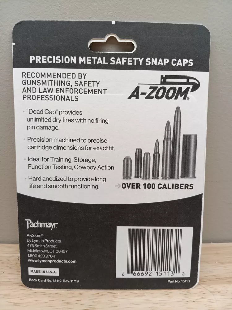 We are a pawnshop located in Crossville, TN. This is a variation listing. Choose the snap cap in the caliber you want. It will show you pictures of the specific one you chose. All snap caps are brand new in their original packaging. A-ZOOM ® For safety training, function testing or safely decocking without damaging the firing pin, A-Zoom training rounds are much more than conventional snap-caps. They are precision CNC machined from solid aluminum to precise cartridge dimensions, then hard anodized for ultra-smooth functioning and long life. Each round has A-Zoom's remarkably durable Dead Cap proven to withstand over three thousand dry fires while protecting the firing pin. A-Zoom Snap Caps last over 30 times longer than conventional plastic examples and are available in over 120 sizes from .22 Hornet to the .50BMG. From 9MM snap caps for your Luger pistol to A-Zoom Rifle Snap Caps - shop Lyman for our safe firing practice rounds.