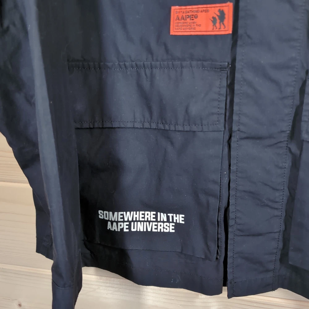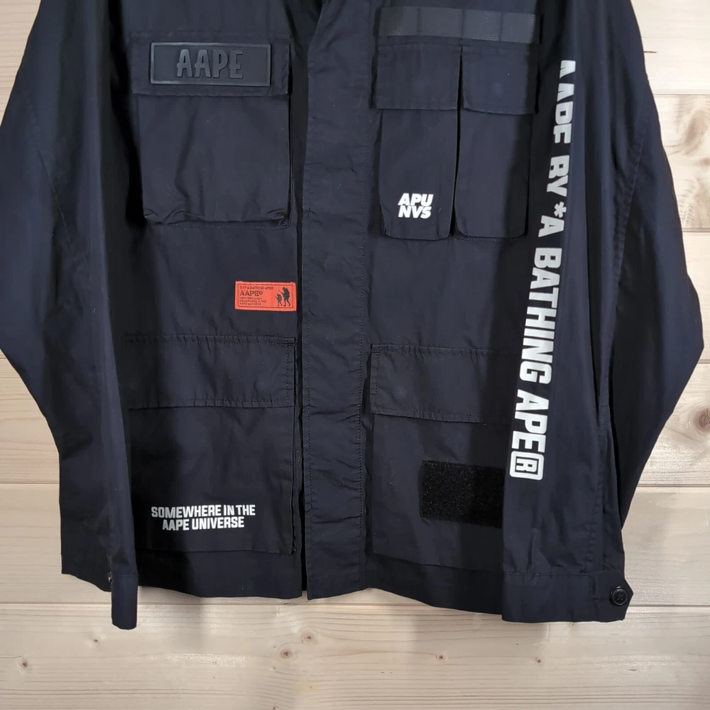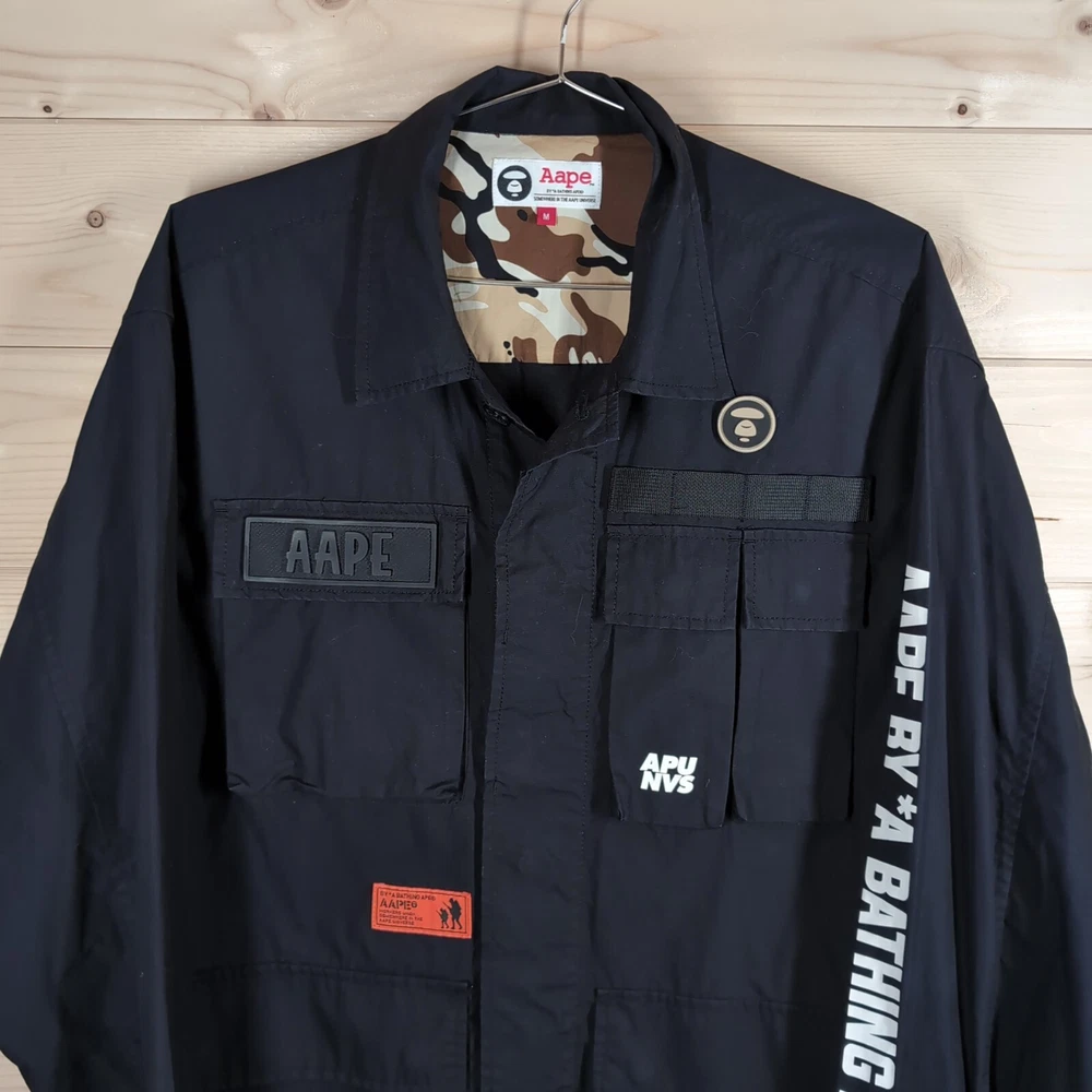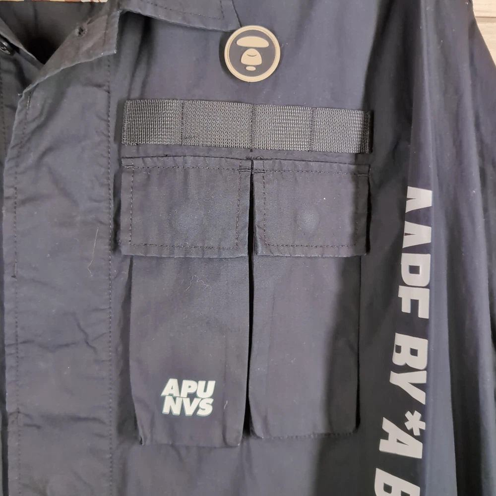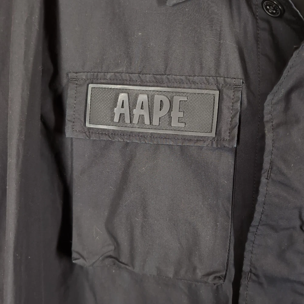 Aape By A Bathing Ape M65 Black Utility Military Shirt Jacket Overshirt Mens Size Large Pit to pit 23.5" | Length 28.5" In great preloved condition ------------------------------------------------------------------------------------------------------ For SS20, AAPE by A Bathing Ape looks to military garments for inspiration, creating cool pieces like this M65 jacket. Reworking the classic combat silhouette, it’s cut from sleek black cotton canvas and then detailed with a bevy of branding – think prints, woven tabs and insignia-style patches. 100% Cotton Button Closure 3 Chest Pockets 2 Front Pockets Printed Branding Woven Brand Patch & Tab Style Code: AAPSTM8341XXE-BKX