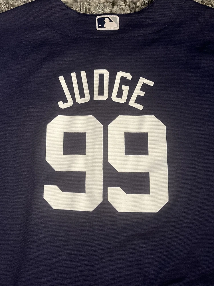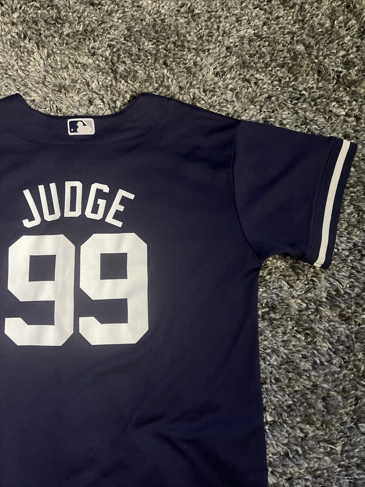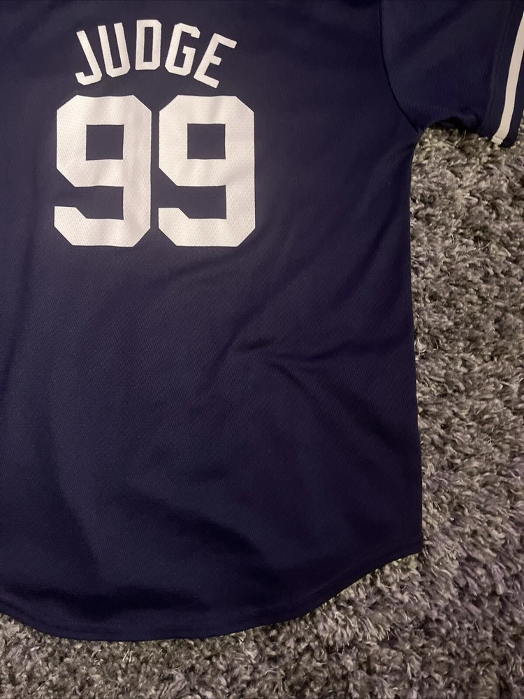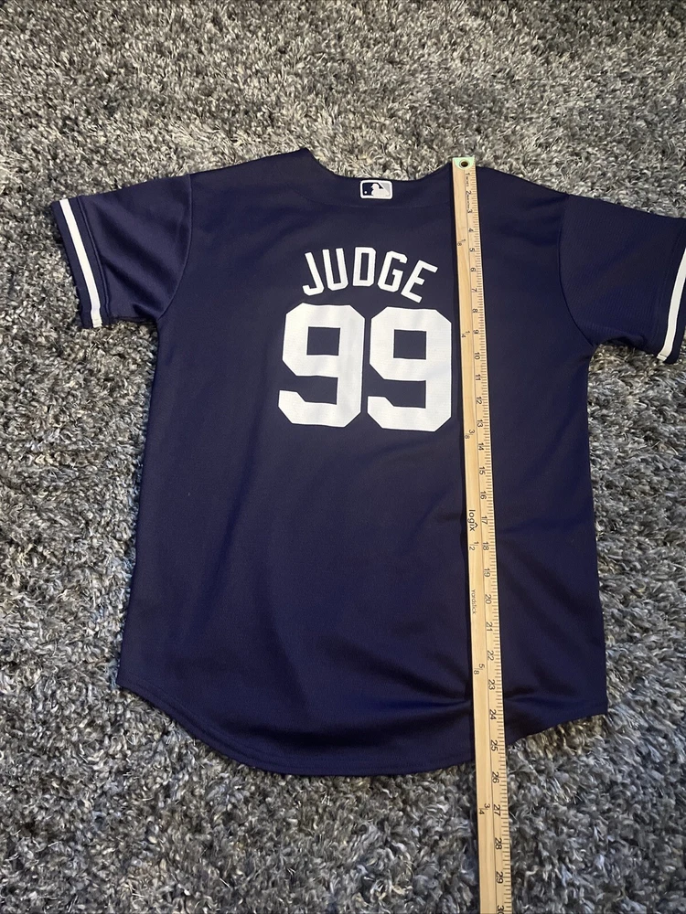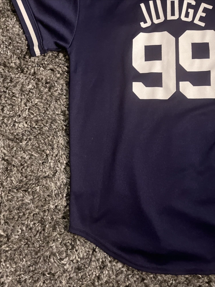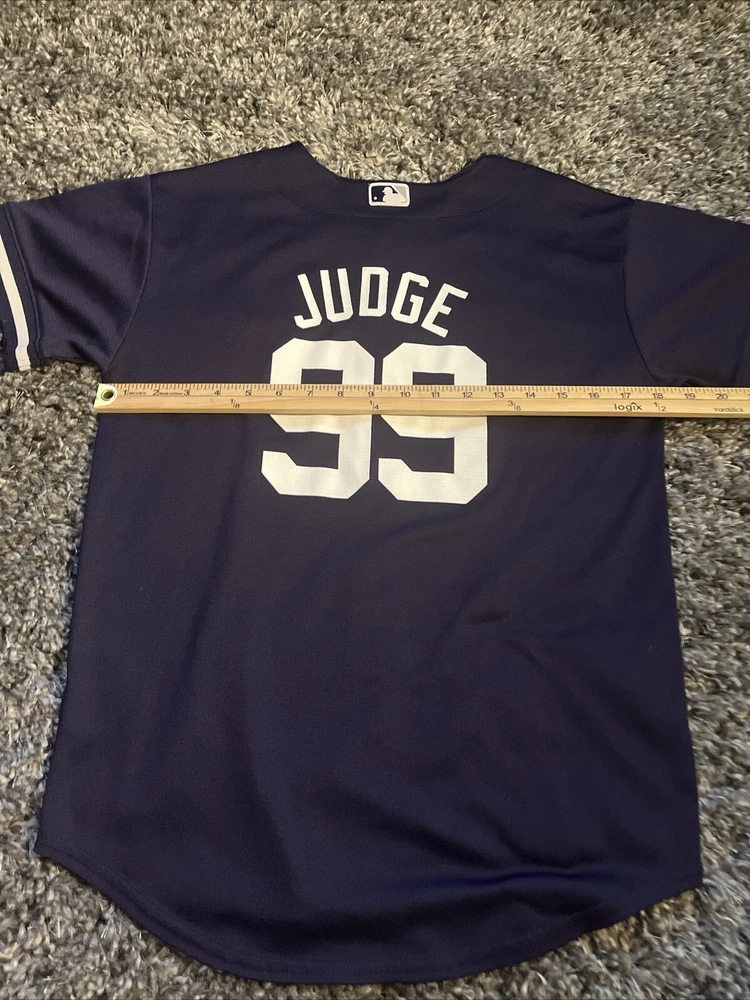 Show your love for the New York Yankees and Aaron Judge with this officially licensed Majestic button-down jersey. The blue jersey features Judge's number 99 and is perfect for any young fan in size L 14/16. Made in Cambodia, this unisex children's jersey is perfect for baseball enthusiasts who want to represent their favorite team during regular season games. Get ready to cheer on the Yankees and Aaron Judge with this stylish and comfortable jersey.