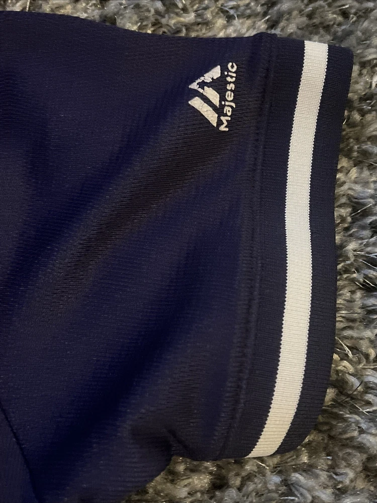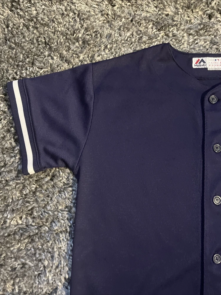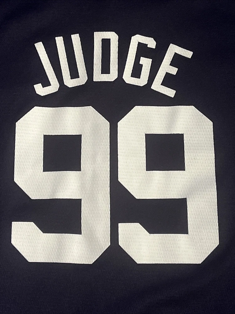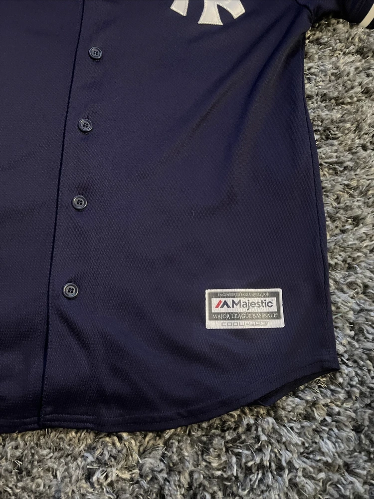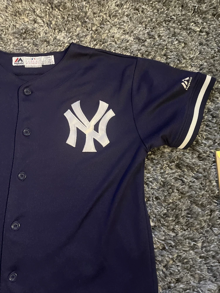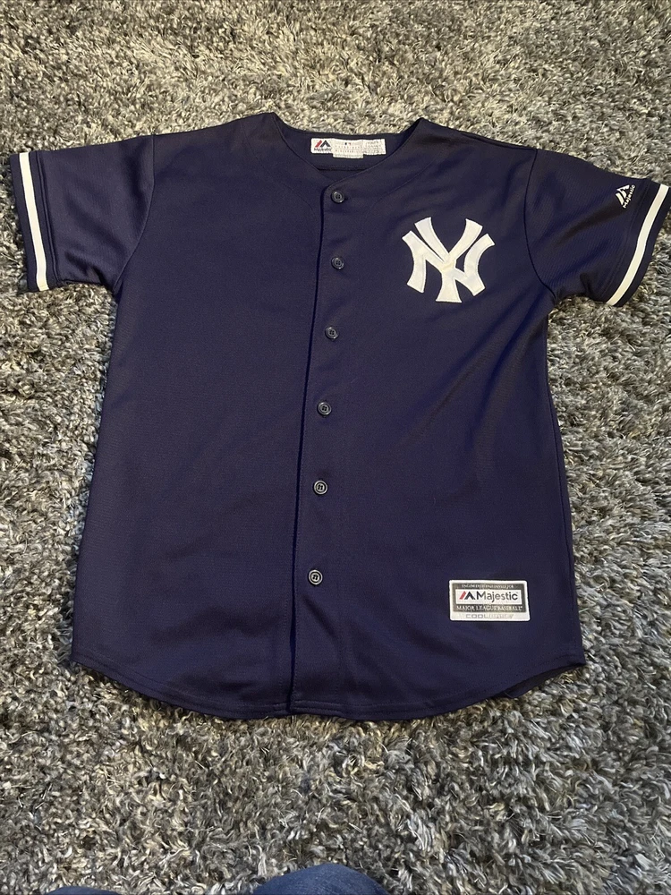 Show your love for the New York Yankees and Aaron Judge with this officially licensed Majestic button-down jersey. The blue jersey features Judge's number 99 and is perfect for any young fan in size L 14/16. Made in Cambodia, this unisex children's jersey is perfect for baseball enthusiasts who want to represent their favorite team during regular season games. Get ready to cheer on the Yankees and Aaron Judge with this stylish and comfortable jersey.