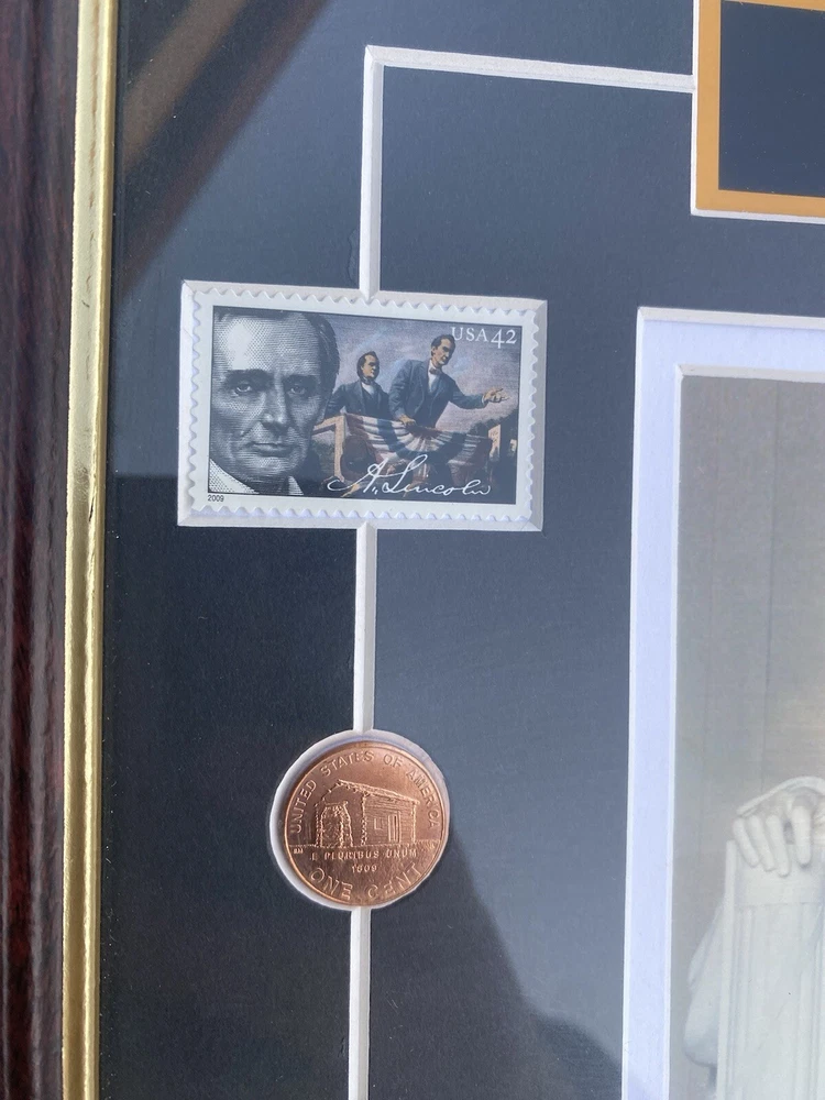 This Abraham Lincoln Coin 5 dollars Currency and Stamp Commemorative Collection is a must-have for any coin collector or history enthusiast. Made in the United States, this collection features a unique combination of coins, currency, and stamps, all highlighting the iconic figure of Abraham Lincoln. The collection is perfect for those interested in US history and culture, and would make a great addition to any collection or as a gift for a fellow collector. Don't miss out on this opportunity to own a piece of history. In a frame under the glass