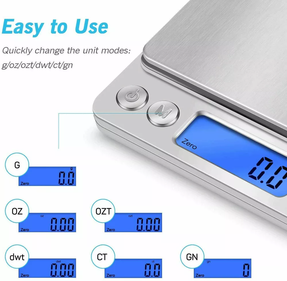 YOU MAY ALSO LIKE 0.01g-200/2000g Digital Balance Jewelry Gold Food Kitchen Weight LCD Gram Scale 5.99 USD Free shipping Balance Weight Pocket 0.01g - 200g Jewelry Diamond Scale Easy to Carry Accurate 5.99 USD Free shipping Jewelry Diamond Scale Balance Weight Pocket Accurate 0.01g - 200g Easy to Carry 5.99 USD Free shipping Features: 1.Wild LCD screen display with background light,easy to read. 2.High precision strain gauge sensor 3.Stainless steel platform 4.Tare function 5.Low battery&overload indicator 6.Pocket scale,mini size,easy to carry and store Specifications: 1.Capacity:0.05g-2000g 2.Accuracy:0.01g 3.Unit switch:g/ct/oz/gn/ozt/dwt 4.Power supply:2*AAA( battery is included ) 5.Background light color:blue 6.Display:LCD 7.Color:black/silver 8.LCD screen size:44.0*18.0*1.1mm 9.Weighing platform size:10*10 cm 10.Item dimension:12.5*10.5*1.8cm 11.N.W:175g Operation instruction : Please put the scale on flat table 1:Press [ON/OFF] to switch on 2:You can press"M" to unit conversion when 0.0 or 0.00 show on the LCD 3:Put the goods on the scales after using conversion Attention: 1:Do not operate beside the computer or someplace with high radiation, do not have wind. 2:Remember to take off the battery when you do not use it for a long time, do not store in humid environment 3:Need to be cleaned when the scale body have stains, wiping with dry towel is okay. 4:Pay attention to the waterproof Package includes: 1XDigital scale 1 XBig tray 1XEnglish manual 2X AAA Battery