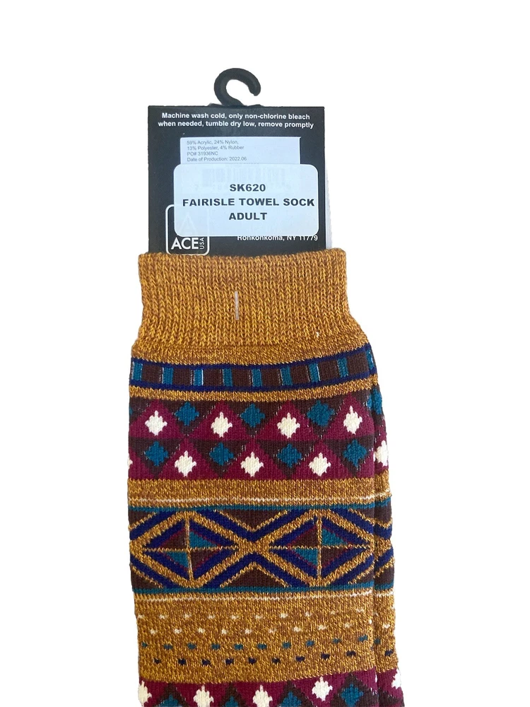 Get ready for your next outdoor adventure with these Ace USA Fairisle Ski Socks/ Blanket Socks. Made for both men and women, these socks are perfect for skiing, sitting by the fire, or just making a statement! The multicolor design features beautiful jewel tones, adding a touch of style to your outdoor attire. These socks are designed to keep your feet warm and comfortable during your outdoor activities. The size L fits most people's feet, making it a versatile option for any adventure. Don't let the cold weather keep you inside, these Ace USA socks are perfect for any outdoor activity.