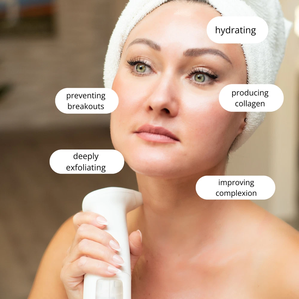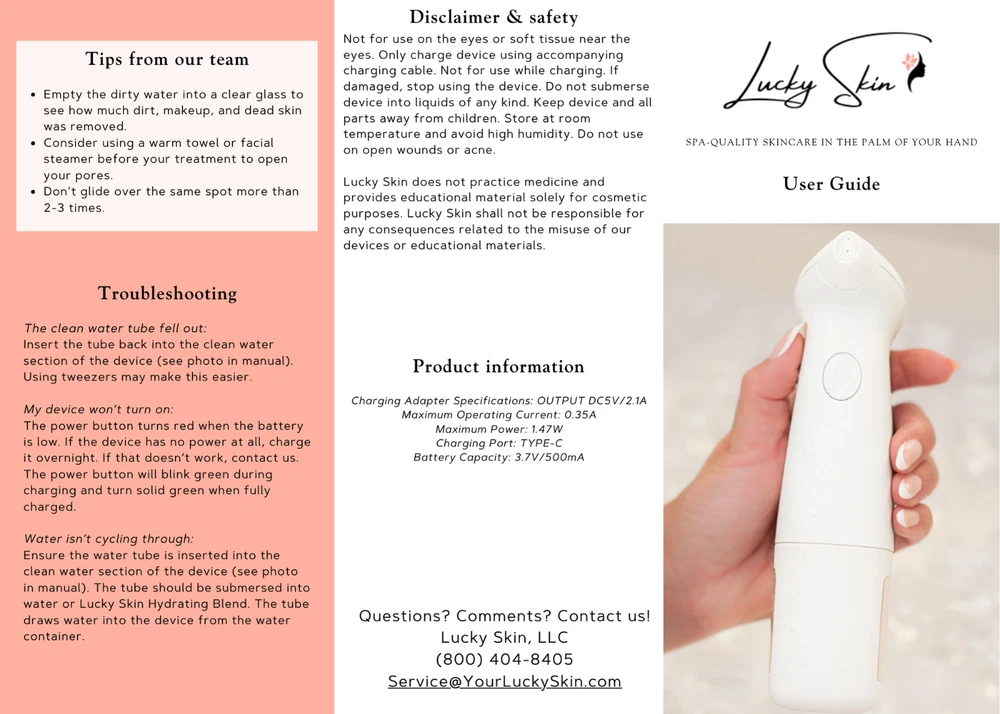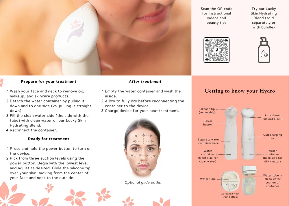 The Lucky Skin Hydro device has been designed to give you professional-grade results in the comfort of your own home. The hydro dermabrasion technology gently removes dead skin cells while infusing hydrating solution or water to reveal brighter-looking skin that's soft to the touch. Benefits Natural, at-home facial treatment Visible results in just one treatment Deeply cleans pores by removing blackheads and whiteheads Removes dead skin cells for perfect makeup application Reduces the appearance of fine lines and wrinkles Improves dark spots for more even skin tone Promotes collagen Spa-quality care from the comfort of home Skincare Concerns Dull or uneven skin tones Hyperpigmentation Fine lines and wrinkles Enlarged pores Acne and acne scarring
