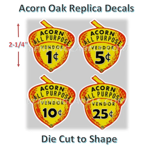 Acorn Vending Oak Northwestern Candy Gumball Machine Price Decals Replicas that are bright and vibrant size is 2" wide and 2,25" tall die cut to shape price is each