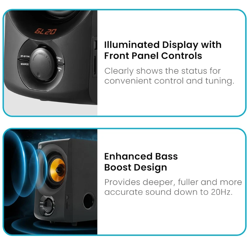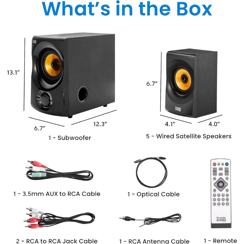 Acoustic Audio AA5170 5.1 Bluetooth Home Theater Speaker System Acoustic Audio AA5170 5.1 Bluetooth Home Theater Speaker System with Powered Subwoofer - 700W Brand: Acoustic Audio by Goldwood | Model: AA5170 | Power Output: 700 Watts Product Overview The Acoustic Audio AA5170 5.1 Bluetooth Home Theater Speaker System is designed to deliver exceptional audio quality for your home entertainment setup. With a powerful 700W output, this system features Bluetooth connectivity, a powered subwoofer, and a Pro Surround function for immersive sound. Enjoy seamless connectivity and high-quality sound for movies, music, gaming, and more. Key Features Bluetooth 5.1 Connectivity: Stream music directly from your phone or other Bluetooth-enabled devices. Pro Surround Function: Converts stereo sound into rich 5.1 surround sound for a cinematic audio experience. Multiple Input Options: Includes RCA, Digital/Optical, AUX inputs, USB drive, and SD card slots for versatile connectivity. High-Quality Audio: Powered subwoofer and 5 wired satellite speakers deliver deep bass and clear sound. Easy Plug and Play Setup: Simple to connect to any TV, gaming console, PC, or audio device with standard inputs. Full Function Remote: Convenient control over your system from anywhere in the room. FM Tuner: Listen to your favorite FM radio stations with the built-in FM tuner. System Specifications Feature Details Power Output 700 Watts Speaker Type 5 Satellite Speakers + 1 Powered Subwoofer Subwoofer Size 12.3" x 6.7" x 13.1" Satellite Speakers Size 6.7" x 4.1" x 4" each Frequency Response 20Hz - 20kHz Connectivity Bluetooth, RCA, AUX, Digital/Optical, USB, SD Card Compatibility TV, Laptop, PC, MP3, Gaming Consoles, Smartphones, Tablets Input Voltage 110V Dimensions (Subwoofer) 12.3" x 6.7" x 13.1" Dimensions (Satellite Speakers) 6.7" x 4.1" x 4" Weight 20 Pounds What’s Included 1 Powered Subwoofer Speaker 5 Passive Wired Satellite Speakers Full Function Remote Control Digital/Optical Cable RCA to RCA Cable RCA Antenna Cable 3.5mm to RCA Cable Instruction Manual System Requirements Standard 110V US Grounded Wall Plug Compatible with devices featuring 3.5mm headphone jack, Digital/Optical, RCA Stereo, or 6 Channel RCA Outputs. Compatible with TVs, home entertainment systems, laptops, PCs, DVD players, MP3 players, and gaming consoles. Why Choose the Acoustic Audio AA5170? Powerful 700W output for superior sound quality. Bluetooth capability for easy wireless streaming. Comprehensive compatibility with a wide range of devices. Pro Surround function for immersive 5.1 sound from any stereo source. Convenient remote control for easy operation. Built-in FM tuner for added functionality. Images Product Images: Conclusion Upgrade your home theater system with the Acoustic Audio AA5170 5.1 Bluetooth Speaker System. Featuring a powerful 700W output, easy connectivity, and immersive surround sound, this system is perfect for movies, music, gaming, and more. With a built-in FM tuner and Bluetooth streaming, it offers exceptional versatility. Enhance your entertainment experience today!