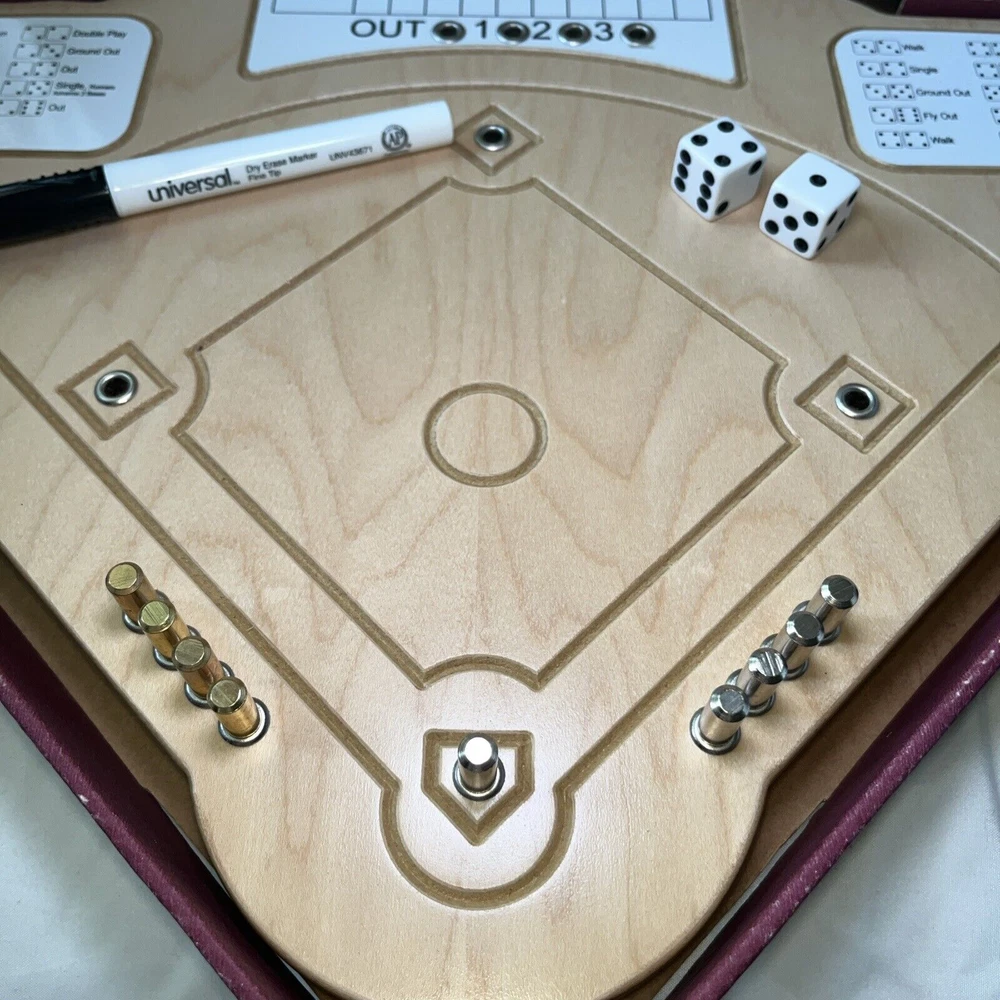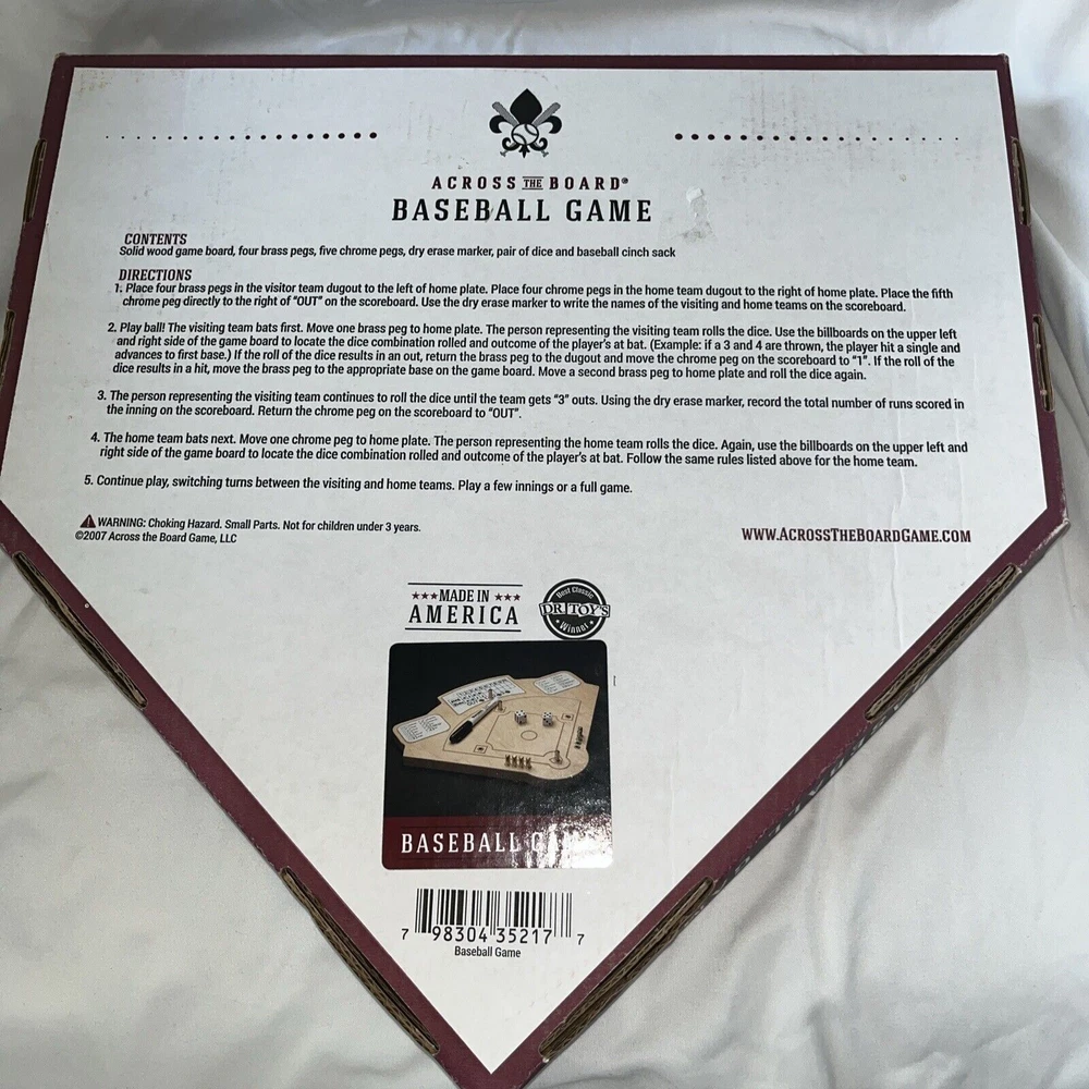 This handcrafted wooden board game sold by Uncommon Goods is a timeless heirloom that will provide hours of entertainment for 2 or more players. The game is themed around baseball and features Across the Board brand components. It was awarded the Best Classic Dr. Toys Winner in 2007 and is suitable for players aged 8 and up. The game board is made in the United States and is perfect for boys, girls, and anyone who loves a good game of strategy and skill. Excellent, preowned condition. Complete game.