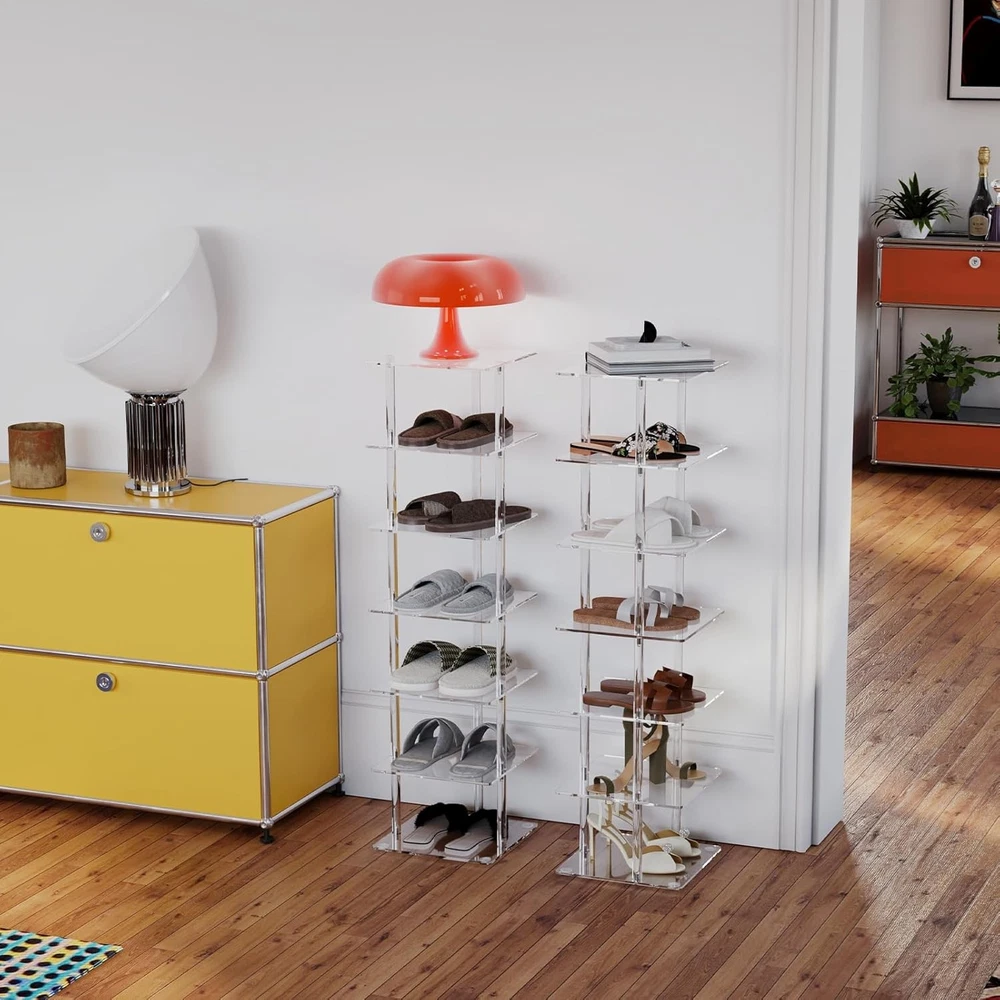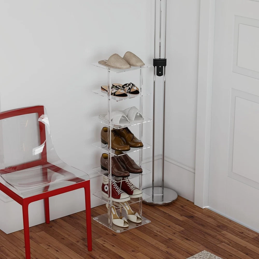 This acrylic shoe rack is a game-changer for small spaces! The sleek, ultra-clear design looks modern while keeping shoes neatly organized. I love how sturdy yet lightweight it is—no wobbling even when fully loaded. The seven tiers fit all my frequently worn shoes perfectly and the vertical design saves so much floor space. It's surprisingly durable for acrylic and wipes clean easily. Perfect for making a cluttered entryway look instantly tidy!