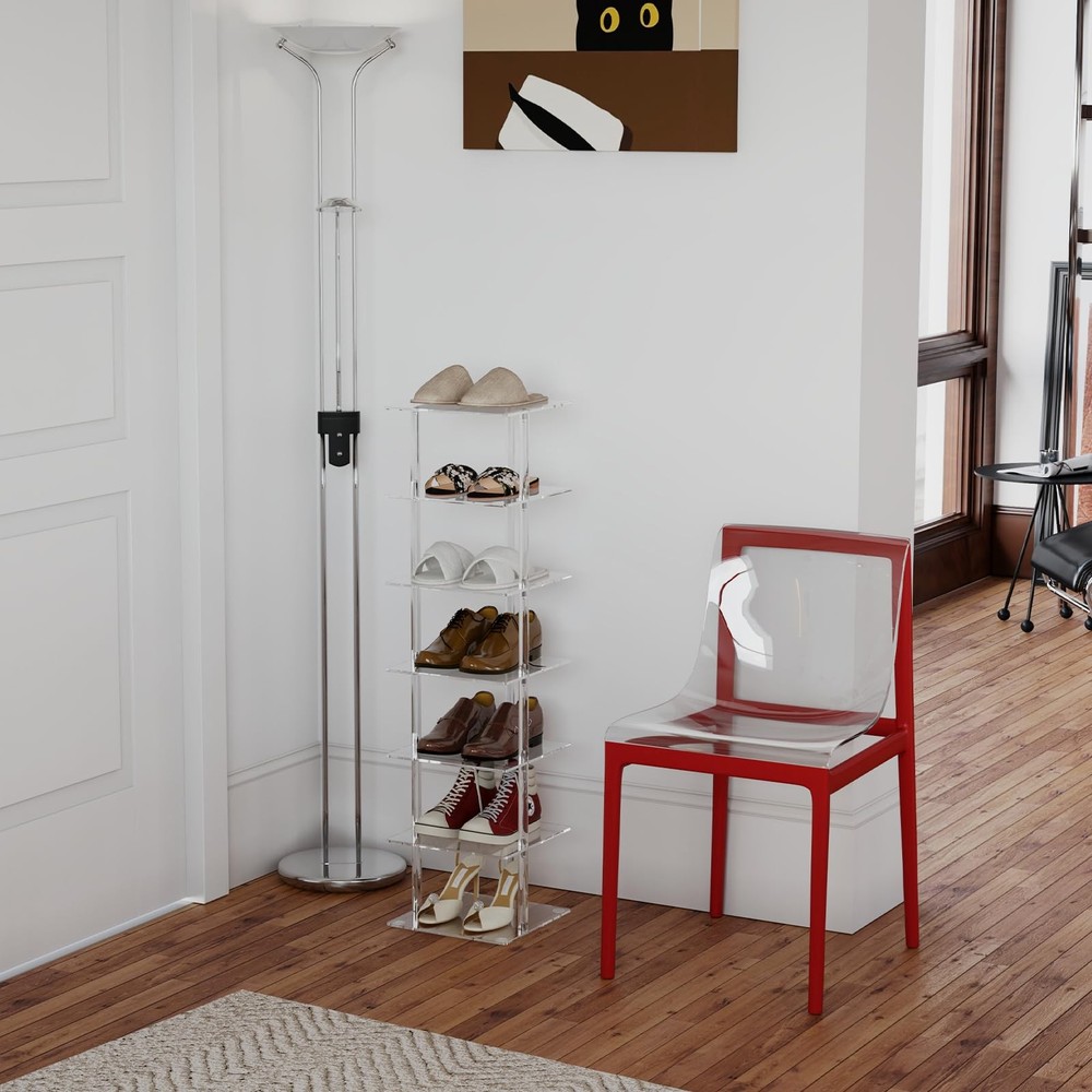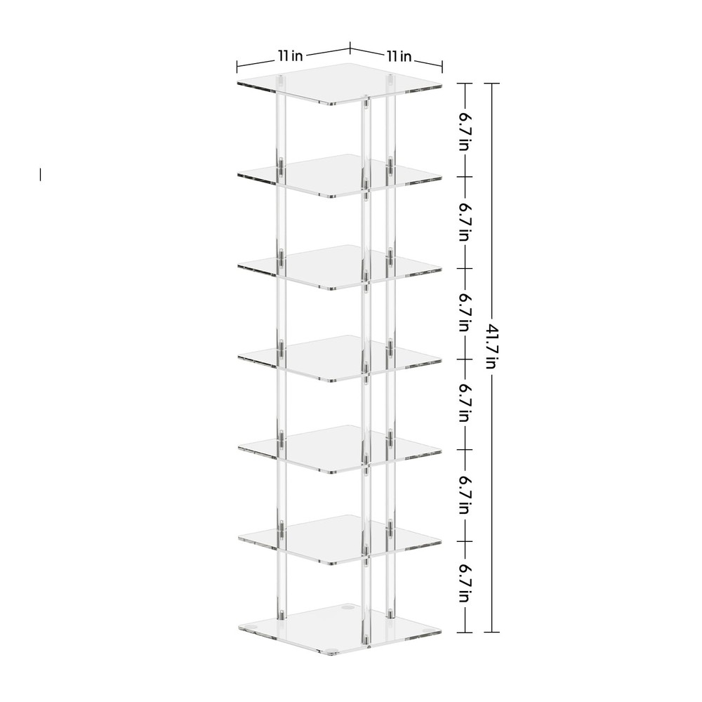 Acrylic 7 Tier Vertical Shoe Rack - 11'' L x 11'' W x 41.7'' H Modern Minimal Style - Made of high-quality acrylic, with up to 92% transparency, sturdy, durable, smooth, and moisture-resistant, this shoe organizer is designed to withstand daily use while adding a touch of elegance to your home and complementing any decor. Ideal for Narrow Spaces - Only 11 inches wide and 41.7 inches high. Maximize floor space with our vertical free standing shoe rack perfect for organizing your footwear in entryways, closets, and bedrooms. Its compact design fits effortlessly into any corner, offering an efficient shoe storage solution. Open Storage Design - The 7-tier shoe tower provides ample storage space for shoes in an organized way to make shoes clear at a glance, and easy to access. It fits most shoes such as sneakers, slippers, boots, flats, ankle boots, and heels. Versatile & Stylish - Freely combined and stored, the tiny design is easily into your walk-in closet, cloakroom, or wardrobe, this narrow shoe rack offers a clear, acrylic finish that blends with both modern and traditional interiors, ensures it can be placed anywhere you need extra shoe storage. Quick Assembly - Assembly is a breeze, all the assembly parts are marked in detail in the instructions, follow the easy instructions to set up your entryway shoe rack in minutes, saving time and effort.