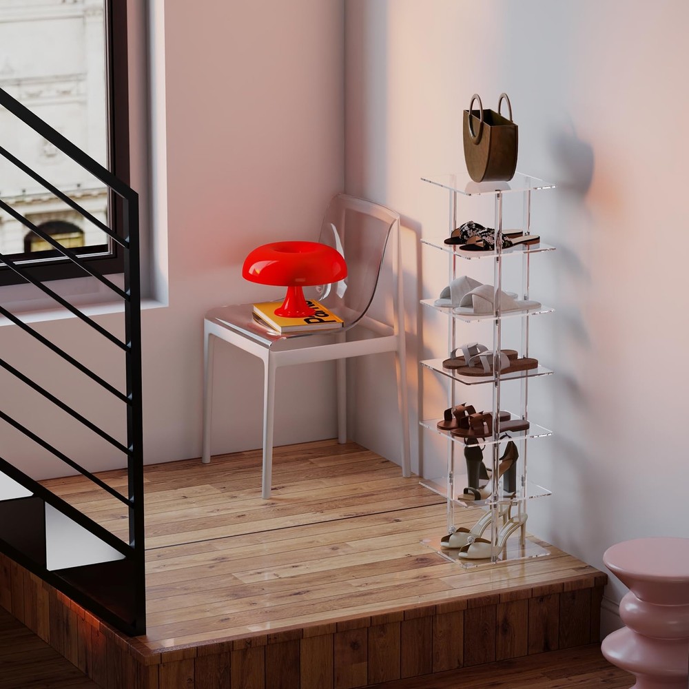 This acrylic shoe rack is a game-changer! The sleek, modern design fits perfectly in tight spaces while holding up to 14 pairs. The crystal-clear acrylic looks so elegant—it keeps my shoes visible yet organized. Sturdy enough for daily use but lightweight enough to move around. No more messy piles by the door—just a clean, stylish way to display my favorite kicks! Love how it maximizes vertical space without cluttering the room.