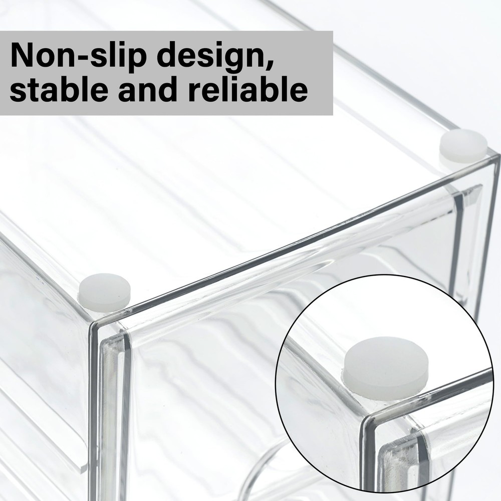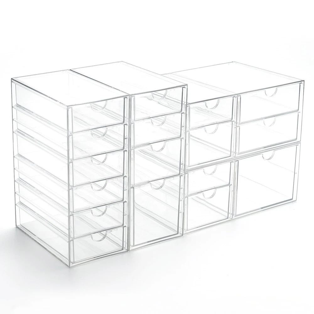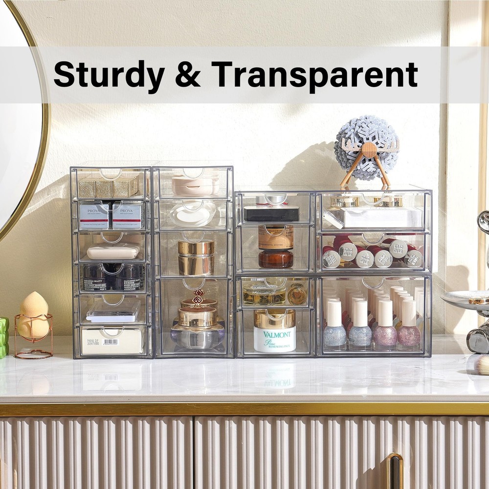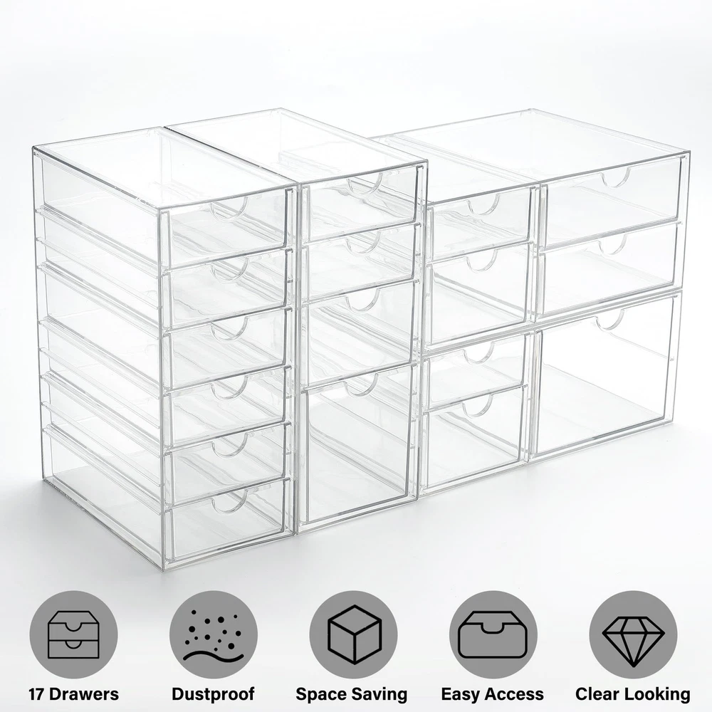 Multi-Purpose Organization: Our acrylic drawer organizers are designed to help you organize dresser, office, and bathroom. Desk organizer with drawers are versatile enough to serve as storage solutions for Cosmetics (lipstick, blush, foundation), Office supplies (pen, paper clip, pencil), Handicrafts (various beads, Lego) and art supplies (tape, washi tape, glue), Personal accessories - sunglasses, hair accessories (hair clips, hair ties, alligator clips), jewelry, souvenirs. Stackable and Space Saving: These plastic drawer organizers are stackable, allowing for flexible combinations to suit different occasions. Using multiple sets together or separately makes organizing your space effortless. A well-organized drawer saves time in finding items and keeps your room tidy. Unique Design: The clear design of makeup storage allows for easy identification of contents. Made from durable, unbreakable plastic, they are equipped with silicone anti-slip pads on the bottom to prevent movement when the drawer organizer storage is opened or closed, ensuring a steady and reliable storage solution. Dustproof and Waterproof: This clear acrylic storage drawer is both dustproof and waterproof, protecting the contents from dust and moisture. The sturdy, transparent, and stylish design complements any room decor. Multiple Sizes and Expandable: This set includes 4 individual acrylic drawer units, offering a total of 17 drawers. These clear drawer organizers provide customizable combinations to meet your specific storage and organizational needs. Each acrylic drawer units is 4.2x6.89x9.92 inches. The office supply organizer can be stacked vertically or expanded horizontally, allowing integration with other sizes and dimensions of storage solutions available in our store.