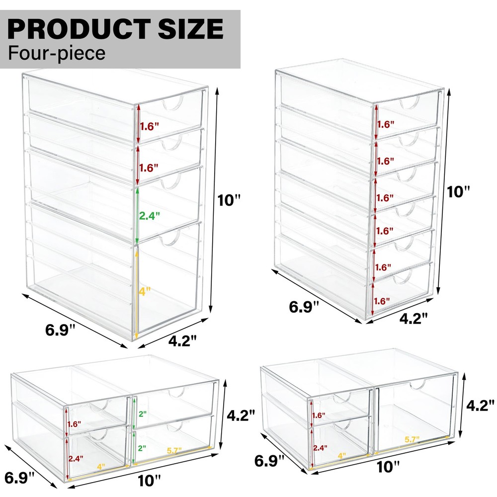 Multi-Purpose Organization: Our acrylic drawer organizers are designed to help you organize dresser, office, and bathroom. Desk organizer with drawers are versatile enough to serve as storage solutions for Cosmetics (lipstick, blush, foundation), Office supplies (pen, paper clip, pencil), Handicrafts (various beads, Lego) and art supplies (tape, washi tape, glue), Personal accessories - sunglasses, hair accessories (hair clips, hair ties, alligator clips), jewelry, souvenirs. Stackable and Space Saving: These plastic drawer organizers are stackable, allowing for flexible combinations to suit different occasions. Using multiple sets together or separately makes organizing your space effortless. A well-organized drawer saves time in finding items and keeps your room tidy. Unique Design: The clear design of makeup storage allows for easy identification of contents. Made from durable, unbreakable plastic, they are equipped with silicone anti-slip pads on the bottom to prevent movement when the drawer organizer storage is opened or closed, ensuring a steady and reliable storage solution. Dustproof and Waterproof: This clear acrylic storage drawer is both dustproof and waterproof, protecting the contents from dust and moisture. The sturdy, transparent, and stylish design complements any room decor. Multiple Sizes and Expandable: This set includes 4 individual acrylic drawer units, offering a total of 17 drawers. These clear drawer organizers provide customizable combinations to meet your specific storage and organizational needs. Each acrylic drawer units is 4.2x6.89x9.92 inches. The office supply organizer can be stacked vertically or expanded horizontally, allowing integration with other sizes and dimensions of storage solutions available in our store.