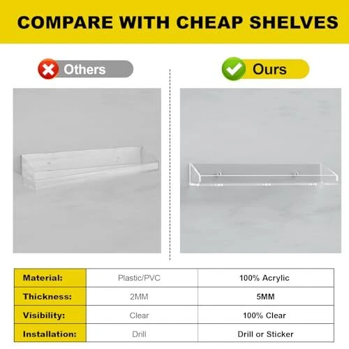 Return Policy Fast Delivery Trusted seller Acrylic Floating Shelves 2 PCS, 15" Acrylic Shelves for Wall, Waterproof Acrylic Shower Shelves for Bathroom, Kids Bookshelf for Display,Wall Mounted for Bedroom, Living Room,Kitchen Product Description 【Space Saving】acrylic shelves for wall provide multi-layer storage, allowing you to utilize wall space more efficiently. You can conveniently store everything while keeping your room organized. It's a great space-saving wall organizer. 【Unique Decoration】 Invisible display shelves for bedroom, living room, bathroom, kitchen can not only display your items, but also add decor to your room. Everything looks clear on the acrylic wall shelf with high transparency. You can find your item quickly. 【Sturdy Acrylic Floating Shelf】Made of thick acrylic, sturdy and durable, when you use adhesive to install the acrylic floating shelf, it can withstand up to 8.8 pounds, when you use screws to install it, it can withstand up to 30 pounds, not easy to break. All edges are carefully polished to ensure safety and smoothness. The edges on the front can prevent the decorations from falling off. 【2 Easy Ways to Install】 Clear wall shelves have pre-drilled holes, detailed instructions and all necessary mounting hardware “screws, wall anchors, plastic spacers”, which makes installation simple and easy in a few minutes. 【Value for Money】 acrylic floating shelves are a great addition to any space and a set can meet all the space needs of the home. Let's decorate your home together and your kids will love it too. Shipping Returns Payment Shipping Shipping is FREE to all addresses other than APO/PO boxes in the lower 48 states. All our stock ships from US-based warehouses. Shipped via USPS or UPS (depending on location and package weight) Unless stated otherwise, all orders will ship within 24-72 hours of your payment being processed. Check our feedback to see the great reviews of FAST shipping we offer. Returns Seller does not accept returns Payment We currently accept payment via eBay managed payments only. Once payment is cleared, we will dispatch your shipment within 1-3 business days. Please refer to the "Shipping" tab for more information regarding shipping speed to your destination.