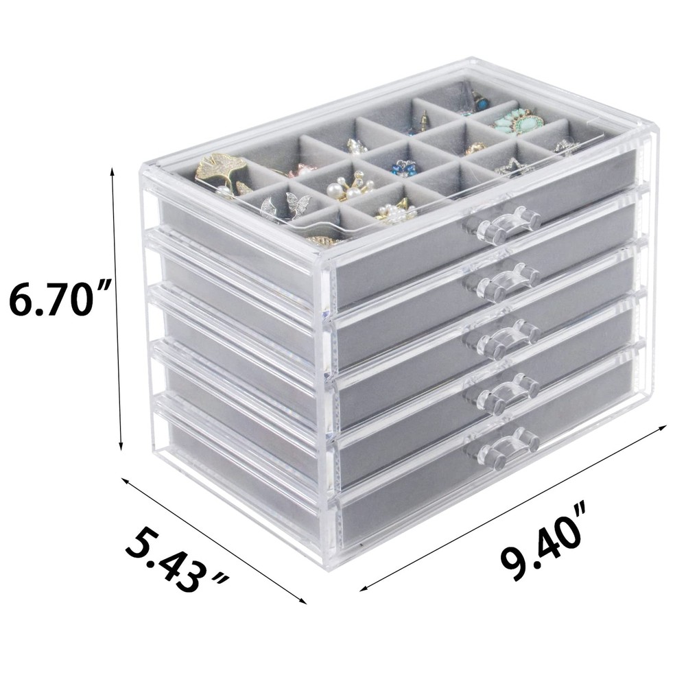 STACKABLE JEWELRY BOX: Acrylic jewelry organizer with 5 removable drawers, it's slide out smoothly and handles are easy to grip, you can rearrange the drawers and trays according to your need CUSTOMIZE VELVET TRAY: The velvet tray can be separated from the drawer and use as drawer inserted. Also, you can flexibly adjust the dividers of the tray to jewelry of various sizes EXTRA LARGE CAPACITY: 5 velvet trays of various sizes for storing different jewelries, this earring storage box has 15 small slots in each of the first 3 drawers, 6 medium compartments in the fourth drawer, and 2 larger compartments in the last drawer ACRYLIC AND VELVET MATERIAL: The clear acrylic outward keeps your favorite jewelry dust-free and makes you see what is inside on the top. And the fully lined interior to make it a stylish look and provide your jewelry better protection AWESOME GIFT FOR WOMEN: Gorgeous clear jewelry box organizer keeps clutter away on the vanity, dresser and makes a beautiful display. If you are troubled about gifts, this jewelry box is the first choice for your lover