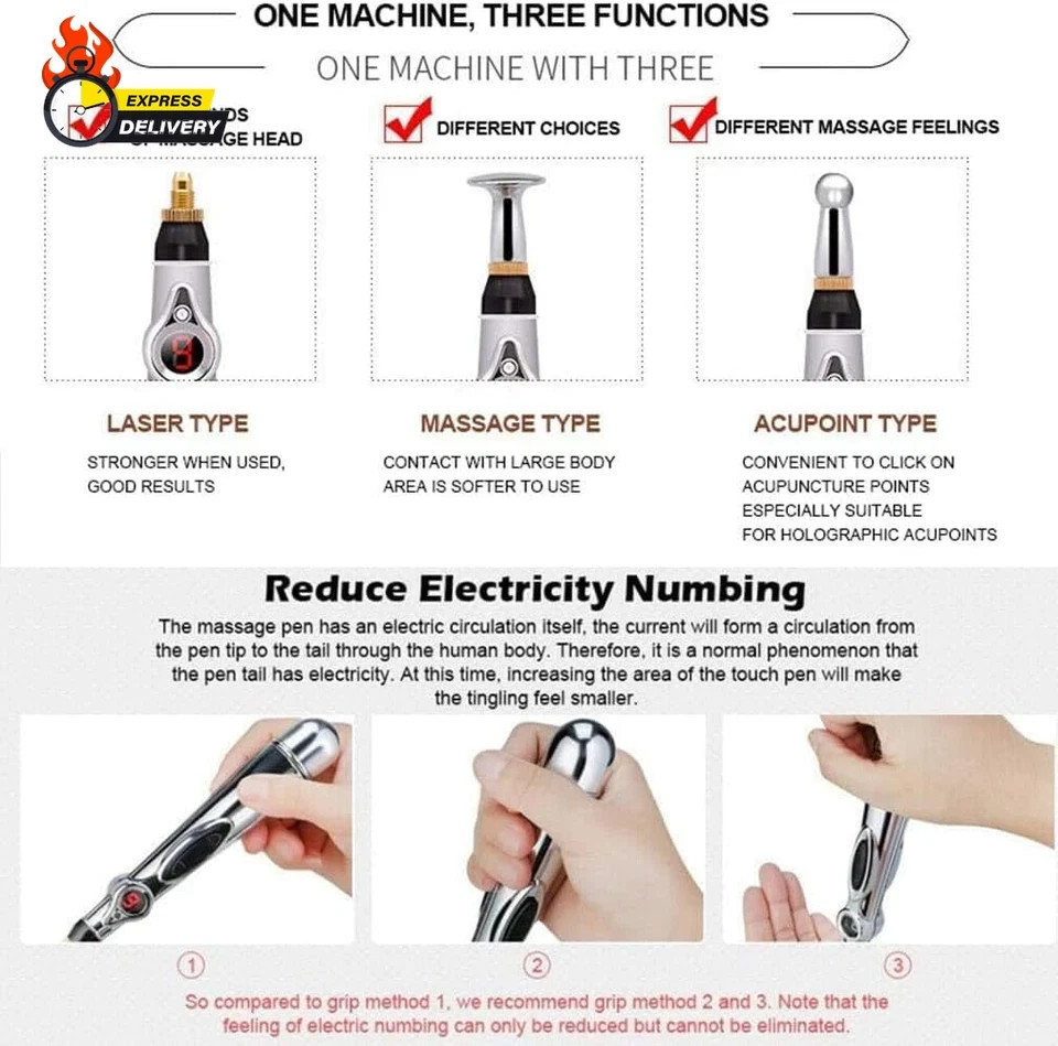 100% Money Back Guarantee if you are not satisfied with your purchase! ___________________ Description: Our 3-in-1 Electronic Acupuncture Massage Pen comes with 3 unique head. Dome Type Head for facial muscle rejuvention and health care; Node Type Head for partial body pains; Spheroidal Type Head for for quickly alleviating pain. ★【Nine Power Levels】: Our laser acupuncture pen contains nine different power levels. You can adjust to the proper level of energy based on different treatment need, when you feel a strong pulse by tipping the acupuncture pen around your body, that means you have found the acupuncture points. ★【Heals through Massage】: Meridian Energy Pen works based on the principles of magnets therapy as well as on acupuncture points. Phenomenon like "Electrical Stimulation" "Acupuncture Sensation", it is how electronic Meridian Pen works, please do not worry. ★【User Friendly】: It is aportable hand held device, which is exceptionally easy to use and carry. It has a digital display that simply press the start button to increase or decrease the strength of the electric pulse. It will be very helpful for pain relief and muscle relaxation. ★【Safe and Portable】: Operated by one 2 AA battery (Not Included). Safe and effective, with no side effects. Suitable for family use. Please contact with us if there has any problems or questions. ________________________ 100% Money Back Guarantee: We offer 30 Day Money Back Guarantee from the day you purchased if you’re not satisfied with your product. If you have any questions about our products, please contact us as soon as possible. Customer satisfaction is our absolute priority. Shipping: We are always working hard to ensure your package arrives as soon as possible. Please understand that some factors like weather, high postal traffic, and the performance of shipping companies are outside of our control. We offer free shipping to the lower 48 states and ship within 3 business days of payment, usually sooner. We do not accept P.O. Boxes. Please provide a physical address. You will be notified via eBay messages as soon as your items ship. Delivery: We will ship out the item in 2-3 working day after receiving the payment. Usually the delivery takes 2-5 business days. If you don't receive the items after 10 days, please feel free to contact us. You will get a replacement or a full refund. Please DO NOT open a return request or leave negative feedback without asking for help . Returns (Get Free Return Label): We offer a 30-Day Return Policy on defective/wrong items or items which you are not completely satisfied with. You have the option for a full-refund or an exchange of the item. No need to buy eBay return label. Contact us via eBay messages and get free return label. Returned items must be in all of the original packaging and include all of the original accessories or items that came with it. The item and package should be in original condition. Contact Us: Any queries or issues incurred, please feel free to contact us via eBay message, we will get back to you within 24 hours. Please DO NOT open a return request or leave negative feedback without asking for help. Feedback: Your feedback is very important to us. After you get your package and you are satisfied with our service, please leave us positive feedback. We are highly appreciated for your POSITIVE feedback and 5 stars. Enjoy shopping.