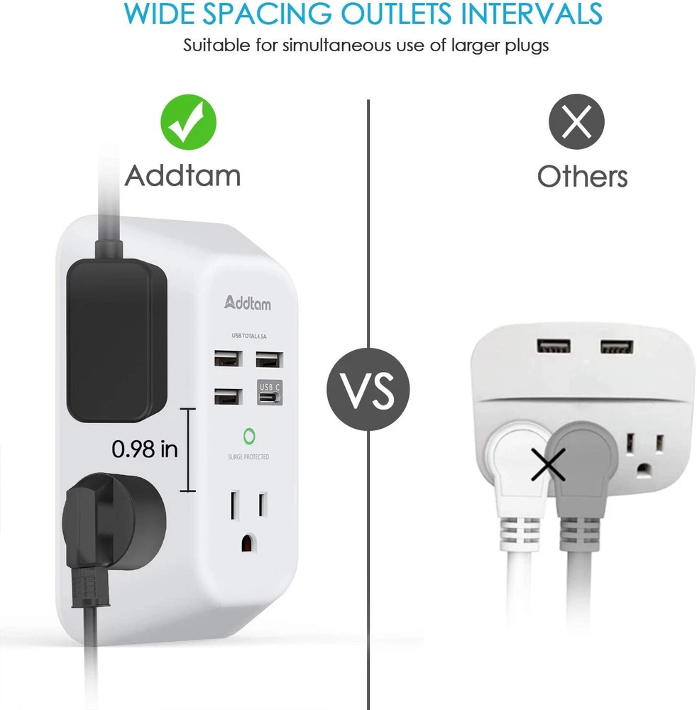 USB Wall Charger Surge Protector 5 Outlet Extender with 4 USB Charging Ports (1 USB C Outlet) 3 Sided 1800J Power Strip Multi Plug Outlets Wall Adapter Spaced for Home Travel Office ETL Listed Description Item model number AD5004 Style 1C3A Color white Product Dimensions 5.51 x 1.57 x 0.5 inches Country of Origin China Compatible Devices ac Connector Type USB Type C Item Weight 9.6 ounces Item Dimensions LxWxH 5.51 x 1.57 x 0.5 inches Brand Addtam Manufacturer Addtam Number of Outlets 5 Features USB Charger Plug Type United States USB Wall Charger Surge Protector 5 Outlet Extender with 4 USB Charging Ports (1 USB C Outlet) 3 Sided 1800J Power Strip Multi Plug Outlets Wall Adapter Spaced for Home Travel Office ETL Listed 【9 IN 1 Function USB Wall Outlet】- Fit duplex outlet perfectly, just plug in to use. Please NOTE: For some outlets, the white plastic prong can be cut off before using. You get 5 AC outlet splitter (3 sides) with wide space in between; 4 USB charger ports; 1800 joules surge protector protect electronics by improving your power quality 【USB- C Fast & Smart Charge】- 4 USB ports total 4.5 A, each USB A port features 2.4A Max output. USB C charging port features 3A MAX. Built- with smart technology, detecting charging devices and deliver optimal charging speed automatically, compatible with most USB devices. NOTE: The UCB-C port doesn't support any other devices which need 14~22V charging voltage 【1800J Surge Protector Outlet】- 3 complementary Surge Protection Circuits, TVS(transient voltage suppressor) MOV(metal oxide varistor) GDT(gas discharge tube), with response speed less than 1Ns, and minimum energy-absorbing capacity of 1800 Joules, much more quickly and reliably than the traditional MOV surge protector circuit. ("SURGE PROTECTED" indicator light on to show your devices are protected) 【Super Safety】- ETL Certificates. This power strip has overload protection, short-circuit protection, over current protection, over-voltage protection and overheating protection. It will automatically cut power to protect connected devices when voltage surge is overwhelming. Combined with fire-resistant casing- keeping you and your devices completely safe 【Wide Space】- With 3-sided Power Strip design, 5 AC outlets with long space in between, larger than a standard socket- Making it easier to use for all kinds of equipment and without blocking each other Product Description Smart 4-USB Charging Ports Smart 3 USB-A and 1 USB-C Charging Ports: 5V 4.5A shared rating; High-speed USB ports automatically detect charging devices and deliver optimal charging speed, up to 3.1A per port. it can charge 4 portable devices simultaneously. 5 AC Outlets The extended 5 outlets fit 5 standard plugs simultaneously. 3 sides with wide space in between. (125V/15A) Fast Smart USB Charging Ports High-speed USB ports automatically detect charging devices and deliver optimal charging speed, USB-C up to 3.1A per port, it can charge 4 portable devices simultaneously. 1800 Joules Surge Protection This power splitter comes with a surge protector which can absorb excess voltage to provide superior protection for desktop computers, mobile phones, and other electronics appliances from voltage fluctuations, surges, and spikes. Wall Mountable Designed Simple and secure installation. The integrate stabilizing post, makes wall mount outlets more secure and convenient. Please NOTE : For some outlet, the white plastic prong can be cut off before using Surge Protector LED Indicates Keeps Devices Safe from Surges and Spikes. When bad weather knocks out your home’s power or an unexpected surge or spike occurs, Addtam protector is your first line of defense. This safety-regulated, flat wall tap built-in LED light that indicates when your devices are protected and wiring properly grounded. Wide Space Wide space: 5 AC outlets built-in 1800 Joules surge protector with long space in between, larger than standard socket. Larger spacing makes it easier to use for all kinds of equipment. Perfect for Any Place This Mini Wall Outlet with 5 outlet & 4 USB ports can meet most applications, such as nightstand/home/office/travel. Number of Outlets 5 5 6 12 USB Charging Ports 3 USB A + 1 USB C 3 USB A + 1 USB C 2 USB A 2 USB A + 1 USB C Surge Protection(Joules) Yes (1800 J) Yes (1800 J) Yes (490J) Yes (490 J) Size / inches 3.5*5.4*1.7 in 3.5*5.4*1.7 in 3.5*5.3*0.9 in 3.5*6.0*1.5 in Special Feature 3 Side/ Wide Space 3 Side/ Wide Space Sensor Night Light 3 Side/Phone Holder