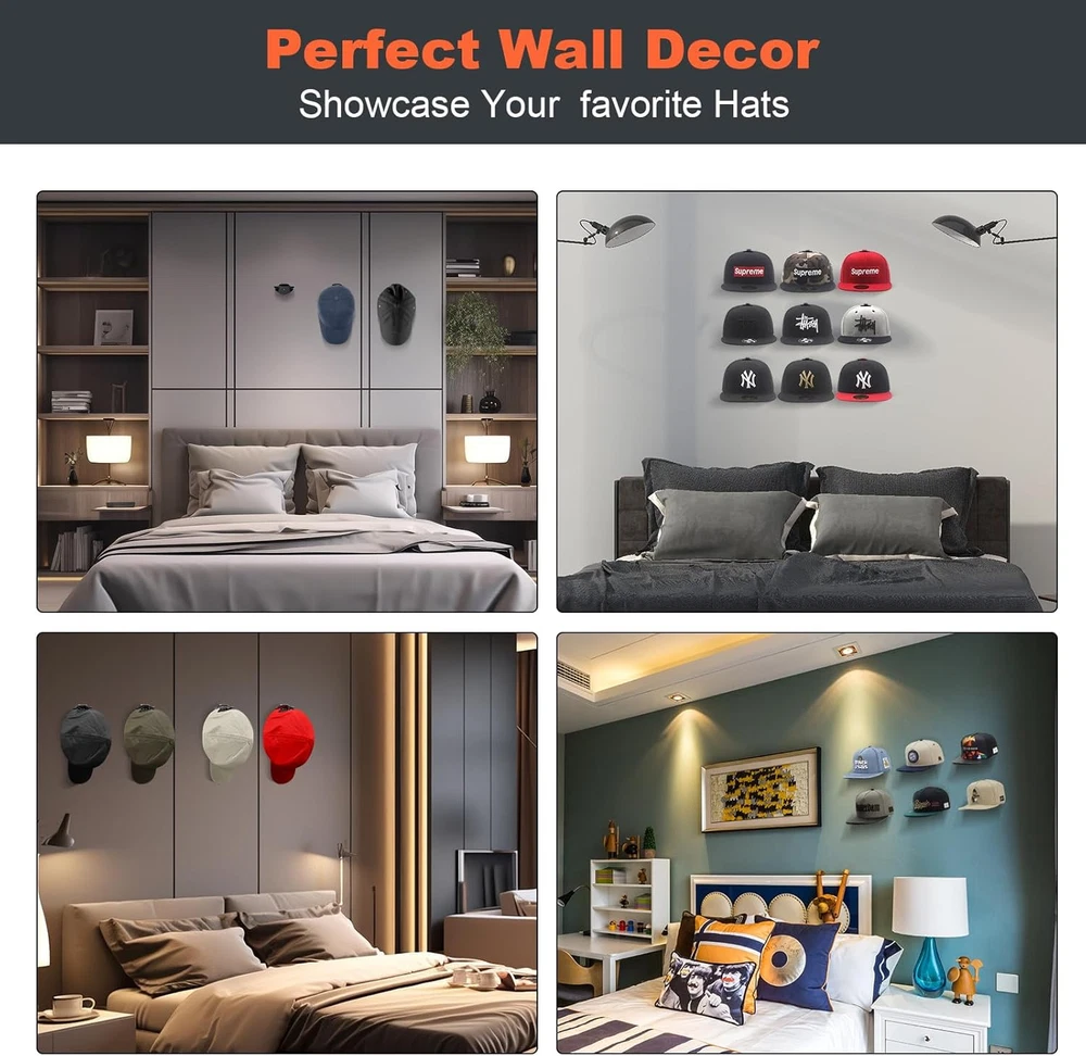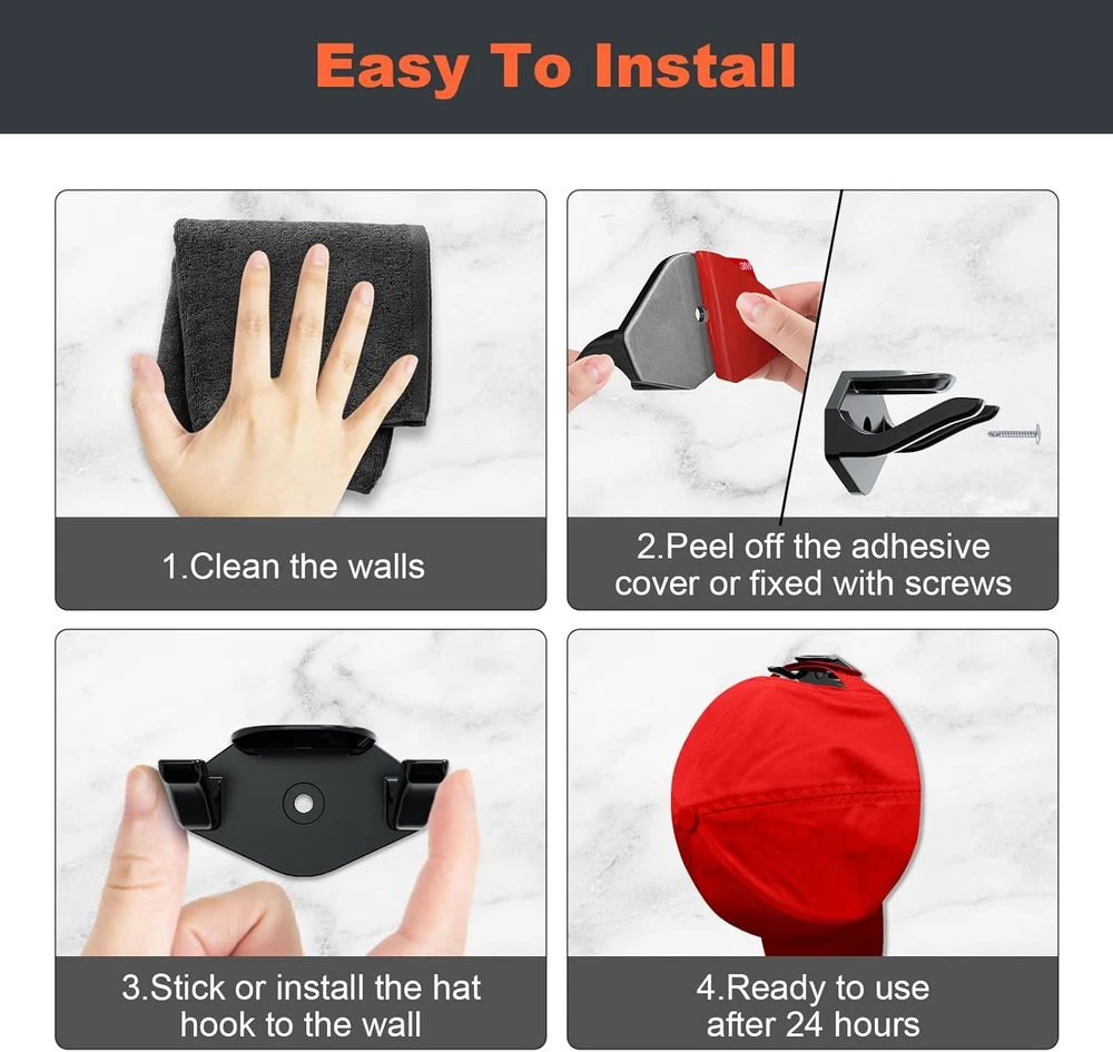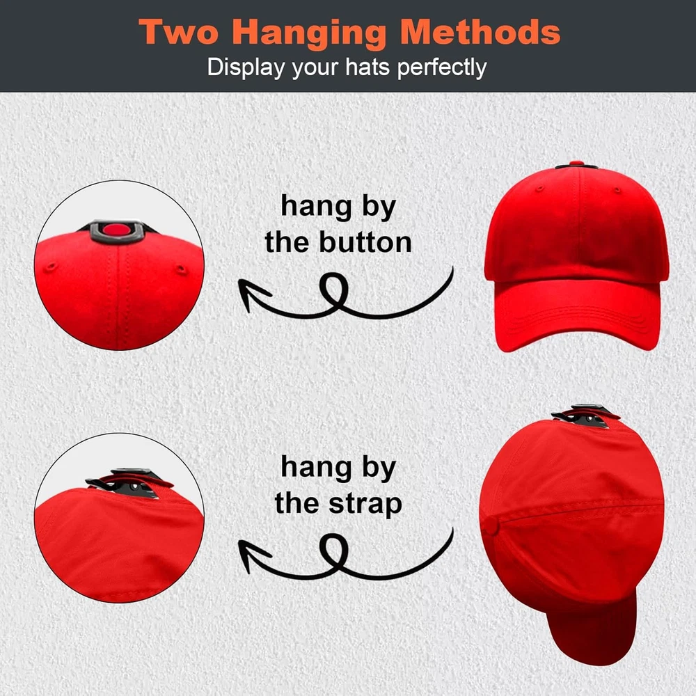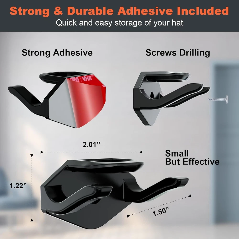 Adhesive Hat Hooks for Wall (16-Pack), Rack Baseball Caps, Black Product Details Color: Black Brand: KOVSPO Material: Plastic Finish Type: Matte Mounting Type: Wall Mount Style: Minimalist Special Feature: Heavy Duty Recommended Uses For Product: Wall, Hat, Decoration Theme: Hat Storage Included Components: Mounting Hardware Number of Hooks: 16 Surface Recommendation: Drywall" or "Plaster" or "Wood Maximum Weight Recommendation: 9 Pounds Manufacturer: KOVSPO Item Weight: 7 ounces Package Dimensions: 5.91 x 4.25 x 1.93 inches Finish: Matte Installation Method: hanging Special Features: Heavy Duty Batteries Included?: No Batteries Required?: No Color: Black Brand: KOVSPO Material: Plastic Finish Type: Matte Mounting Type: Wall Mount [DUAL HANGING METHOD] - Our hat racks feature a new upgraded design with two hanging options. The hat hooks for baseball caps can hang your hat facing forward by its button or facing downward by its strap. The hooks mostly hidden, perfectly display the shape of your hat in 2 distinct ways. [TWO INSTALLATION METHODS] The adhesive hat hooks for wall can be installed with included adhesive or included screws. CAUTION: Due to strong adhesive, please place the hook on a surface that does not tear. Do not use on wallpaper and rough surfaces. [MINIMALIST DESIGN] - Our hat hangers for wall is designed to showcase your hats, not the hook. When your hats are hanging, our hat wall hooks are mostly hidden from view. [ROOM DECOR] - The wall hat hooks showcase your baseball cap collection, while saving precious closet space, easy to hat organizer, access to items, so that your room is no longer cluttered. Adding a touch of personality to any room. [MULTI-FUNCTIONA] - These hat storages suitable for almost all kinds of hats including baseball caps, hi-hop hats, snapbacks, flat brim hats and visors. The hat wall hanger can also be used as headphone hanger and other household items.