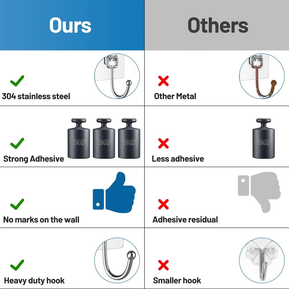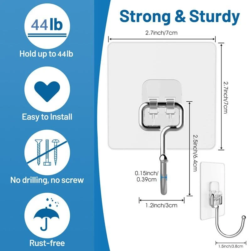 44lb load capacity: extended and thickened adhesive hooks are made of high-quality stainless steel with a load capacity of 44lb, so that the hooks are stable and durable for a long time. Excellent stickiness: thanks to the use of the high-quality adhesive, the wall hooks heavy duty are very sticky, after hundreds of tests, it shows that the hooks never fall off even under 44lb load capacity. Stainless steel adhesive hooks: made of high quality stainless steel, the strong adhesive hooks will not rust even in damp environments. Unlike other adhesive hooks on the market, which are made of normal metals. Suitable for large items: Compared with the smaller adhesive hooks on the market, these heavy duty wall hooks can not only be used for hanging small items such as keys, hats, etc., but also for large items such as clothes, robes, bags in the bathroom, kitchen, etc. Wide Range of Applications: The self adhesive hooks are the ideal items for your bathroom, kitchen, checkroom, etc. Suitable for smooth surfaces such as: glass, tile, metal, wood, plastic, etc. (Please note: plaster walls, painted walls, paper walls and other rough surfaces are not suitable).