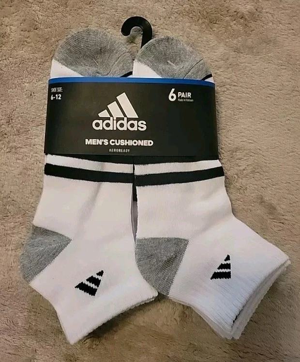 Adidas Men's cushioned 3 stripes Quarter Socks 6 Pair White/Black/Gray Size 6-12. Condition is New with tags. Shipped with USPS Ground Advantage.