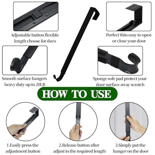 Return Policy Fast Delivery Trusted seller ZMCINER Wreath Hanger for Front Door, Adjustable 15-25 Inch Wreath Hanger, 20 lbs Larger Door Upgrade, Matte Black Product Description Wreath Hanger: Adjustable wreath hanger for front door from 15-25 inches, hanger width 1.14 inch, Over the door width 1.8inch, fits the doors below 1.8inch thick, sleek metal, heavy duty design can hold 20lb. Best Christmas gift for family and friends Considerate Design: Christmas wreath hanger, no issues with opening or closing the door, just hang over your front or back door, no screwing, the metal hook thickness over the door is only 0.078 inch, ultra thin to shut the door easily Protective Door Hanger: Wreath door hanger for front door, smooth surface and protective felt inside prevent scratching to the door, protect the door from scratch, press the back buttom of the wreath hanger, pull down or push up the hanger according to wreaths size, release the buttom after adjusting to desired height Multi Function: Wreath hanger can be widely used in indoor, outdoor, bedroom, Perfect to display Christmas wreaths, autumn wreath, holiday decorations, christmas decorations, cloth, bag, purse, hat and so on. Can fit front door, Bedroom door and Bathroom door Sturdy Material: Matte black wreath hanger for front door made of durable metal material long-lasting withstands winter gales and fall storms, smooth surface and soft pads protect the door from scratches, best choice for home using Shipping Returns Payment Shipping Shipping is FREE to all addresses other than APO/PO boxes in the lower 48 states. All our stock ships from US-based warehouses. Shipped via USPS or UPS (depending on location and package weight) Unless stated otherwise, all orders will ship within 24-72 hours of your payment being processed. Check our feedback to see the great reviews of FAST shipping we offer. Returns Seller does not accept returns Payment We currently accept payment via eBay managed payments only. Once payment is cleared, we will dispatch your shipment within 1-3 business days. Please refer to the "Shipping" tab for more information regarding shipping speed to your destination.