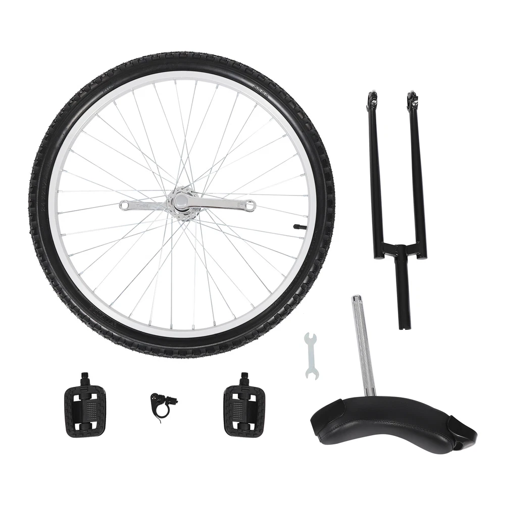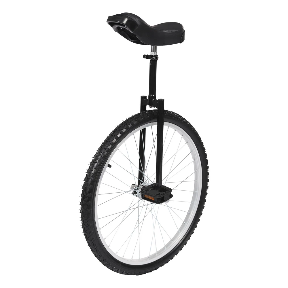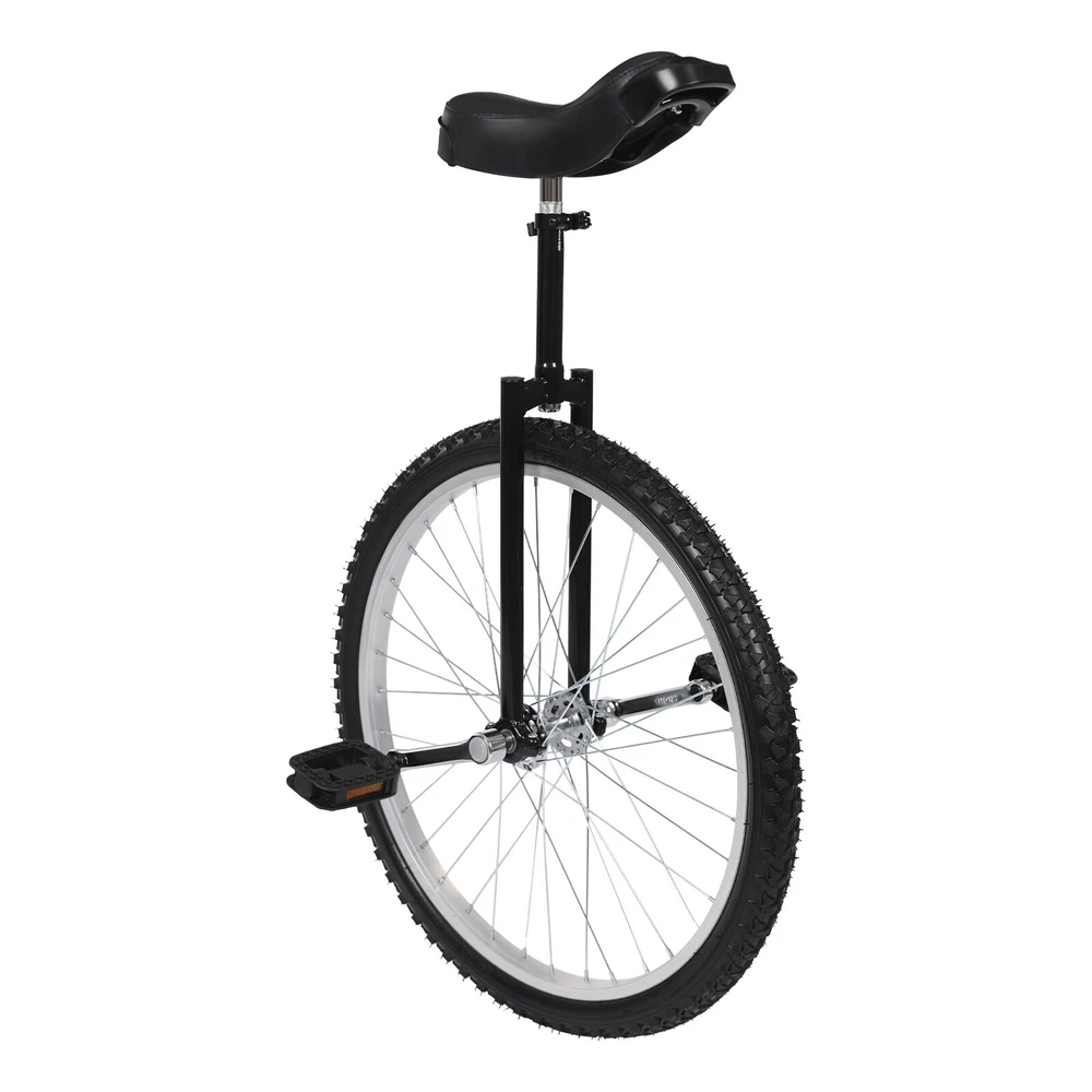 Description This 24-inch unicycle will provide you with a unique fitness experience, enhancing your physical fitness while improving your riding balance. The grips on the front and back of the seat and the lightweight body make it easy to carry, allowing you to maneuver through crowded city streets or on park trails, bringing you a different travel experience. It is not only a transportation tool but also a partner to show your own style and challenging spirit. Key Features Strong and Durable: The high-quality plastic, manganese steel, and aluminum alloy are corrosion-resistant , deformation-resistant , and rust-resistant , ensuring a stable and reliable riding experience. Adjustable Design: The clamp on the seat post allows you to easily adjust the product's height from 36 to 40in, making this product suitable for people of different heights (more than 5.74ft). Stable Riding: The tire with protruding points and non-slip pedals can enhance friction, effectively increasing stability and safety while riding. Strong Load Bearing: The aluminum alloy rim and manganese steel frame provide the product with a sturdy structure to withstand 154 lbs so that you can use it with more confidence. Comfortable Riding Experience: The soft seat cushion with a curved shape adopts an ergonomic design to fit your buttocks and bring you a comfortable riding experience. Thoughtful Design: You can grab the handles at the front and rear of the seat to ensure good stability during the riding process. Clean with Ease: Its smooth surface and simple structure allow you to easily clean the product with a damp cloth (not included). Keep Health: Practicing riding the unicycle will give you a stronger workout, improve your feeling of balance, promote cerebellar development, drive brain development, enhance cardiopulmonary circulation, and keep you fit. Ideal Gift: Its stylish appearance and practical function make it an ideal birthday and Christmas gift for your friends, families, and colleagues. Guaranteed Customer Service: We aim to provide quality products and services. If you have problems, please feel free to contact us. We will reply and solve the problem for you as soon as possible. Details Knurled Seatpost: The seatpost features spiral knurling technology, which prevents the seatpost from rotating erratically and provides excellent anti-slip performance. Bur-free Edges: They are smooth to the touch and can protect your hands from getting scratched. Application It is suitable for office workers, students, cycling enthusiasts, and other people for daily fitness exercise, cycling, balance training, talent performance, etc. Specification Color: Black Material: Manganese Steel, Aluminum Alloy, Plastic, Rubber Process: Painting Saddle Length: 23cm/9.06in Wheel Diameter: 60.96cm /24in Maximum Load Bearing Capacity: 70kg/154lbs Suitable Height: > 1.75m/5.74ft Height from Saddle to Pedals: 43.18-83.82cm/17-33in Product Height: 91.44-101.6cm/36-40in Seatpost Length: About 23cm/9.06in Suitable Age: 7-60 Years Old Mount Type: Free Standing Assembly Required: Yes Package Size: 57*18*60cm/22.44*7.09*23.62in Gross Weight: 5.4kg/11.9lbs Package Included 1* Unicycle Frame 1* Unicycle Saddle 1* Wheel 2* Pedals Other Accessories for Assembly Notes Please check the size carefully before ordering. The pedal must be tightened before riding. Please note that your legs should be almost straight when you sit on the unicycle and place one foot on the lowest position of the pedals. Please insert the frame to the appropriate depth for your height and then tighten it to ensure a safe ride. It is recommended to wear a helmet, wrist guards, and elbow pads (not included) to ensure safe riding. For safety reasons, novice riders should ride under the guidance or accompaniment of an instructor. It is better to choose an open, grassy, fenced area with firm and level dirt for training. Please allow the slight color difference caused by the shooting light and 1-3cm error due to manual measurement, and make sure you do not mind before ordering.