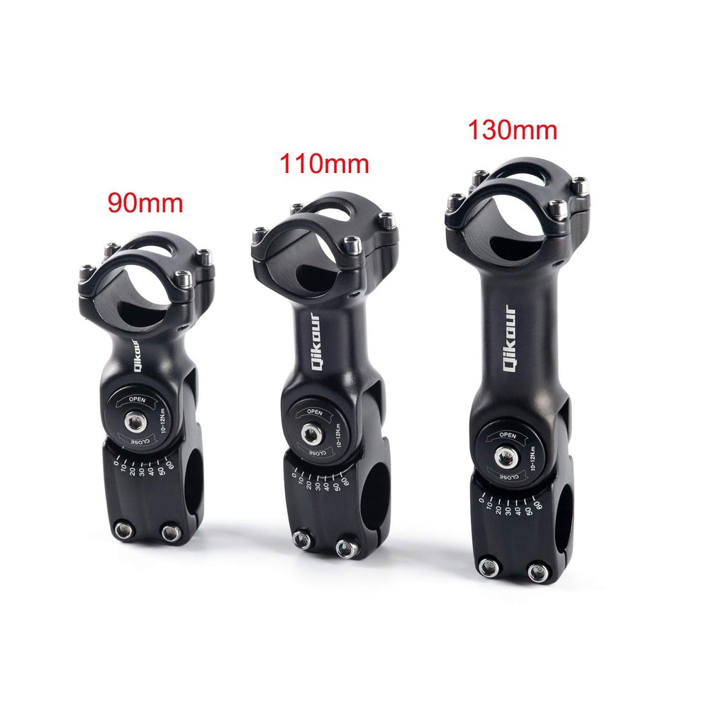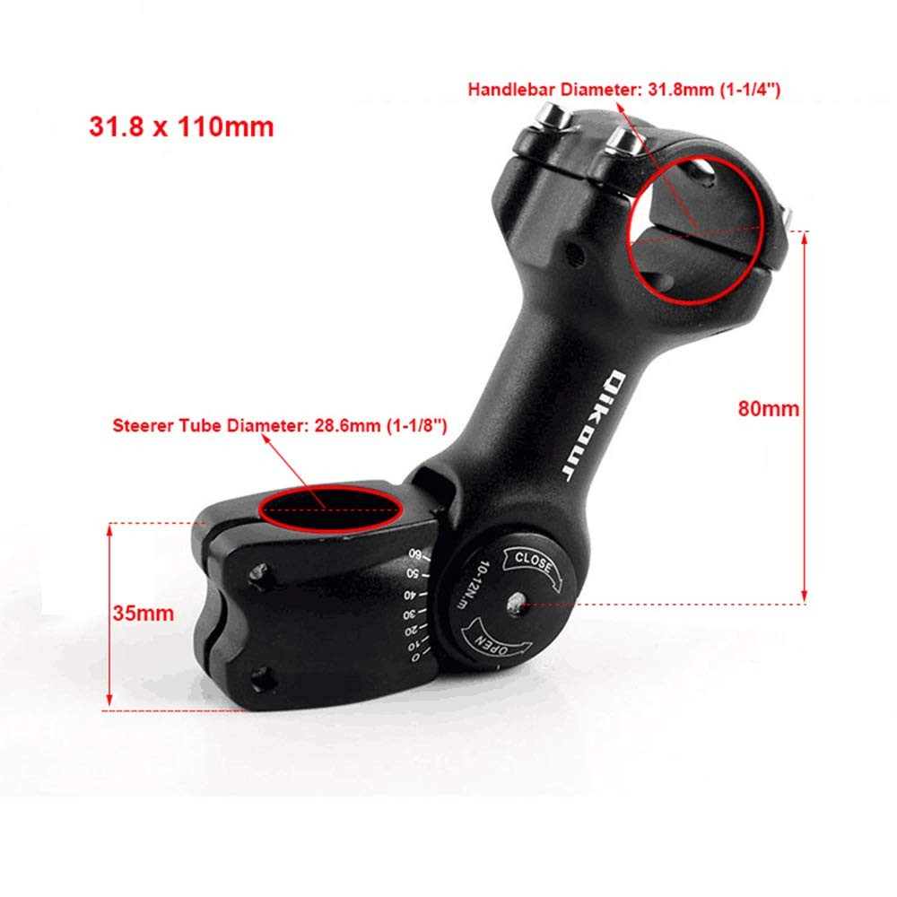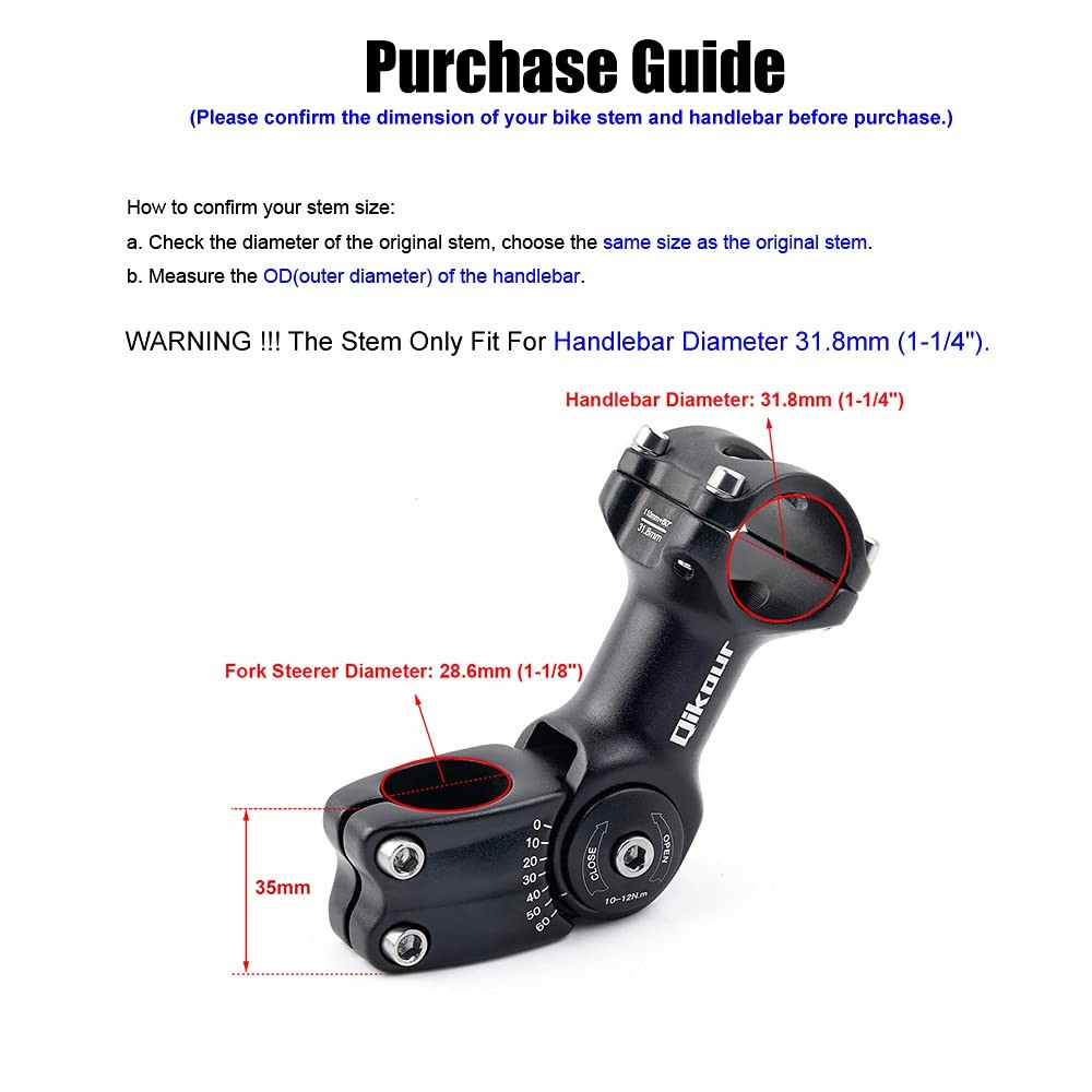 WARNING Please confirm your bike steering tube diameter is 28.6mm (1-1/8") before order!!! Otherwise, the item is not suitable for your bike. Be sure to use glue on threads if any loosen up. Specification: Material: Aluminium Alloy Handlebar diameter: 31.8mm (1-1/4") or 25.4mm (1'') Steerer Tube diameter: 28.6mm (1-1/8") Adjustable degree: 0° ~ 60° Length: 90mm / 110mm / 130mm Features: Forged alloy construction, high-strength. CNC machined, fine workmanship. Cycling equipment bike components, suitable for most of mountain bike, road bike etc. Package: 1 x Bike Stem ★ NOTE: Please confirm the bike steering tube diameter is 28.6mm (1-1/8") and the handlebar diameter is 31.8mm (1-1/4") or 25.4mm (1'') before order! ★ The bike stem is sturdy, well designed and easily adjusted, which is preferable to removing the handlebar stem and exchanging it for one with a different angle. ★ The installation is easy because the specs were accurately represented. There is a "degree of angle" indicator on the adjacent parts to allow you to set your angel correctly. The stem has a opening that allows you to see where the handle bar is positioned. ★ This is a pretty nice riser, good adjust-ability. Depending on the thickness of your handlebar, you may need to install a shim. Be sure to use glue on threads if any loosen up. ★ Use the adjustable stem to achieve a more comfortable riding position, the pain caused by the original setup in shoulders/arms/back had to be corrected. This stem and a riser handlebar did the trick, allow you to sit more upright on bike which is better for your back.