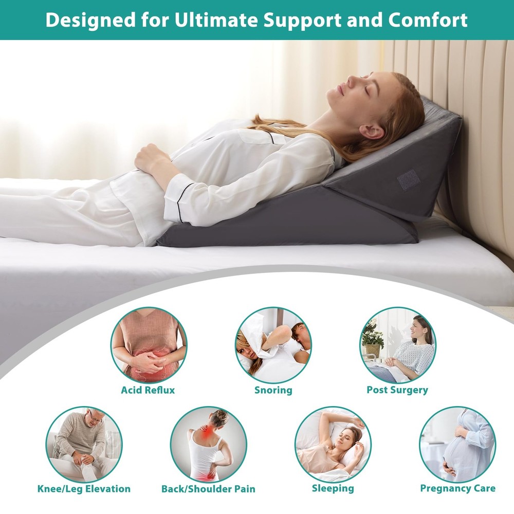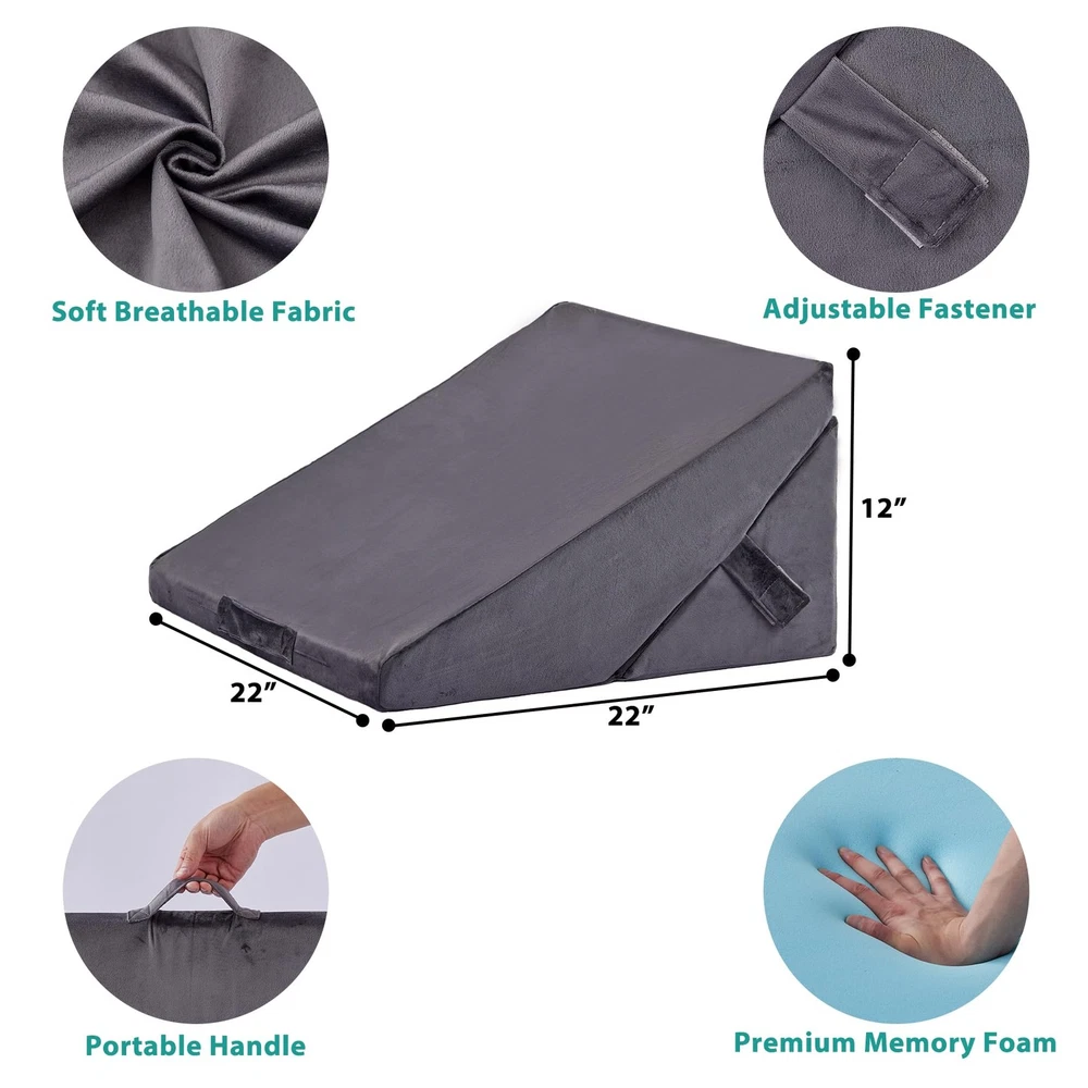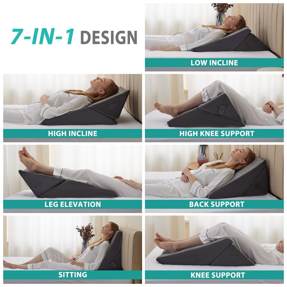 Introducing the Ultimate Wedge Pillow Set – your gateway to heavenly slumber and revitalizing rest! Crafted with passion and precision, our 2-piece set is designed to elevate your sleep experience to unparalleled heights. Say goodbye to tossing and turning, and embrace the allure of a truly rejuvenating sleep every night. ELEVATE YOUR SLEEP EXPERIENCE Indulge in a luxurious sleep sanctuary with our premium wedge pillow set. Each piece is carefully engineered with high-density memory foam, cradling your body in celestial softness. Discover the perfect incline that supports your head, neck, and back, ensuring blissful comfort throughout the night. BID FAREWELL TO SNORES & ACID REFLUX Unleash the transformative power of our wedge pillow set and experience the magic of a snore-free slumber. Elevating your upper body helps reduce snoring and promote healthier breathing. Say goodbye to acid reflux too – our inclined design keeps stomach acid where it belongs. VERSATILE SUPPORT, PERSONALIZED FOR YOU Customize your sleep oasis with our multi-functional design. The detachable flip-around section allows you to find the perfect angle for your individual needs. Snap it in place to prevent midnight adjustments and drift off into dreamland with ease. Plus, our innovative carry handle makes transportation effortless, whether you're lounging in bed or moving to the couch. Ultimate Versatility: Experience unmatched versatility with wedge pillows set, offering 7-in-1 design for limitless possibilities. Effortlessly transform the pillows to cater to various body areas like the head, back, or legs. It provides firm comfort and is especially beneficial for post-surgery recovery. Customizable Height & Angle: Thanks to its innovative design and adjustable options, our bed wedge pillows give you the flexibility to choose the most suitable height and angle. You can select between 9 inches or 12 inches in depth, providing a tailored sleep setup to meet your specific needs and enhance body alignment. Precision-Crafted Memory Foam: Immerse yourself in luxury with our premium memory foam. Crafted with a 30D high-resilience base and a 40D slow-rebound upper layer, our triangle pillow wedges deliver unwavering durability and exceptional support. Feel the foam respond to your body's contours, releasing pressure for an unparalleled sleep experience. Enhanced Comfort & Pain Relief: Say goodbye to discomfort! Our wedge pillows are highly effective in addressing issues like acid reflux, snoring, back pain, and neck pain, while promoting proper blood circulation. Experience a more comfortable and pain-free sleep for ultimate rest and relaxation. Easy to Use & Maintain: Experience convenience at its best. The foldable design and secure fastener allow for easy setup. The washable and breathable cover ensures effortless maintenance, while the built-in handle makes portability a breeze, so you can use the pillows anywhere in your home with ease. Warm Tips: To ensure optimal performance and comfort, allow the triangle pillow wedge set to naturally expand in a well-ventilated area for 12-24 hours upon receipt. Expansion time may vary, patience for 24-48 hours ensures full support. Maintain cleanliness by regularly washing the removable cover. Please remember to peel off the protective layer covering the Velcro before use.