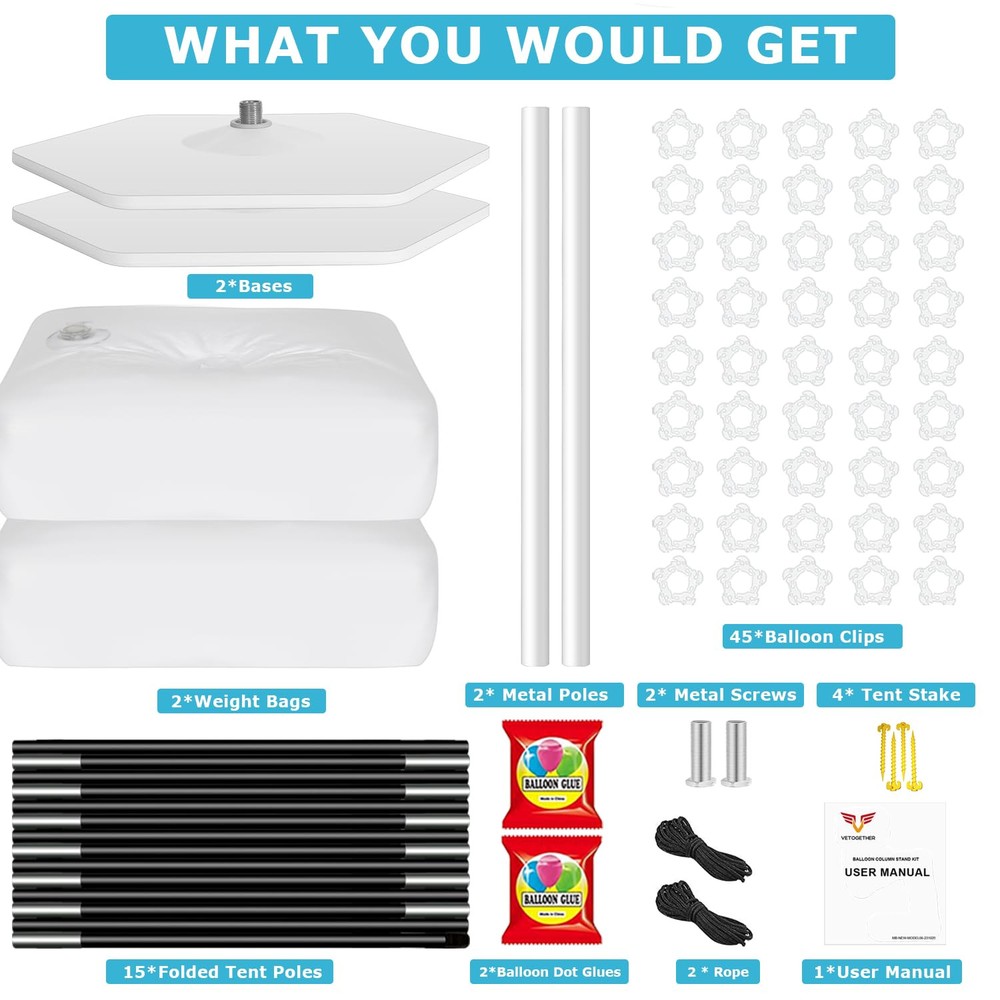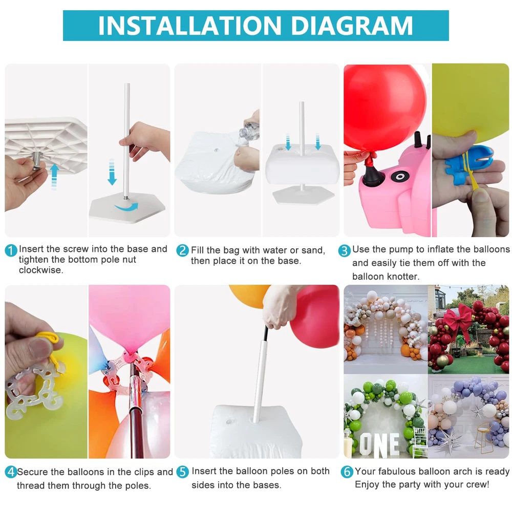 💖【Complete Balloon Arch Kit With Base】: Ballon arch holder kit package includes 15 folded glass fiber poles,2 PVC bases,2 Metal pipes 2 PVC pipes,2 water(sand) fillable bags,1 balloon hand pump, 50 balloon clips,2 balloon knotter,1 dot glue,2 ground secure ropes,4 ground nails, and 1 detailed user manual. It would be great supplies for your DIY party 💖【Widely Applicable Balloons Arches】: balloon arch stand kit perfect for birthday parties, family parties, baby showers, graduation ceremonies, anniversaries, Christmas, and Thanksgiving Day, also as wedding arches for the ceremony. DIY your party with different balloons outdoors or indoors 💖【Easy Assembly & Adjustable Size】: According to the video instructions, or the detailed user manual (Included in the package), you can assemble or disassemble the balloon arch holder stand in a few mins. The height and width of the arch can be adjusted by adjusting the distance between the bases 💖【Durable & Sturdy Balloon Arch Kit】: balloon arch stand kit for outdoors or floor, equipped with 2 well-designed mesh base and 23LB Water Bags(filled with water), stable Metal Pipe, PVC Pipe, single length is 17 inches high strength black glass fiber pole, and the ground secure nails and ropes, make it not shake sharply due to wind or object collision 💖【Outstanding & Reassuring Service】: is a reliable and responsible Party supplies brand, We work hard to provide customers with high-quality products and outstanding services, Pls us for any problems or questions FIRST. We will make sure you get the best solution or full money back if not satisfied.