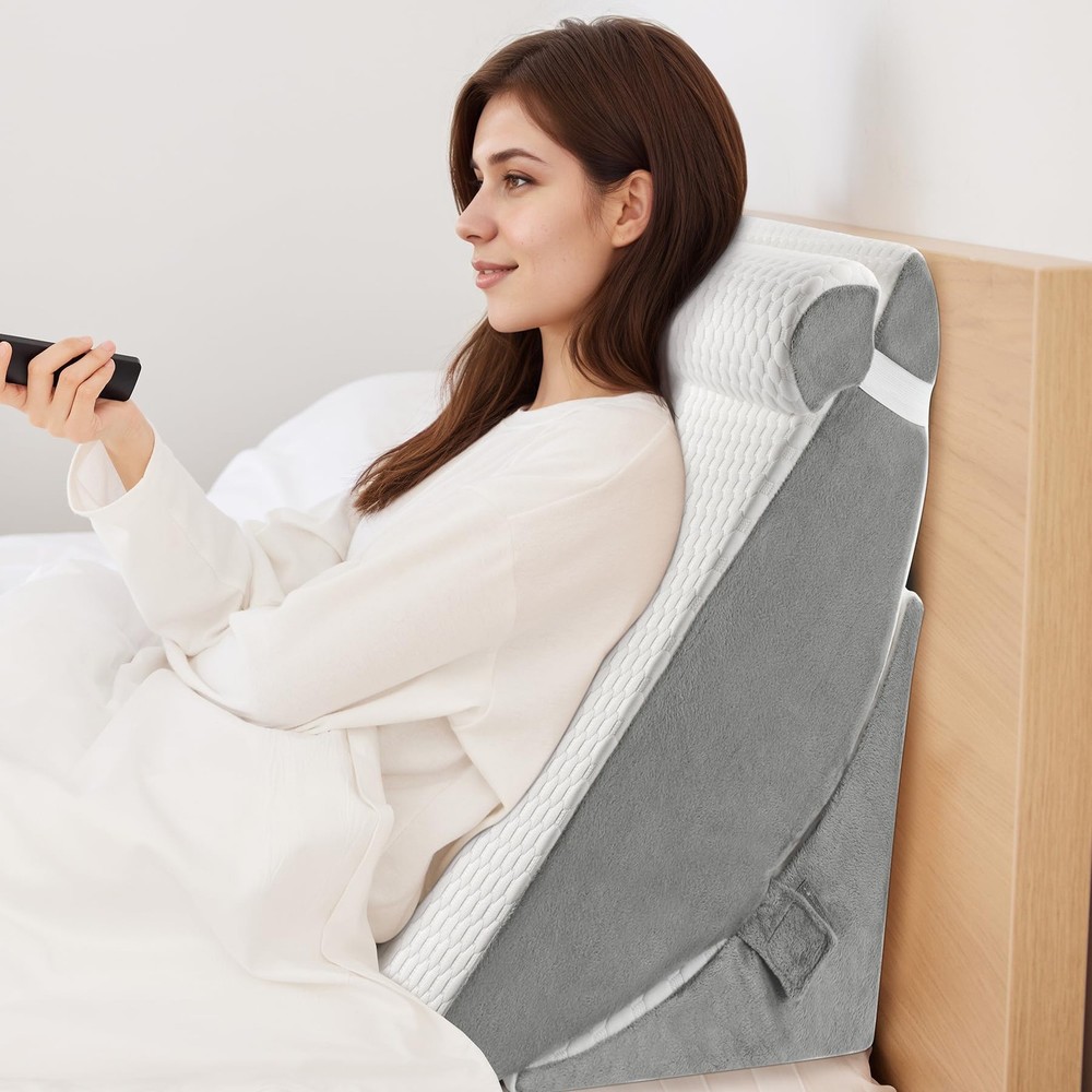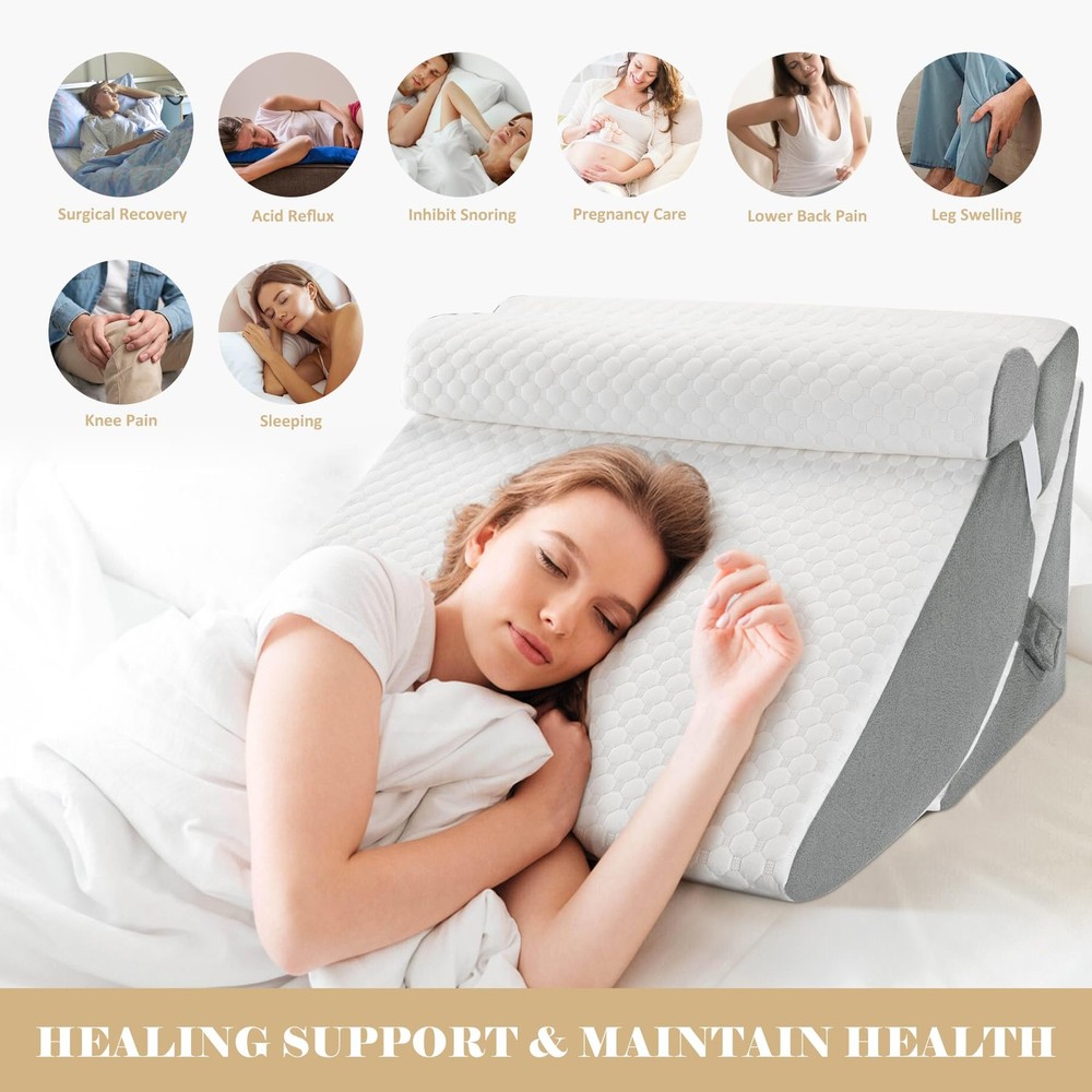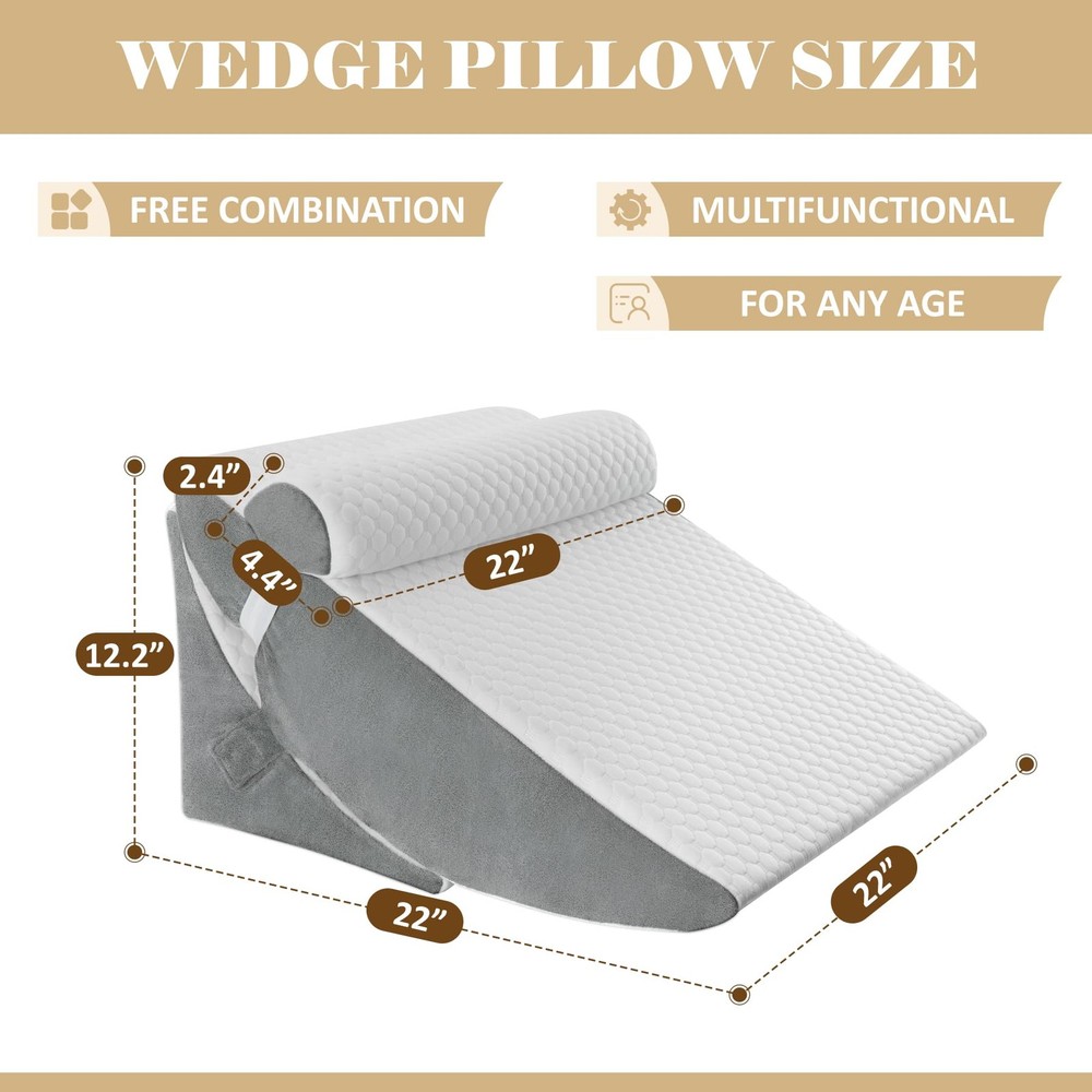 White/Grey 【 Adjustable Bed Wedge Pillow】Our back support pillow sitting up are design a versatile and adjustable all-in-one flip wedge pillow with width increased to 7 or 12 inches, which is wider, more comfortable and easier to turn over or better fit large person. good wedges body pillows meet your needs and support for comfortable night sleep 【Soft and Supportive Foam Bed Wedge Pillow】The ergonomic wedge pillow is made of premium-grade 25D memory foam, which is comfortable and breathable, wedge pillow for sleeping has been certified by CertiPUR US and OEKO-TEX, which is safe and hypoallergenic.Its ergonomic design supports various uses – from elevated back support for sleeping, reading or working, to a gentle slope for sleep, easing snoring, post-surgery discomfort, acid reflux, and improving blood circulation as a leg elevation pillow 【Friendly-Design for Pain Relief】Supportive and elevated post-surgery wedge pillow help you reduce snoring, relieve back, leg pain, acid reflux and breathing issues, improving blood circulation and health. Ideal wedge pillows for after surgery and sleep apnea, providing more comfortable night's sleep for you 【Washable Cover】Our 3pcs wedge pillow set features a breathable and skin-friendly knitted air layer fabric cover, promoting airflow for a cool sleep experience. The removable cover with a hidden zipper is machine washable for easy maintenance. Wide and foldable velcro sewn on the side allows for various customizable combinations 【Perfect Gift Idea】If you or lover struggles to sleep at night, this wedge pillow for sleeping is a good choice for you, it can help you solve the problem. Whatever any concerns about wedge pillow you have, please feel free to contact us and we’ll answer your question within 24 hours