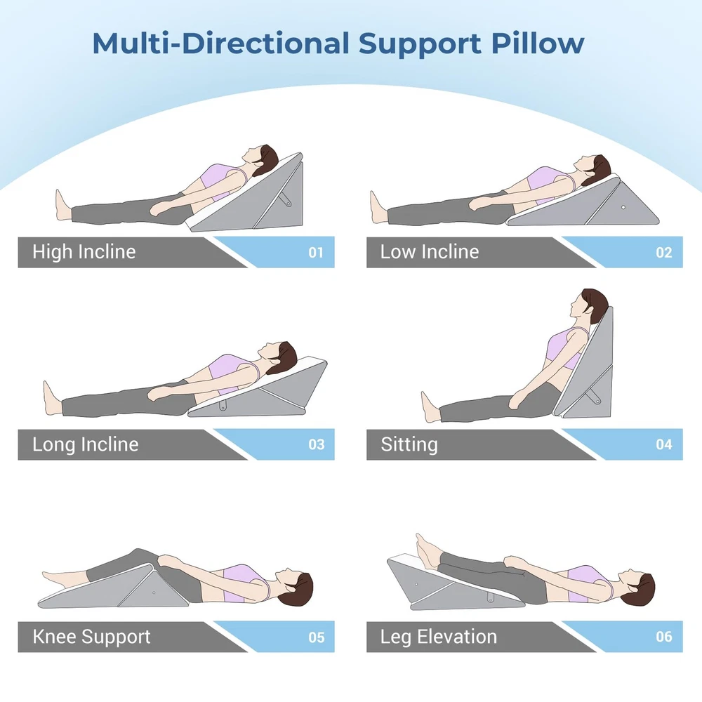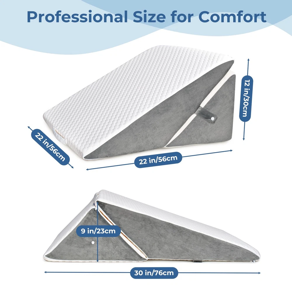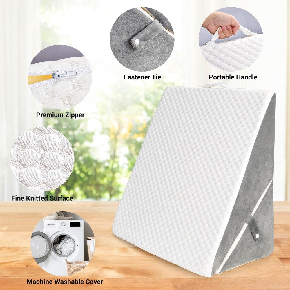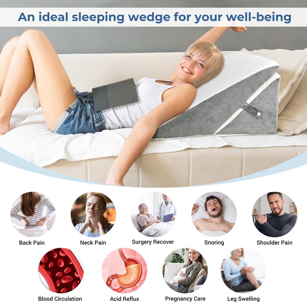 Ergonomic Bed Wedge Pillow: With Its Premium-grade foam base and 1.5-inch layer memory foam, the bed wedge is soft, yet supportive, It remains uniform in density and conforms to your shape to reduce pressure points, help increase blood flow and provide the support, comfort and alignment you need for a comfortable and restful sleep - Foam wedge specifically designed for ultimate relaxation. Versatile Folding Pillow Wedge: The triangular wedge pillow, suitable for snoring, is foldable and adjustable. It can easily adjust the height (9 and 11 inches) and angle, making it perfect for supine and lateral lying. It can provide extra support when learning, watching TV or reading Premium Bed Wedge Pillow: The ergonomic wedge pillow is made of premium-grade 25D memory foam, which is comfortable and breathable, wedge pillow for sleeping has been certified by CertiPUR US and OEKO-TEX, which is safe and hypoallergenic Friendly-design for Pain Relief: Supportive and elevated post-surgery wedge pillow helps you reduce snoring, relieve back pain, acid reflux and breathing issues, improving blood circulation and health. Ideal wedge pillows for after surgery and sleep apnea, providing more comfortable night's sleep for you Breathable and Removable Zippered Cover: The bed wedge pillow has a removable soft and breathable air layer pillowcase, which can be washed by hand or machine. Besides, with a handle, our foam wedge pillow is easy to carry and move around Good Choice: If you struggle to sleep at night, this wedge pillow for sleeping is a good choice for you, it can help you solve the problem. Whatever questions about the wedge pillow you have, we provide customer service for you and reply within 24 hours