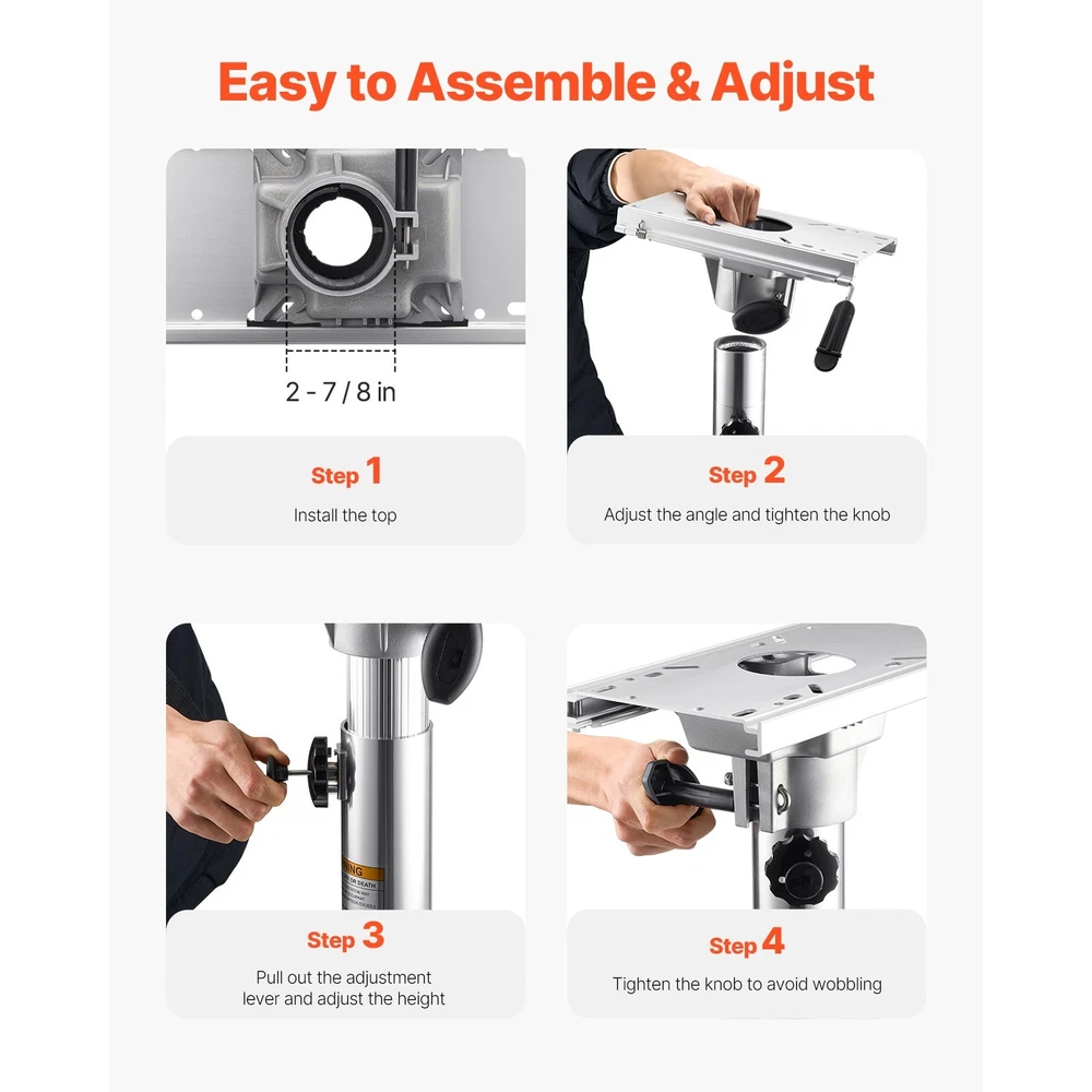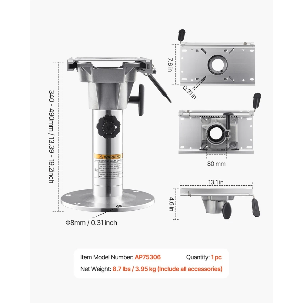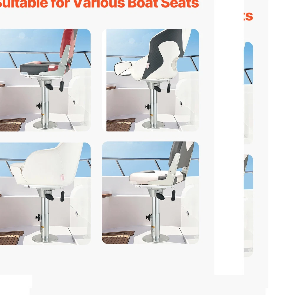 Features & Details Three Flexible Adjustments: The boat seat pedestal provides 13.39-19.2 inch (340-490 mm) height adjustment, 360° angle adjustments, and forward/backward sliding to help you find the ideal seating position. Enjoy enhanced comfort and a better view! Aluminum Alloy Construction: Our adjustable boat seat pedestal is made from heavy-duty aluminum alloy, providing increased support and durability. The thickened aluminum resists deformation and the waterproof features avoid corrosion, making it great for outdoor and marine environments. Universal Installation:Pre-drilled holes on the adjustable boat seat base make it easy to attach to your deck. Just align the holes with the components and secure the base in place. Note: Stainless steel screws are required for installation (not included). Knob Locking: Quickly lock the adjustable boat seat mount height and angle with the knob to avoid wobbling, improving stability and keeping you comfortable during use. Widely Compatible: This versatile boat pedestal fits many types of boat seats, letting you enjoy water sports like fishing and boating on fishing boats, yachts, canoes, and more!