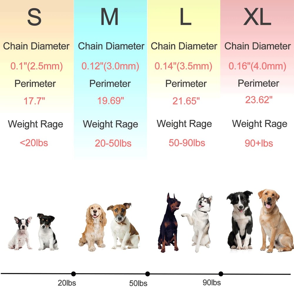 ❤Product description : Size: Medium - Diameter 3.0 mm (0.12 in) and length 19.69 inch. Weight: About 5.3 ounces Product Material: Chrome plated iron. Features: 100% Brand new and high quality. Convenient and Practical 【Suitable Size】 Small size: Diameter 2.5mm and length 13.78 inch. Medium size: Diameter 3.0 mm and length 19.69 inch. Large size:Diameter 3.5 mm and length 21.65 inch. Extra large size: Diameter 4.0 mm and length 23.62 inch. Measure the circumference of your dog's neck and add 1-2 inches as appropriate. 【Reasonable Design】 Made of high quality iron with chrome plating, this dog prong collar is durable and not easy to rust. The smooth round head design along with the comfortable rubber covers protect the dog's respiratory tract and sensitive parts of the neck from sharp pricks. And 2 strong D-rings allow for a tighter connection with the dog leash. 【Adjustable links】 Each link of the dog collar is removable by using a tool, and an extra link is included for you to easily add or remove links from the dog prong collar as needed to fit the dog's neck for optimal training. 【Effective Training】 Dog prong collars can effectively help you train your dog to follow basic commands. Simply pull the training collar, which naturally spreads pressure the way a mother dog corrects her puppy with her teeth, and the dog will stop immediately. It is a necessary equipment for dogs to go out. 【Easy To Use】 Dog training collar with a high-strength quick release buckle allows you to easily slide on the lock so that the dog does not break free of the collar, or you can quickly unlock the buckle and take off the collar to set the dog free. 【Suitable Size】Medium size: Diameter 3.0 mm and length 19.69 inch.Measure the circumference of your dog's neck and add 1-2 inches as appropriate. 【Reasonable Design】Made of high quality iron with chrome plating, this dog prong collar is durable and not easy to rust. The smooth round head design along with the comfortable rubber covers protect the dog's respiratory tract and sensitive parts of the neck from sharp pricks.The rubber cover needs to be worn by yourself. 【Adjustable links】Each link of the dog collar is removable by using a tool, and an extra link is included for you to easily add or remove links from the dog prong collar as needed to fit the dog's neck for optimal training. 【Effective Training】Dog prong collars can effectively help you train your dog to follow basic commands. Simply pull the training collar, which naturally spreads pressure the way a mother dog corrects her puppy with her teeth, and the dog will stop immediately. It is a necessary equipment for dogs to go out. 【Easy To Use】Dog training collar with a high-strength quick release buckle allows you to easily slide on the lock so that the dog does not break free of the collar, or you can quickly unlock the buckle and take off the collar to set the dog free.