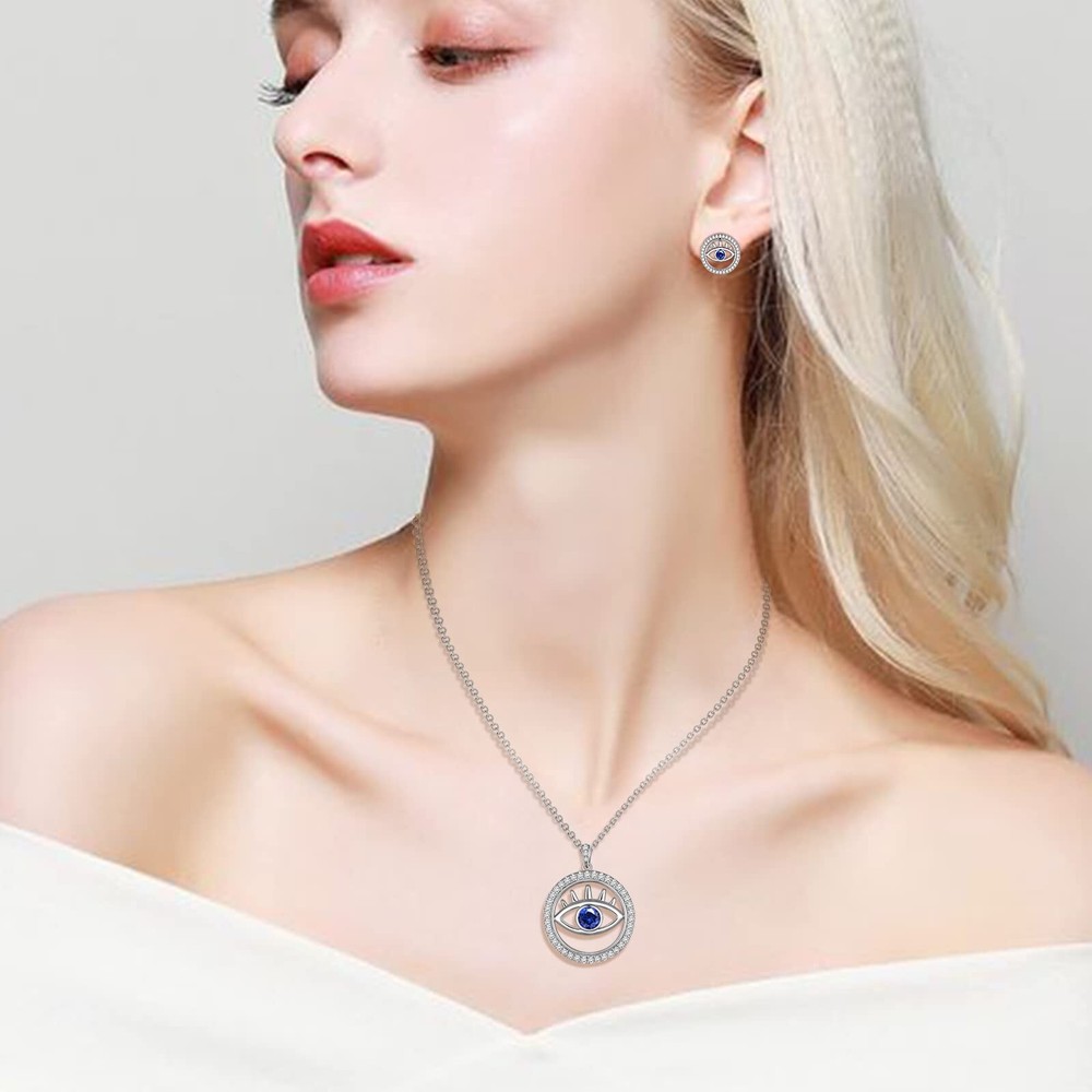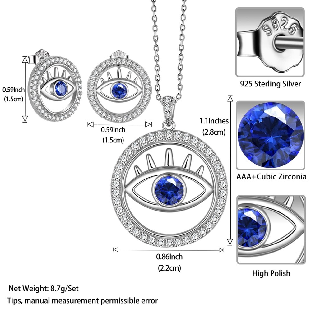 Adjustable Evil Eye Ring Turkish Eye Necklace Blue Eye Stud Earrings White Gold Plated Over Sterling Silver Women's Symbolic Evil Eye Crystal Jewelry Christmas Day Gift Valentine Day Gift for Her Product Details Color: G, Eye Set Brand: Jewmon MPN: FS0145W-US UPC: Does not apply EAN: Does not apply Date First Available : October 11, 2021 Manufacturer : Jewmon Jewelry Brand, Seller, or Collection Name: Jewmon Material: Crystal Gem Type: Cubic Zirconia Clasp: Lobster Clasp Model number: FS0145W-US Metal: Silver Metal stamp: S925 Stone shape: Round Minimum color: blue Charming and Amulet ❤The evil eye is often a symbol of luck, fortune, protection and prosperity. It is said that wearing this special evil eye charm necklace could be a protection amulet to ward off misfortune. Evil eye necklaces can bring good luck, health, success and wealth for you and your family members. Item Details ♥Material:High Quality Solid Sterling Silver 925 (tarnish-free, nickel-free, lead-free, and cadmium-free. 100% safe for sensitive skin). ♥ Adjustable Ring Size, you can adjust it to be smaller or larger to fit perfectly on your finger. ♥Chain:20inch rolo chain with 2inch extender chain, with Lobster Clasps. ♥Top quality Cubic zirconia are sparkling and reflect rainbow gloss in the sunshine just like a real diamond. ♥GIFT BOX: Come up with a velvet pouch and beautiful gift box for gifting (or of course...to keep for yourself). ♥This beautiful jewelry match with suitable apparel for different occasion such as dance party, Christmas, Mother's Day, Birthday, Anniversaries, Graduations, Weddings, Thanksgiving, Valentine's Day,Everyday Wear or any others occasions ! Warm Tips 1.Keep silver jewelry clean and dry. Silver jewelry should be placed in a sealed dry place when not in use. 2.Better not wearing it while bathing 3.Away from chemical, such as perfume. Best to wear perfume before wearing jewelry. 4.Regularly wipe the surface with a polishing cloth will help maintain its shine. 5.The pictures are from actual product, there might be differences of color and texture due to different display monitors.