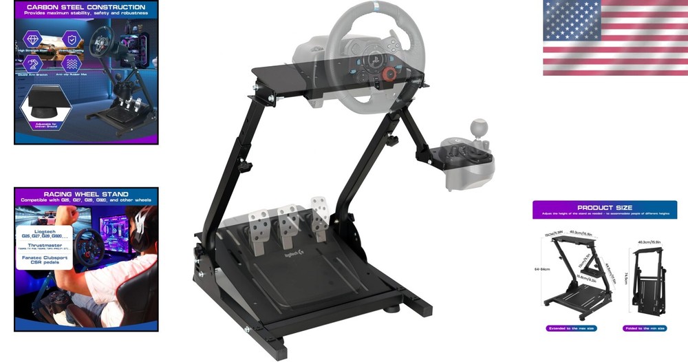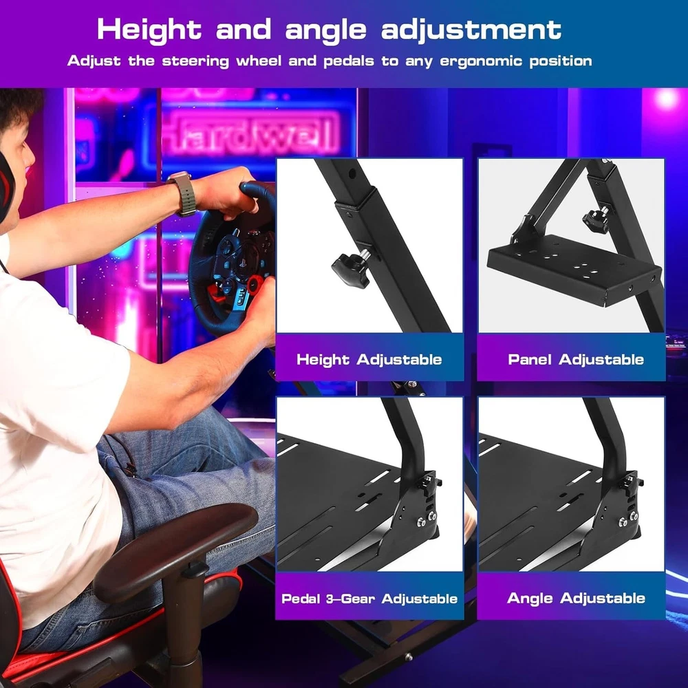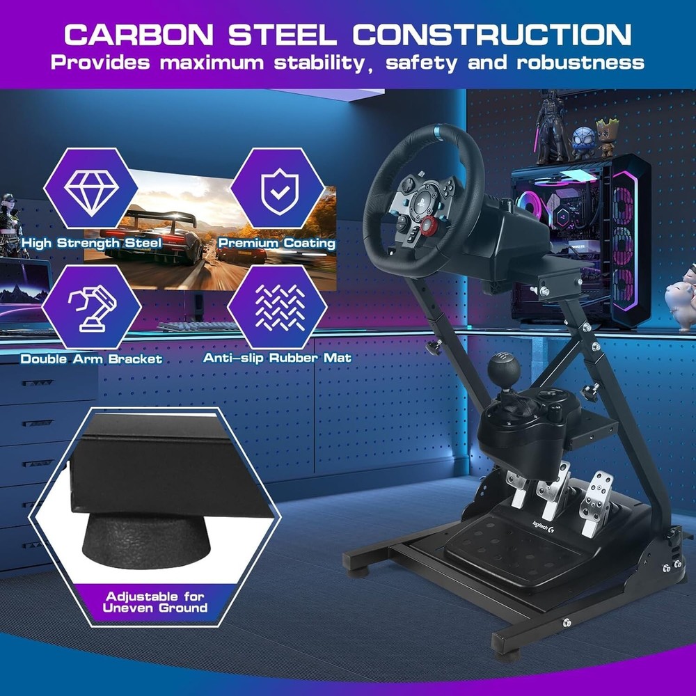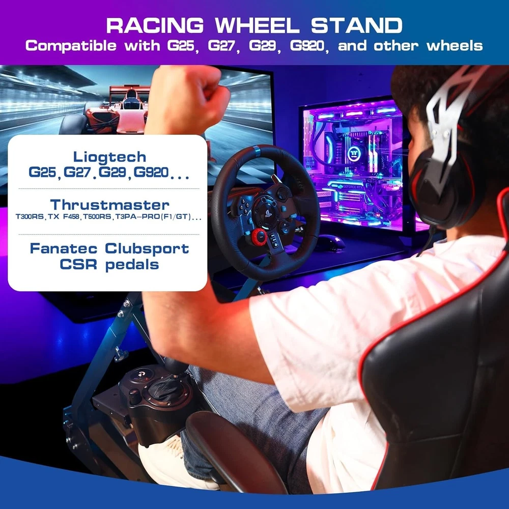 This racing wheel stand is a game-changer for sim racing fans! The adjustable height and angle make it super comfortable, and it folds up neatly when not in use. Works flawlessly with my Logitech G29—super sturdy with no wobble during intense races. Super easy to set up, and the compact storage is a huge plus. Highly recommend for anyone serious about their racing setup!
