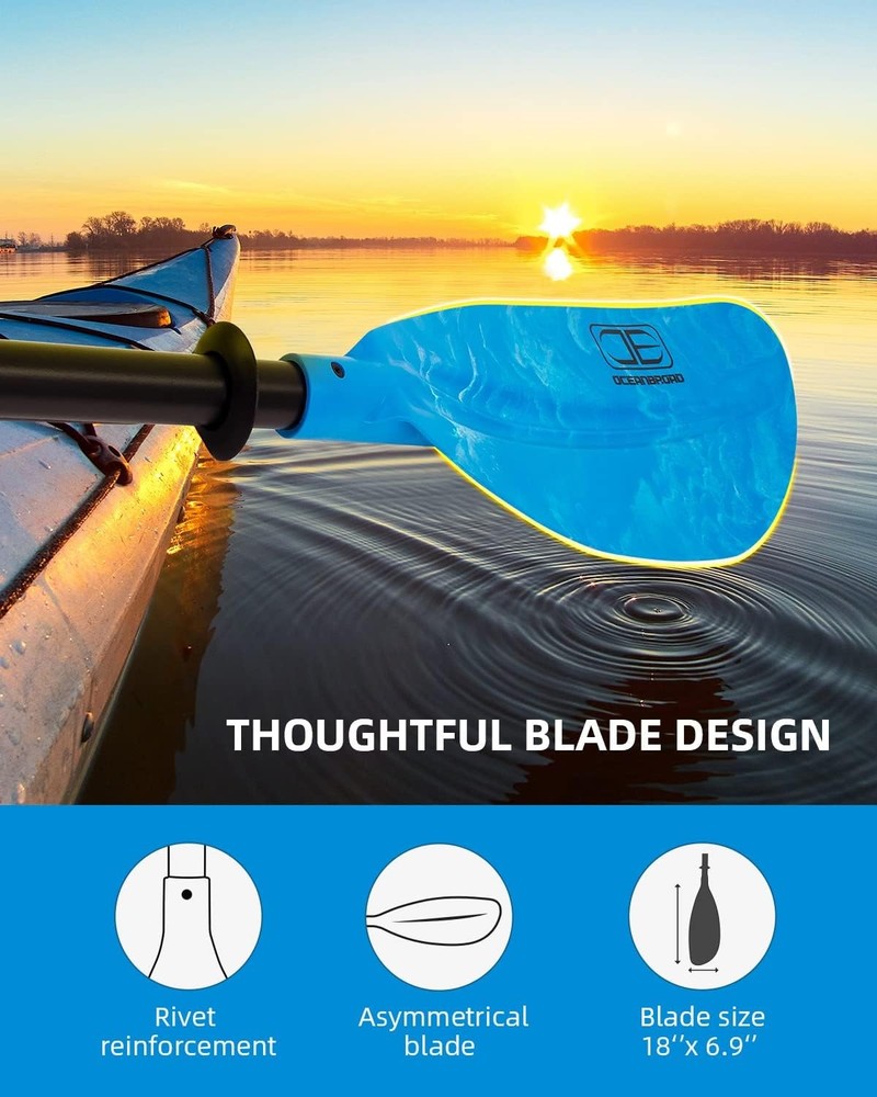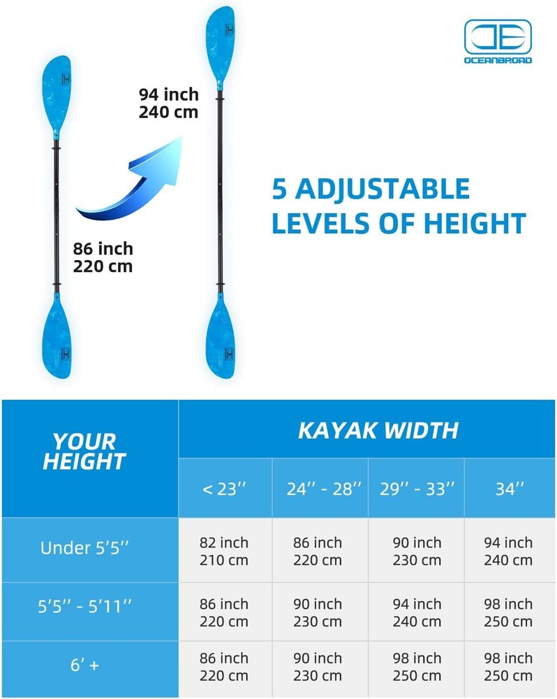 OCEANBROAD Adjustable Kayak Paddle 86in/220cm To 94in/240cm, Blue Product Details Item Package Dimensions L x W x H: 43 x 8 x 2 inches Package Weight: 1.18 Kilograms Brand Name: OCEANBROAD Color: Blue Suggested Users: unisex Number of Items: 1 Manufacturer: OCEANBROAD Part Number: OKA1908PL05ADBL Style: Blue 86-94 inch Size: 86in/220cm To 94in/240cm Sport Type: Kayaking MADE TO LAST: This kayak paddle is with high-quality aluminum alloy shaft (1.1mm shell thickness) and fiberglass reinforced PP blade. The material combination ensures a stiff and made to last kayak paddle at a better price. It’s a perfect choice for starters and intermediate kayakers. AFFORDABLE: The UV-stable PP blade ensures a stiff and made to last kayak paddle at a better price. With the alloy kayak shaft, it’s an awesome combination of durability and value. ADJUSTABLE WITH 5 LENGTH CHOICES: 220CM(87 inches) / 225CM(89 inches) / 230CM(90 inches) / 235CM(92 inches) / 240CM(94 inches) . It’s also detachable at 3 sections with longest one at 112CM(44 inches). It's very convenient to carry it around and put it away. LEASH/3 ANGLES/ DRIP RINGS: All OCEANBROAD kayak paddles come with a bungee paddle leash. It helps secure your paddle to your kayak, especially when you want to lay down the oars, stop by a little bit to enjoy great views around. The paddle is with 3 locking positions for different kayaking angle preference. The drip rings at two ends help stop water flowing from the blades. So, the shaft and your hands won’t get wet easily. The OCEANBROAD alloy kayak paddle is made of high-quality aluminum alloy shaft (1.1mm shell thickness) and fiberglass reinforced PP blade. It’s with popular medium length of 230cm (90.5 inches). The oar is a perfect choice for kayaking with touring or recreational purposes. It’s detachable at 2 sections, very convenient to carry it around and put it away. It’s an ideal kayak paddle with moderate length for you and your family.
