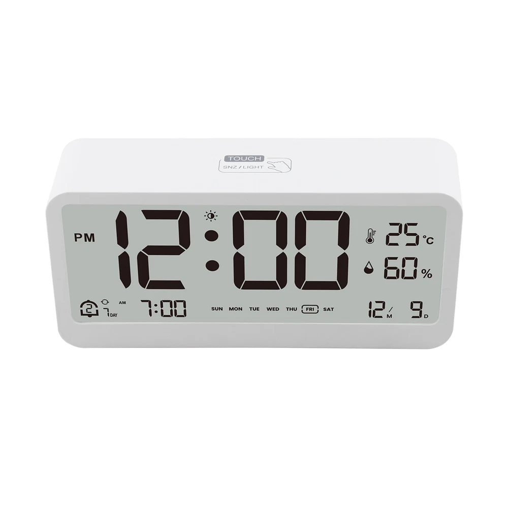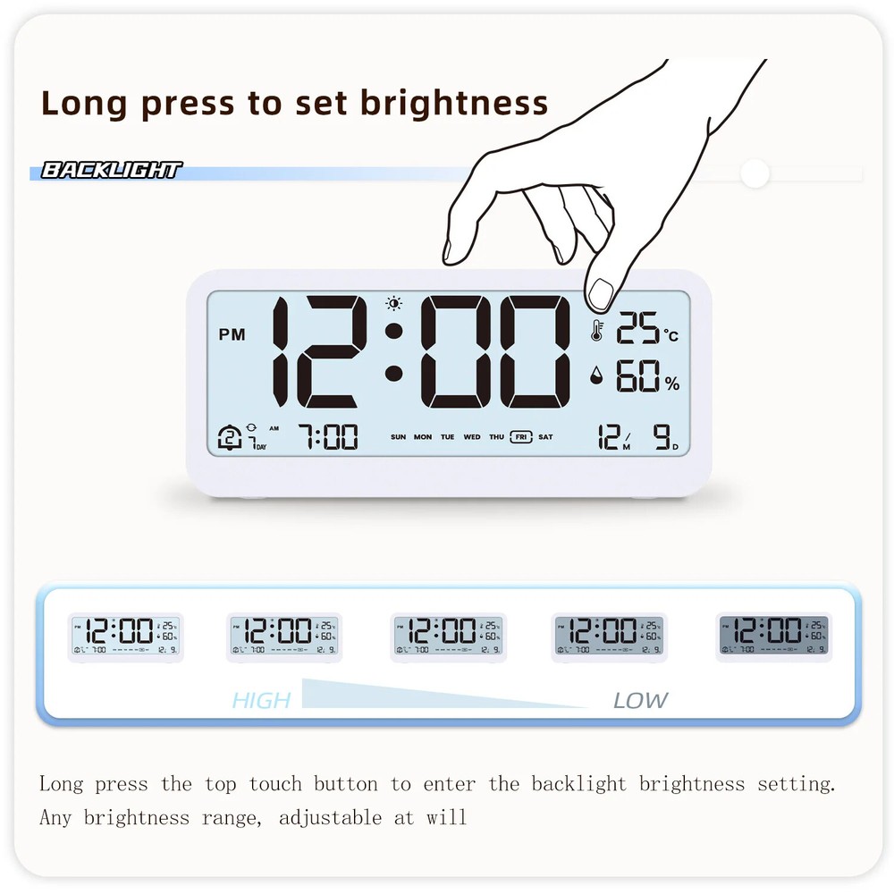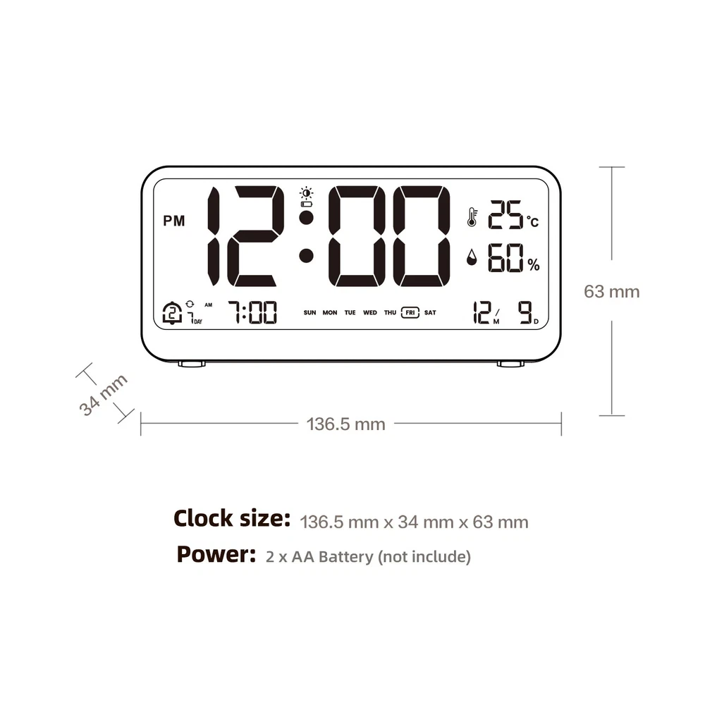 Features: 【Large LED Display】Simple and stylish with large LED display, which can shows the time, temperature and humidity. One click easy switching between 12/24 hour time formats. Super easy-to-read digital wall clock from anywhere in the room with huge clear numbers and is senior-friendly too. Ideal for use in the living room, bedroom, warehouse, garage, store, farmhouse, office, etc. 【Temperature And Humidity Meter】Built-in high precise temperature and humidity sensor, it can monitor the indoor temperature and humidity accurately, is not only a clock, but also a indoor thermometer for your bedroom. 【Dual Alarms & Snooze Supported】Built-in dual alarms, with three alarm time modes, you can set the 5-day alarm/6-day alarm /7-day alarm for the corresponding alarm. In addition, the led desk clock is designed with a big snooze button on the top, which can help you easily turn off the alarm without opening your eyes, and get an extra 5 mins of sleep time (Snooze can only reactivate up to 3 times). 【Gradual Ringtone】When the alarm goes off, the sound is soft and soothing at first, then gradually louder to prevent you from being woken up by a sudden loud noise. With 4 volume levels, it's about 79dB at most. 【Dimmable】 LED stepless backlight adjustment, long press the top touch button to enter the backlight brightness setting. Any brightness range can be adjusted at will. If you think that the LED screen is too bright, you can activate the night lighting mode, The soft brightness will not make you feel dazzling and affect your sleep. 【Low Battery Indicator Function】If you find that the digits were getting weaker, the backlight brightness is more lower. The reason may be that the battery power of the product has started to decline. You can replace batteries to get a better display. When the battery level is low, the corresponding icon will be displayed on the screen, indicating the need to replace the battery. 【Great Gift Choice for Loved Ones】Designed to be practical and stylish, this alarm clock with light is perfect for aesthetic room decor. And the versatility and beautiful appearance make it an ideal gift for Christmas, Easter, Halloween, New Year, Valentine's Day, Thanksgiving, birthdays, anniversaries, Children's Day, Mother's Day, Father's Day, etc. It is also the great holiday gift for teenager girls boys, kids, friends, loved ones and family. Specifications: Perpetual Calendar: Up to Year 2099 Time Format: 12/24 HR Format Date Display: Week & Date & Month Feature: Dual Alarms & Repetition day Function: Snooze Function (5 min or OFF) Unit: Temperature Alternatively in °C or °F. Temperature Measurable Range: -9°C~50°C /15.8°F ~ 122°F Humidity Measurable Range: 10%RH ~ 95%RH Backlight Adjustment:Detailed brightness control with touch button Advantage: Light-at-Night Mode Battery: 2 x LR6 AA 1.5V Material: ABS Item Size: 13.6 * 6.3 * 3.4 cm / 5.35 * 2.48 * 1.34 inch Item Weight: 135g / 4.76oz Package Size: 14.8 * 8 * 5 cm / 5.83 * 3.15 * 1.97 inch Package Weight: 172g / 6.07oz Package List: 1 * Temperature and Humidity Clock 1 * User Manual (EN/DE/FR/IT/ES)