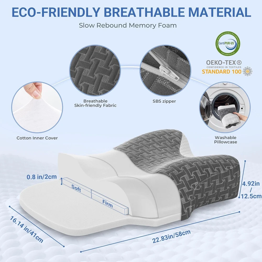 CPAP Pillow Compatible with Various CPAP Masks: This pillow for cpap is suitable for nasal, or other types of CPAP masks. Features cutouts on both sides designed to help manage CPAP equipment and tubing, minimize air leaks, and ease facial pressure from the mask while supporting natural spine alignment. A pillow suitable for CPAP nasal pillow can assist in reducing facial discomfort, prevent tubing entanglement, and decrease night time disturbances Ergonomic Design: This cervical pillow features distinct sleep zones tailored to the shapes of the neck and shoulders for optimal support. The Cpap side sleeper pillow helps maintain spinal alignment and alleviates discomfort in the neck, head, and shoulders during sleep. The central hollow section cradles the head, aiding in muscle relaxation and blood circulation. It may take 1-2 weeks for your neck to adjust to the pillow’s ergonomic curve FOUR Adjustable Height: CPAP neck pillow measures 22.83 inch (H) X 16.14 inch (W) X 4.92inch (H). You can choose the height that suits you. Rotate cervical cpap pillow to get 2 different heights. In addition, the removable 0.79 inch base piece offers more height options. Remove the insert at the bottom, the heights of the cpap nose pillow become 3.3/2.4 inch ADJUSTABLE SUPPORT: Pillows for sleep apnea feature two interchangeable memory foam inserts. You can choose the appropriate shims to replace according to your preferred softness or firmness. You can select the appropriate insert to ensure adequate neck and head support, fostering a comfortable sleep experience. Whether you sleep on your side, back, or stomach, tailor the sleep apnea pillow's balance of support and comfort to suit your individual preferences Premium Memory Foam Neck Pillow: Made with CertiPUR-US certified high-density memory foam that gently slow rebounds. The shape and firmness of this anti-snoring pillow remains stable over time. The rebound time typically takes 48-72 hours. The nasal pillows for cpap’ pillowcase with a breathable fibre surface provides a cool, dry sleep. Removable, washable cover for easy cleaning New Upgraded Insert: The cpap friendly pillow’ inserts have been fully upgraded, all now white with less coloring and impurities. Memory foam has a mild scent, which will dissipate in 3-5 days. Please note that this memory foam pillow is not intended for medical use. If you have serious cervical issues, consult a doctor before use If you require a higher pillow to meet your sleeping needs, please reach out to us to receive an additional 0.8-inch thick insert. And if you seek a softer or firmer feel, we'd be happy to provide you with softer or firmer small inserts upon request