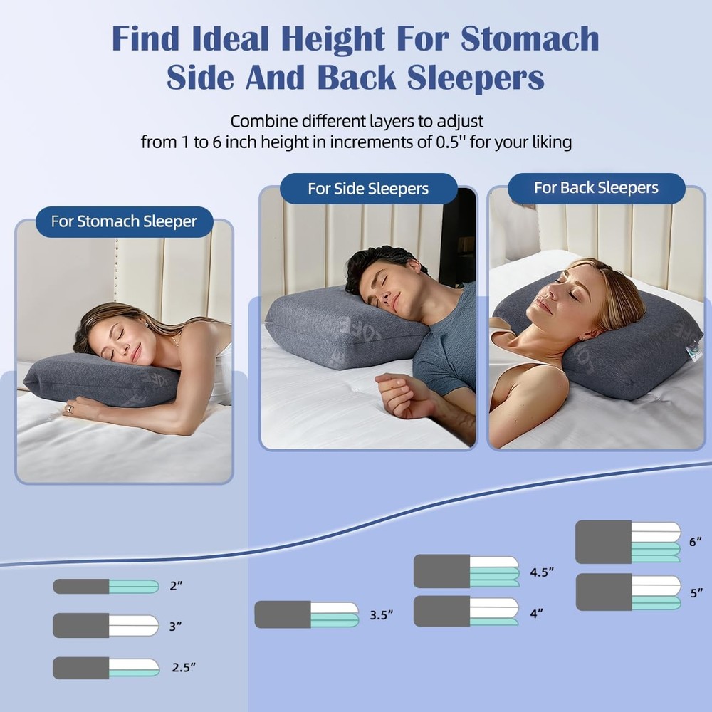 WHY WE CHOOSE TWO DIFFERENT MEMORY FOAM - LET YOU ADJUST SOFTNESS TO ACHIEVE THE IDEAL SUPPORT: Are you worried that the pillow’s softness is always not suitable for you ? Don’t worry! adjustable memory foam pillow can help you solve it. The adjustable pillow for neck pain relief features 2 layers of 1.5'' ultra soft white memory foam and 3 layers of 1'' medium firm blue memory foam. When you lie down, the ultra soft memory foam quickly cradles your head and neck. And the medium firm memory foam is aimed to provide superior support, your head will not collapse when sleeping. Try to adjust the different combinations of layers for different softness to achieve the ideal support you want. 🎈WHY WE CHOOSE TWO DIFFERENT MEMORY FOAM - LET YOU ADJUST SOFTNESS TO ACHIEVE THE IDEAL SUPPORT: Are you worried that the pillow’s softness is always not suitable for you ? Don’t worry! adjustable memory foam pillow can help you solve it. The adjustable memory foam pillow features 2 layers of 1.5'' ultra soft white memory foam and 3 layers of 1'' medium firm blue memory foam. When you lie down, the ultra soft memory foam quickly cradles your head and neck. And the medium firm memory foam is aimed to provide superior support, your head will not collapse when sleeping. Try to adjust the different combinations of layers for different softness to achieve the ideal support you want. 👑FIND IDEAL HEIGHT FOR STOMACH, SIDE AND BACK SLEEPERS: Did you wake up with neck pain or have difficulty falling asleep because of the pain? Your pillow’s height is not suitable for you! adjustable memory foam pillow for neck pain relief has 5 different layers, which can be combined into 10 different heights from 1’’ to 6’’ increments of 0.5'' . So you have the freedom to adjust these 5 thin pillows to find the suitable height for you, helping your spine stay aligned, relaxing your neck and relieving your neck pain. 🍂CERTIPUR-US MEMORY FOAM KEEPS SHAPE FOR NO DEFORM AND CLUMP: Unlike pillows filled with alternative down or shredded memory foam, easy lose its shape, the adjustable memory foam pillow made of CertiPUR-US memory foam can slowly bounce back to its original shape and keep its shape for a long time use, not prone to deform and clump. What’s more, you just need to add or remove the adjustable memory foam pillow’s layer to your ideal height, which is very clean, simple and convenient. Say goodbye to mess adjustments! 🐕BREATHABLE AND MACHINE WASHABLE PILLOWCASE FOR DAILY CLEAN: The adjustable memory foam pillows contain a removable and machine washable pillowcase (60% polyester, 40% rayon of bamboo) .This super soft material is very breathable, wicking moisture away from the skin and resisting odor. adjustable memory foam pillow for neck pain relief has ventilation holes to help alleviate excessive heat build-up. 🌟INNER PILLOWCASE FOR LONGER SERVICE LIFE: Each thin pillow is equipped with an inner pillowcase, which can protect the memory foam from being torn while adjusting the memory foam pillow. It is very convenient to adjust the pillow for neck pain relief with the inner case. It can prevent memory foam layers from sticking together. 🍭- LOVE LIFE, LOVE SLEEP: The brand is originated from the meaning of LOVE LIFE. Bring adjustable memory foam pillow to home, let you LOVE SLEEP. We are a small company specializing in the development of pillows, such as buchwheat pillow, kid pillow, organic pillow and so on. Our factory has been producing a number of pillows for more than 20 years. We always start with what our customers want and find a way to meet their needs. We try our best to develop adjustable memory foam pillow through 1000+ tests. If any issues with your adjustable memory foam pillow, our friendly customer service team is always ready to help. It is our priority for your satisfaction!