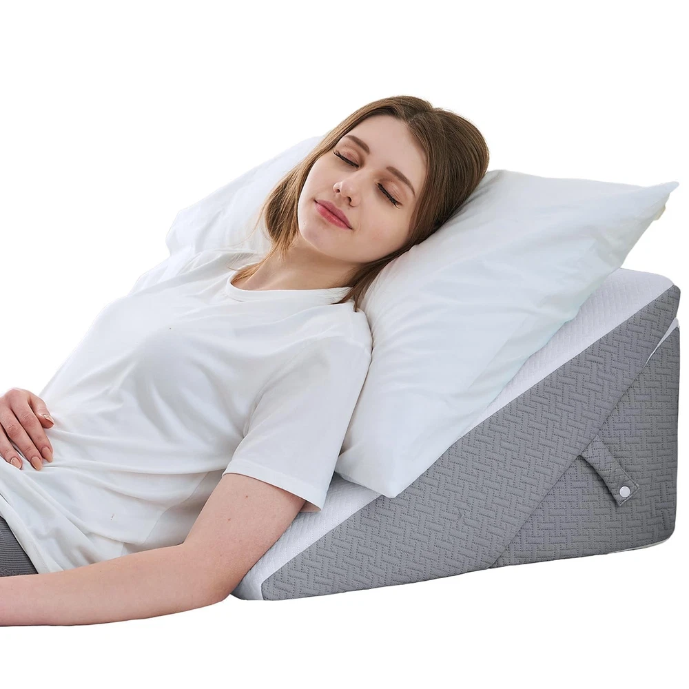 The wedge pillow features a top layer of 40D slow-rebound memory foam and a supportive bottom layer of 25D high-density foam. This design makes our pillow wedge provide personalized support while maintaining its shape over time. This wedge pillow features a snap button, which allows you to adjust the height from 12'' to 9''. The bed wedge pillow could diverse body pains, from post-abdominal surgery to respiratory and digestive issues, neck, back, and shoulder pain, knee discomfort, leg swelling, and even pregnancy care. Designed with a wide-open zip closure, our wedge pillow for sleeping can be removed easily. The removable pillowcase of this wedge pillow allows for convenient machine washing, ensuring convenient maintenance. For shipping purposes, this adjustable wedge pillow is vacuum-packaged. Upon opening the package, please allow 24-48 hours for the triangle pillow to expand to its original shape Premium Memory Foam: The wedge pillow features a 40D slow-rebound memory foam top layer and a supportive 25D high-density foam bottom layer. This design makes our pillow wedge provide personalized support while maintaining its shape over time 7-in-1 Adjustable Design: This wedge pillow features a snap button, which allows you to adjust the height from 12'' to 9''. This 7-in-1 adjustable wedge pillow could provide you with versatile comfort and meet your different needs Multifunctional Wedge Pillow: The bed wedge pillow could reduce diverse body pains, from post-abdominal surgery to respiratory and digestive issues, neck, back, and shoulder pain, knee discomfort, leg swelling, and even pregnancy care Easy to Care: Designed with a wide-open zip closure, our wedge pillow for sleeping can be removed easily. The removable pillowcase of this knee wedge pillow allows for convenient machine washing, ensuring convenient maintenance About : We are dedicated to enhancing your comfort and health with thoughtfully designed wedge pillows. For optimal experience, we recommend airing the pillow in a well-ventilated area for 48 hours before use.