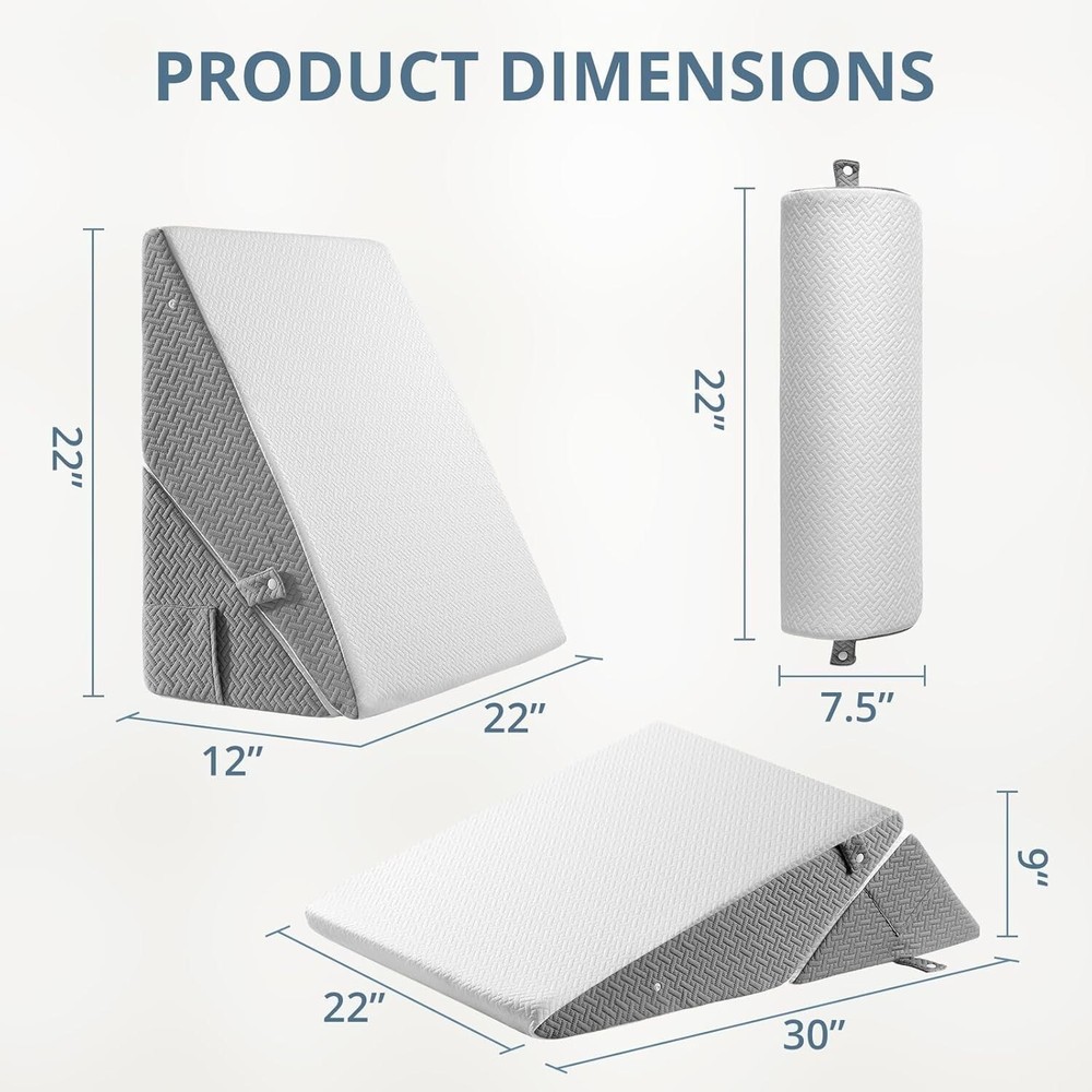 Wedge Pillow for Headboard, Adjustable Bed Wedge Pillow Set with Orthope Multi-Position Wedge Pillow with Adjustable Support ✔ Versatile 10-in-1 Design - Adjustable height options accommodate different positions. Includes removable bolster for customizable support. ✔ High-Quality Construction - Features slow-rebound top layer and firm base for lasting comfort. OEKO-TEX certified materials. ✔ Comfortable & Convenient - Breathable air layer fabric cover with L-shaped zipper for easy removal and cleaning. Includes handy storage pockets. ✔ Multi-Purpose Use - Suitable for reading, relaxing, or elevating various body positions. Product Details: Dimensions: [insert size] Color: [insert color] Cover: Machine washable Base material: High-density foam