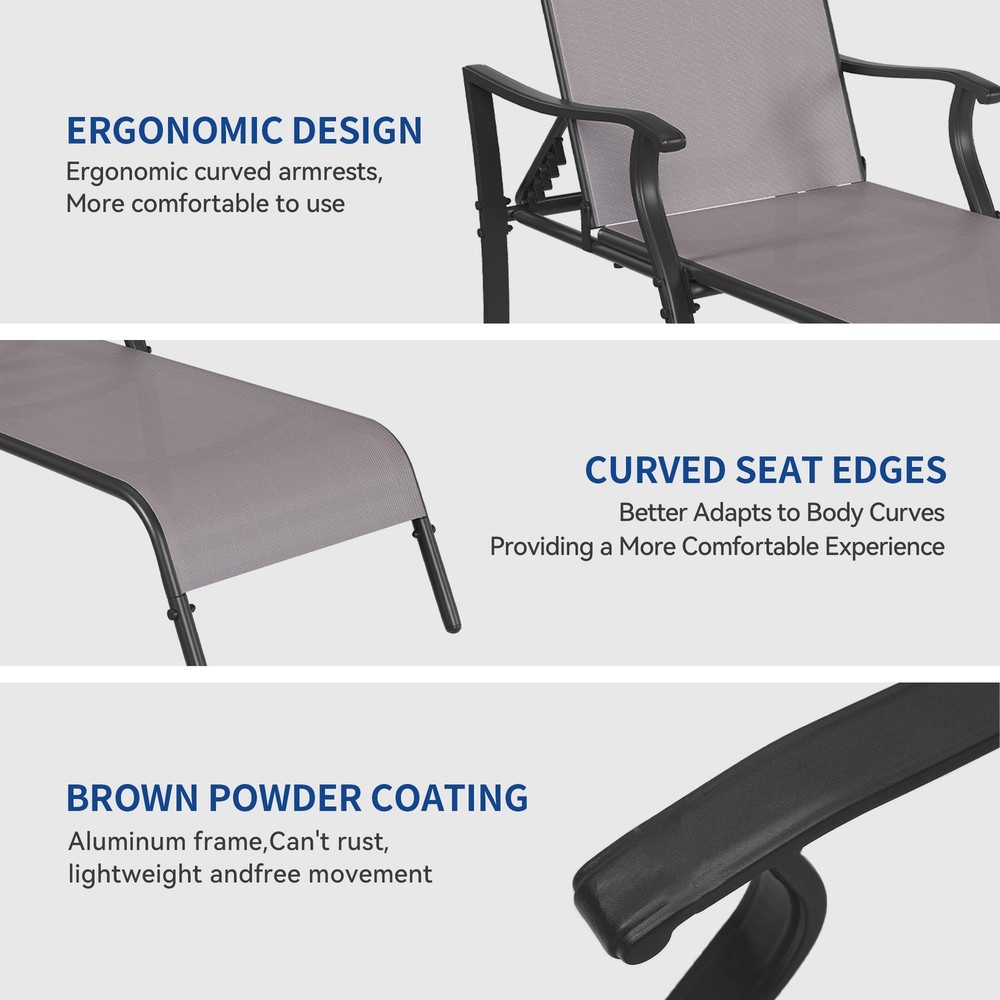 Weather-Resistant Textile Fabric: Our chaise lounge chairs are upholstered in high-quality, weather-resistant textile fabric that effectively withstands erosion from sunlight and rain. The breathable material ensures cool and comfortable relaxation, making it perfect for hot summer days.Features Rustproof Aluminum Frame: The outdoor chaise lounge chairs feature sturdy aluminum frames coated with anti-rust paint for durability and stability. Each chair is capable of providing reliable support for up to 330 pounds, ensuring a secure seating option for outdoor lounging.Sleek Coffee Table: The chaise lounge set comes complete with a stylish coffee table that offers both convenience and aesthetic appeal. Use it to place your drinks, snacks, or decorations while enjoying the comfort of the Free Shipping Over $49.99* Details Outdoor Recliner With Side Table And 5 Adjustable Positions (Set Of 2) - N/A Product Description: Weather-Resistant Textile FabricOur chaise lounge chairs are upholstered in high-quality, weather-resistant textile fabric that effectively withstands erosion from sunlight and rain. The breathable material ensures cool and comfortable relaxation, making it perfect for hot summer days. Features Rustproof Aluminum FrameThe outdoor chaise lounge chairs feature sturdy aluminum frames coated with anti-rust paint for durability and stability. Each chair is capable of providing reliable support for up to 330 pounds, ensuring a secure seating option for outdoor lounging. Sleek Coffee TableThe chaise lounge set comes complete with a stylish coffee table that offers both convenience and aesthetic appeal. Use it to place your drinks, snacks, or decorations while enjoying the comfort of the loungers. The set is perfect for various outdoor settings such as yards, balconies, and patios. DimensionsThe package includes two outdoor lounge chairs, each measuring 77.56''L x 25.98''W x 37.4''H, and a side table with dimensions of 15.75''L x 15.75''W x 16.93''H. With simple, easy-to-follow instructions included, assembly is quick and hassle-free, allowing you to start enjoying your outdoor relaxation space in no time.