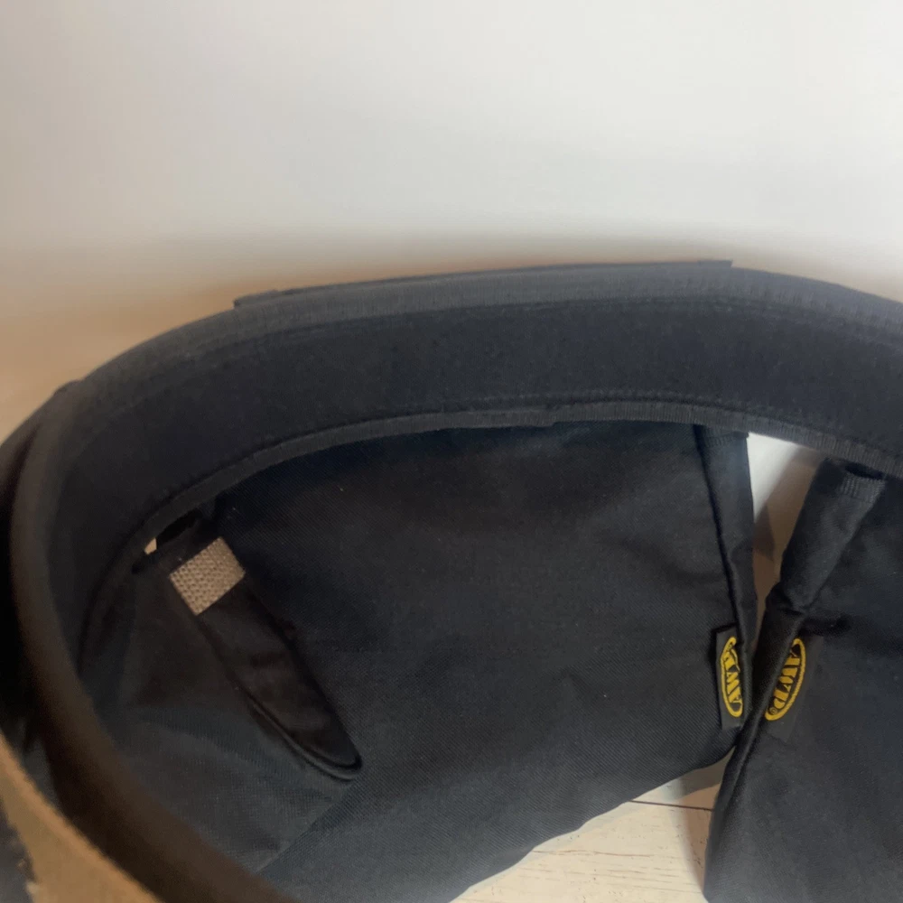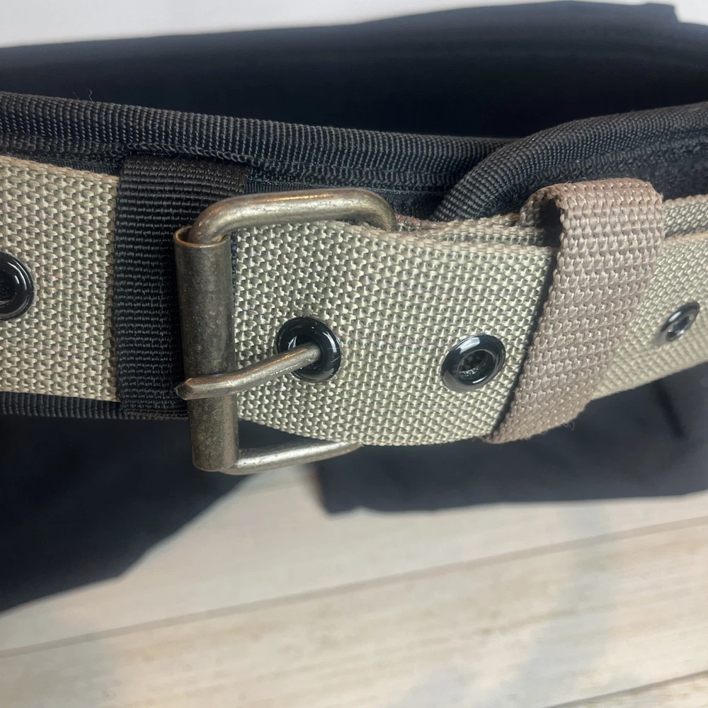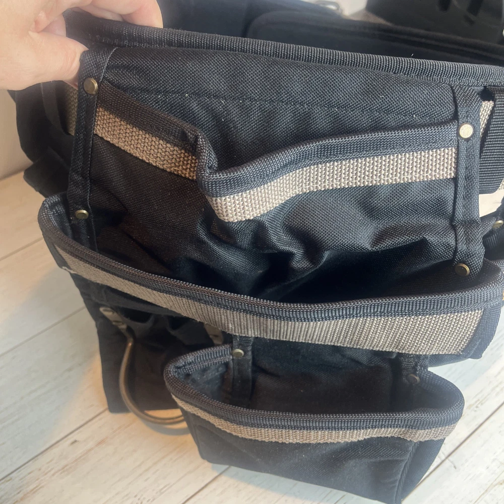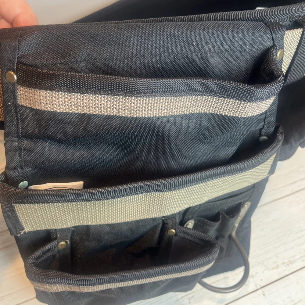 AWP General Construction Carpenter Tool Rig Padded Adjustable Tool Belt 44β This Carpenter tool rig was used briefly by my nephew until he was provided one from his solar installation job. It includes a nylon web belt that has grommets out to 49 inches but the interior hook and loop closure part of the belt probably expands comfortably to 44 inches to allow hook and loop overlap. Includes two large pouches with three pockets each, a hammer hanger, and two spaces for pencils or pens, and one all purpose, smaller pouch as shown. Pet and smoke free home