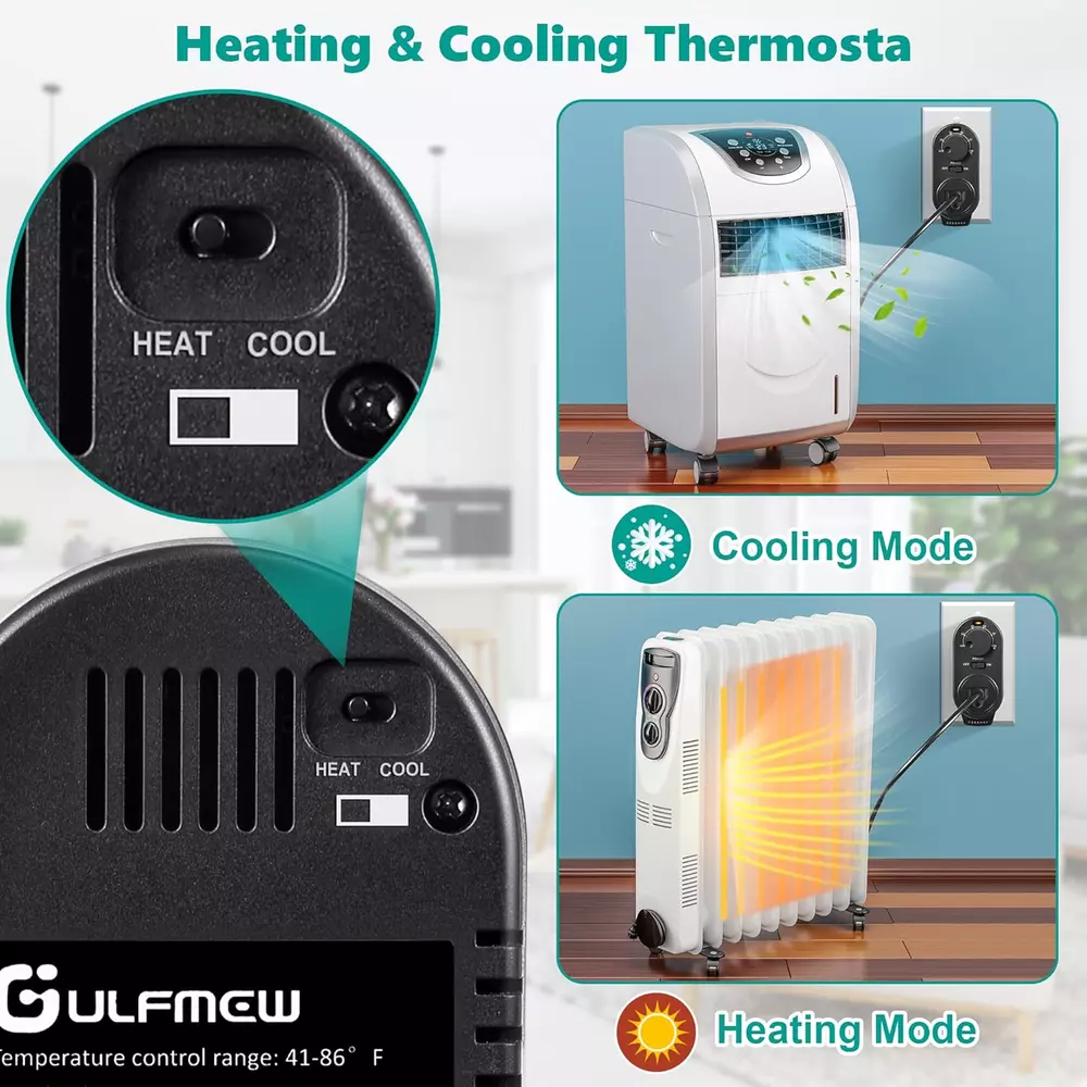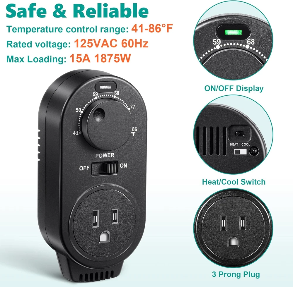Thermostat Control: this non digital plugin thermostat comes with an adjustable temperature dial; Provide heat and cool 2 modes for you to choose, the thermostat will automatically turn on or off your heating or cooling equipment according to the target temperature you set, you can set the appropriate temperature (41-86 degrees Fahrenheit), maintain a stable room temperature for your greater comfort; Warm tips: please disconnect the power supply before switching the heat or cool mode Easy to Operate: plug and play design; No need to use other tools, just open the heat or cool mode button manually; Plug your heating or cooling device into the thermostat outlet, turn POWER switch to On and you're ready to go; Just set your ideal temperature, the scale is clear, even the elderly can simply operate it; The LED light let you easily see if it is on or off too Safe and Reliable: this 3 prong thermostat plug into a standard socket is ETL listed; Temperature control range is 41-86°F; Rated voltage is 125VAC 60Hz; Max Loading: 15A 1875W and has a recoverable overload short circuit; Dimensions: 5 x 2.5 x 2.5 inches; Do not immerse controller or probe into water Save Your Time: the thermostat will make your life comfortable; The adjustable thermostat turns on and off appliances connected to outlet based on the target temperature; It uses power only when necessary, brings convenience to your life Wide Usage: suitable for most portable space heaters, window air conditioners and circulating fans; Can also be applied for greenhouse, reptiles breeding, pet feeding, wine cellar, swamp cooler, evaporative cooler, electric fireplace heater, garage, RV and so on Product Description Specifications: Quantity: 1 piece Dimensions: 5 x 2.3 x 1.5 inches Input: 125VAC 60Hz Load (max): 125VAC@15A 1875W -- resistive load 1/2HP@125VAC, TV-5 -- inductive load Temperature control range: 41-86 °F Note: It cannot be controlled remotely, it is manually adjusted. Package includes: 1 x Plug in heating and cooling thermostat