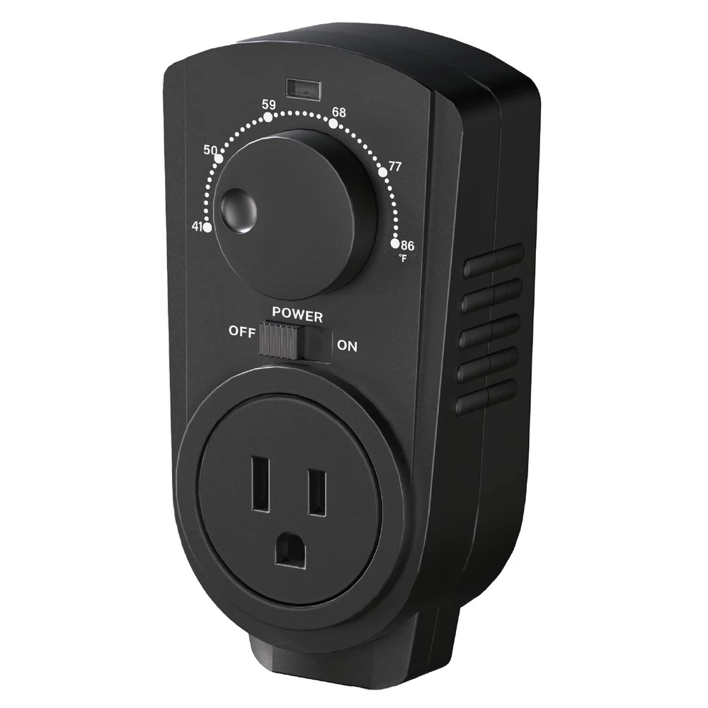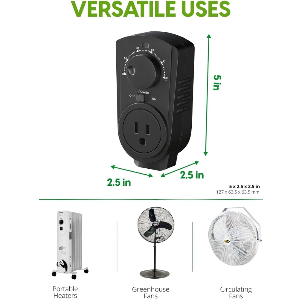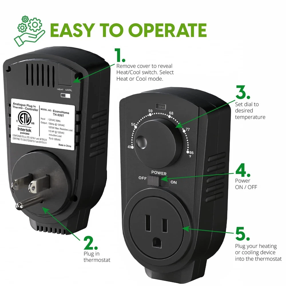 EASY TO OPERATE: Just plug in this adjustable thermostat, select heat / cool mode with the user-friendly switch and it will automatically turn on or off your heating or cooling devices through your preset target temperature. EFFORTLESS TEMPERATURE SETUP: This non-digital plugin thermostat comes with an adjustable temperature dial and the current temperature is displayed on the center for easy reference. Temperature control range is 41-86°F. SAVES YOU ON YOUR HOME ENERGY BILLS: You’re always a winner with this heating & cooling thermostat. It’s energy efficient while maintains a consistent ambient room temperature. VERSATILE USES: Suitable for most portable space heaters, air coolers, and circulating fans. Can also be used for refrigeration, fermentation, greenhouse fan and designed to suit almost any application you can imagine. SAFE & RELIABLE: This 3-Prong thermostat plug into a standard socket is ETL listed and rigorously tested for quality control and safety. Conforms to UL Std No. 60730-1, 60730-2-9. Voltage is 125VAC 60Hz, Max Loading: 15A 1875W and has a recoverable overload short circuit. Dimensions: 5” x 2.5” x 2.5”