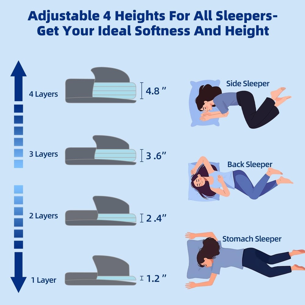 This pillow is a game-changer! The adjustable layers let me find the perfect height for my side-sleeping needs, and the memory foam offers just the right balance of softness and support. My neck pain has significantly improved since switching to this pillow—it’s comfortable, customizable, and stays cool all night. Highly recommend for anyone struggling with discomfort!