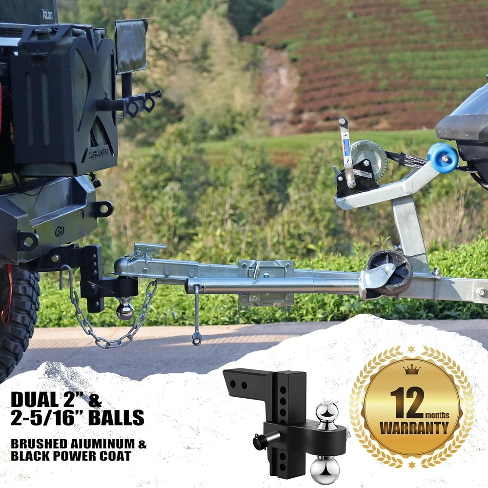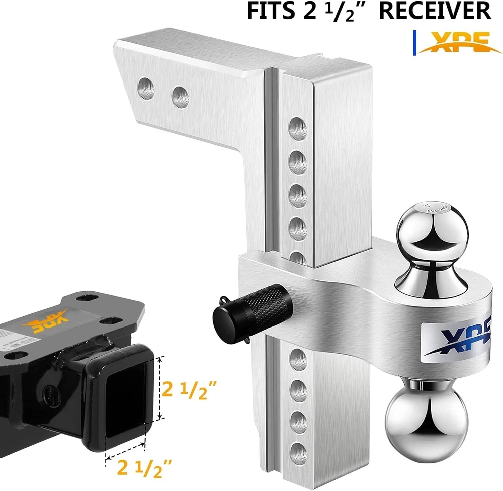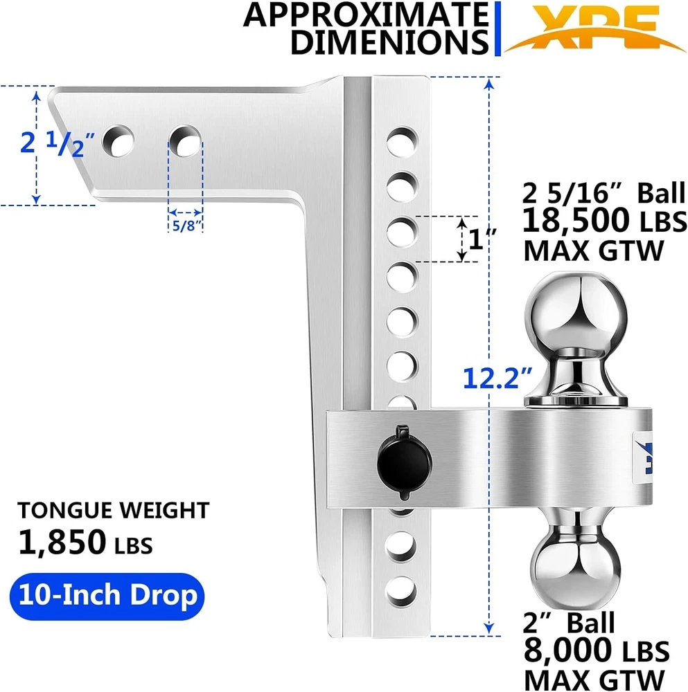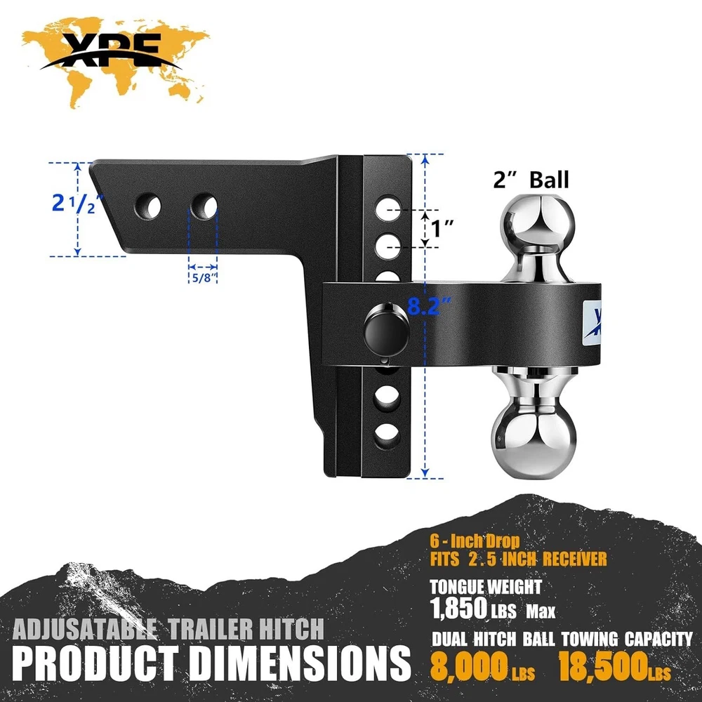 Item Description Material: Aluminum Ball Size: 2" and 2-5/16" Adjustable Height: 10" / 6"/ 8" Drop Distance (Adjusts in 1" Increments) Loading capacity: 2" Ball-8,000 LBS, 2-5/16" Ball -18,500 LBS Pin Hole Diameter: 5/8" Compatible with: Vehicles with 2.5 " Hitch Mounts Package Includes: Adjustable Steel Tailer Shank, Hitch Ball ( 2" And 2-5/16"), 2 Pin Lock