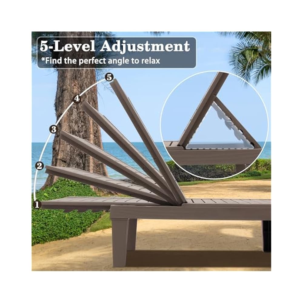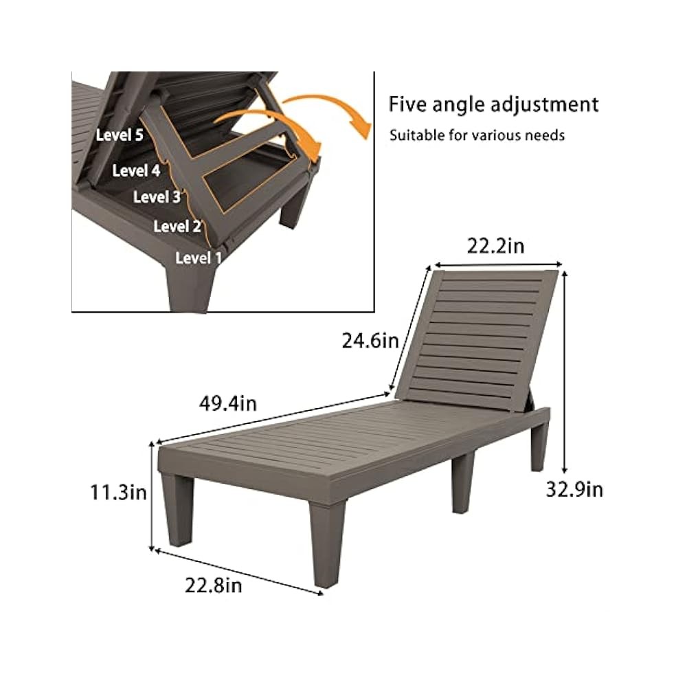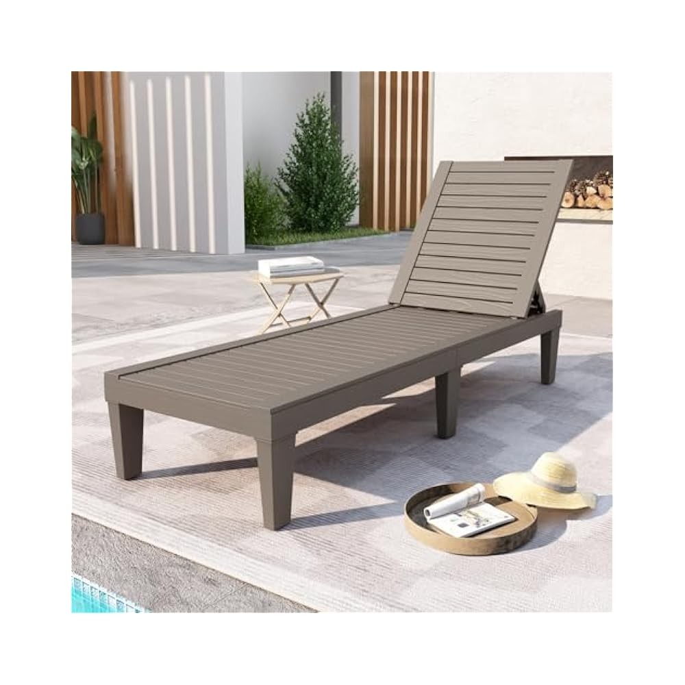 Style: Outdoor Seating Capacity: 1 Pattern: Solid Age Range (Description): Teen Surface Recommendation: Hard Floor Type: Reclining Lounger Is Customizable: No Reclining Position Count: 5 Frame Material: Resin Features: Recliner, Weather, Waterproof Size: 74D x 22.8W x 11.3H in Brand: DIMAR GARDEN Is Foldable: No Shape: Rectangular Recommended Uses For Product: Sunbathing gtin13: Does not apply Number of Items in Set: 1 Unit Count: 1.0 Count Furniture base movement: Glide Tilting: No Product Care Instructions: Wipe Clean UPC: Does not apply Product Dimensions: 74D x 22.8W x 11.3H Color: Taupe