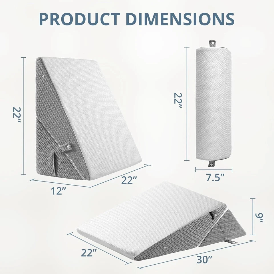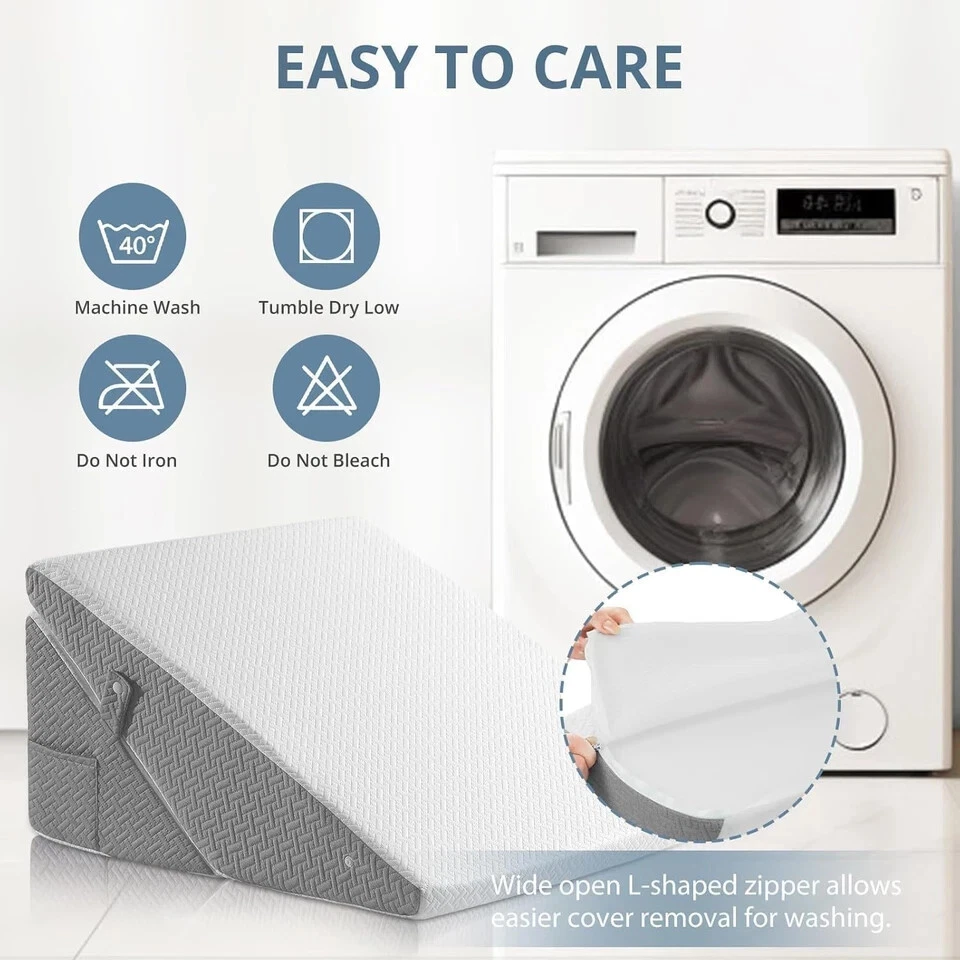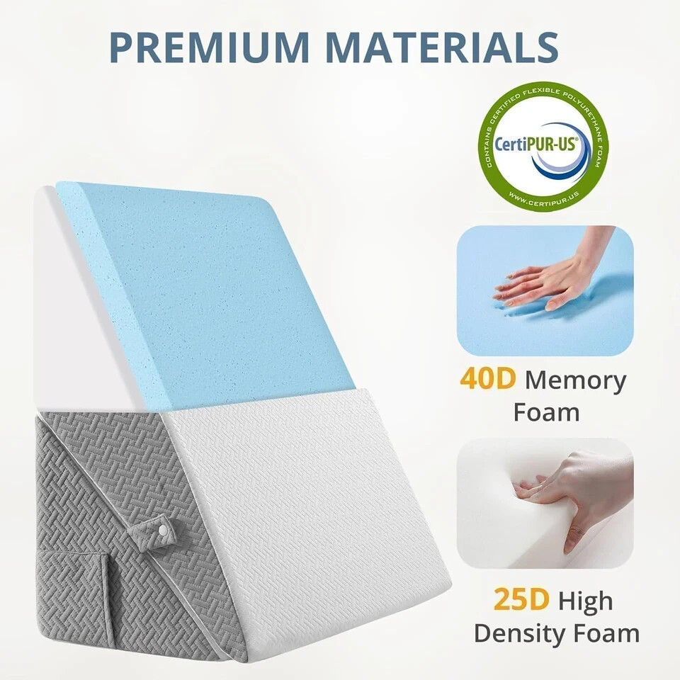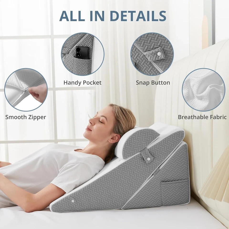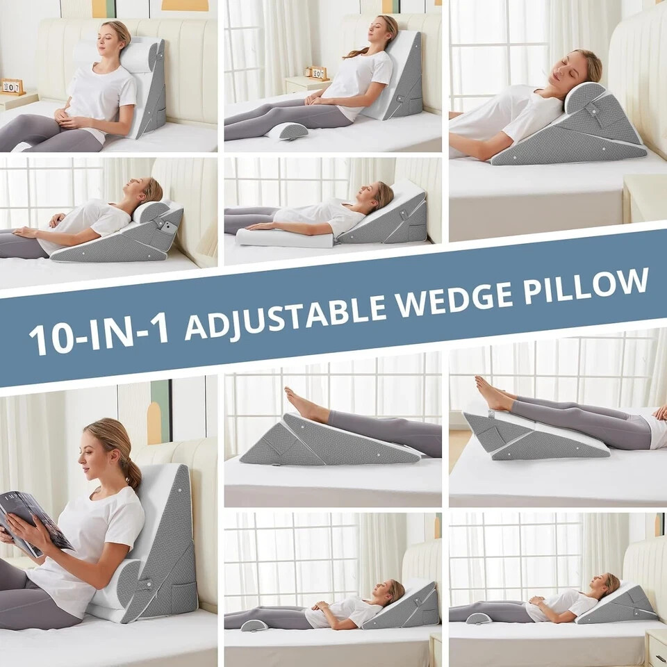 Sasttie Wedge Pillow for Headboard, Adjustable Bed Wedge Pillow Set with Orthope Item Description: 10-in-1 Design: The wedge pillow boasts a 10-in-1 design with adjustable heights to support your body in all positions. The bed wedge pillow also comes with a detachable bolster pillow for extra support wherever you need it Premium Material: Featuring a slow-rebound top layer and a high-density base, our wedge pillow conforms to your body's curves for enhanced comfort while maintaining its shape and durability. Certified by OEKO-TEX for safety, it ensures a healthier sleep experience Health Benefits: Our wedge pillow for sleeping helps reduce acid reflux, snoring, and heartburn through improved breathing and circulation. The triangle pillow wedge also helps ease back, neck, and leg discomfort, ideal for post-surgery recovery All in Details: The bed wedge cover is made of breathable air layer fabric, giving it a breathable and cozy feel. Designed with an L-shaped zip closure, the cover can be removed for washing easily. Handy pockets are designed for quick storage and access About SASTTIE: We are dedicated to enhancing your comfort and health with thoughtfully designed wedge pillows. Our products provide personalized support, and promote better posture and relaxation, helping you create a healthier and more restful lifestyle Fressnish Tips: If you notice a slight odor when you first unpack your wedge pillow, please do not worry. Just let it breathe for 24-48 hours in a well-ventilated area, and the smell will fade away, leaving you with a fresh and comfy pillow Sasttie Wedge Pillow for Headboard, Adjustable Bed Wedge Pillow Set with Orthope