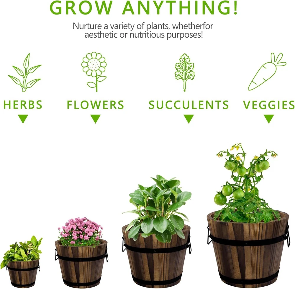Absolutely love these rustic whiskey barrel planters! The four different sizes are perfect for arranging small herbs, flowers, or succulents in a charming, cohesive look. The wood is sturdy and well-treated, so they hold up great both indoors and out. The natural weathered finish adds a cozy, vintage touch to any space. Super versatile—works on patios, shelves, or as a cute centerpiece. A fantastic buy for anyone who loves a rustic garden vibe!